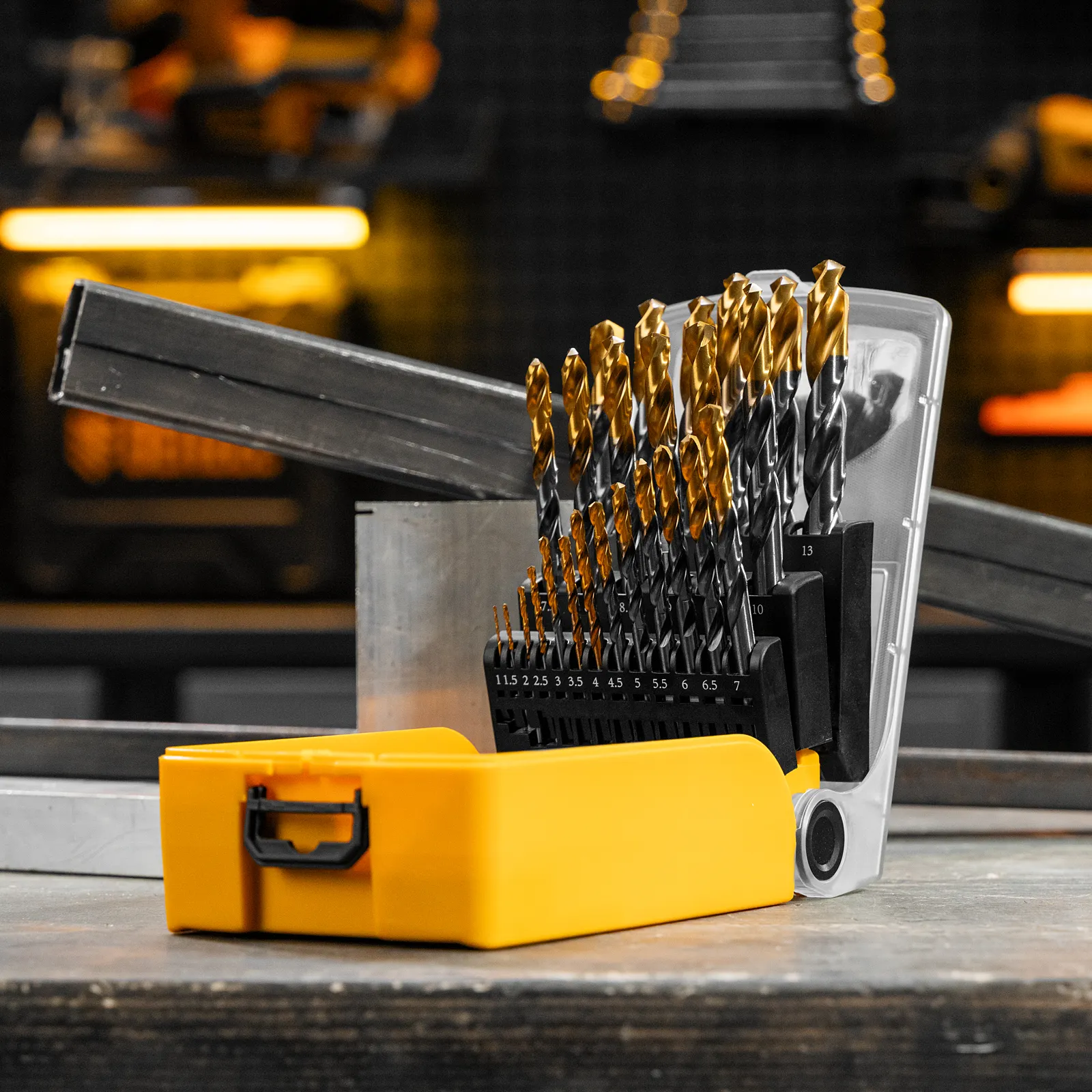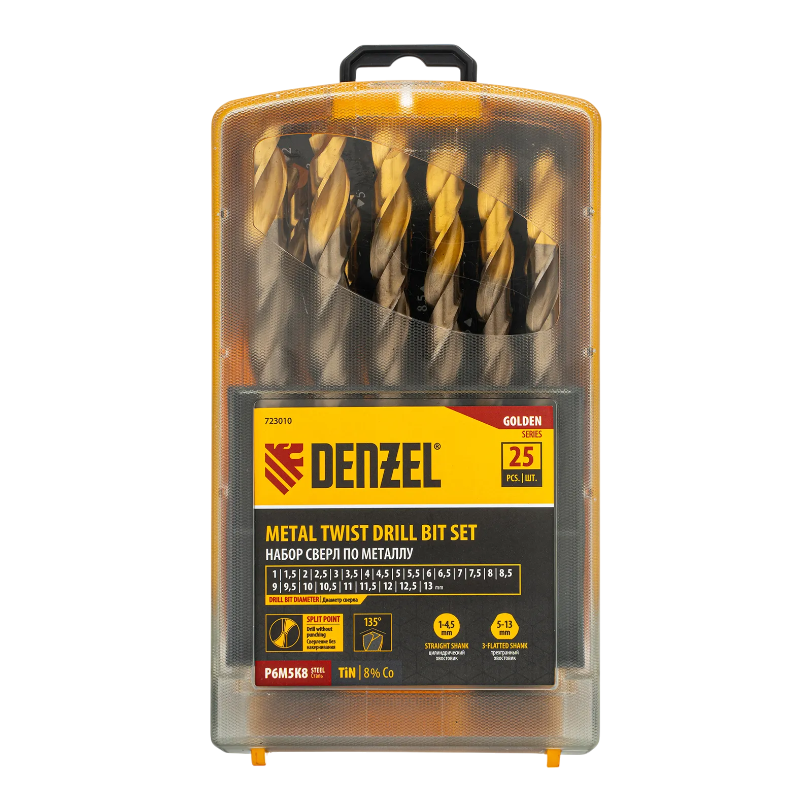 Набор Denzel Golden Tip 723010 состоит из 25 сверл по металлу диаметром 1-13 мм, изготовленных из стали P6M5K8. Угол заточки составляет 135°, что позволяет получать чистые и ровные отверстия в закаленной и нержавеющей стали, цветных и черных металлах, а также жестком пластике. Сверлам присвоен класс точности A1, что гарантирует высокое качество выполняемых работ. Оснастка характеризуется пониженным коэффициентом трения, что облегчает сверление и улучшает отвод стружки. Набор будет полезен дома и в мастерской.
