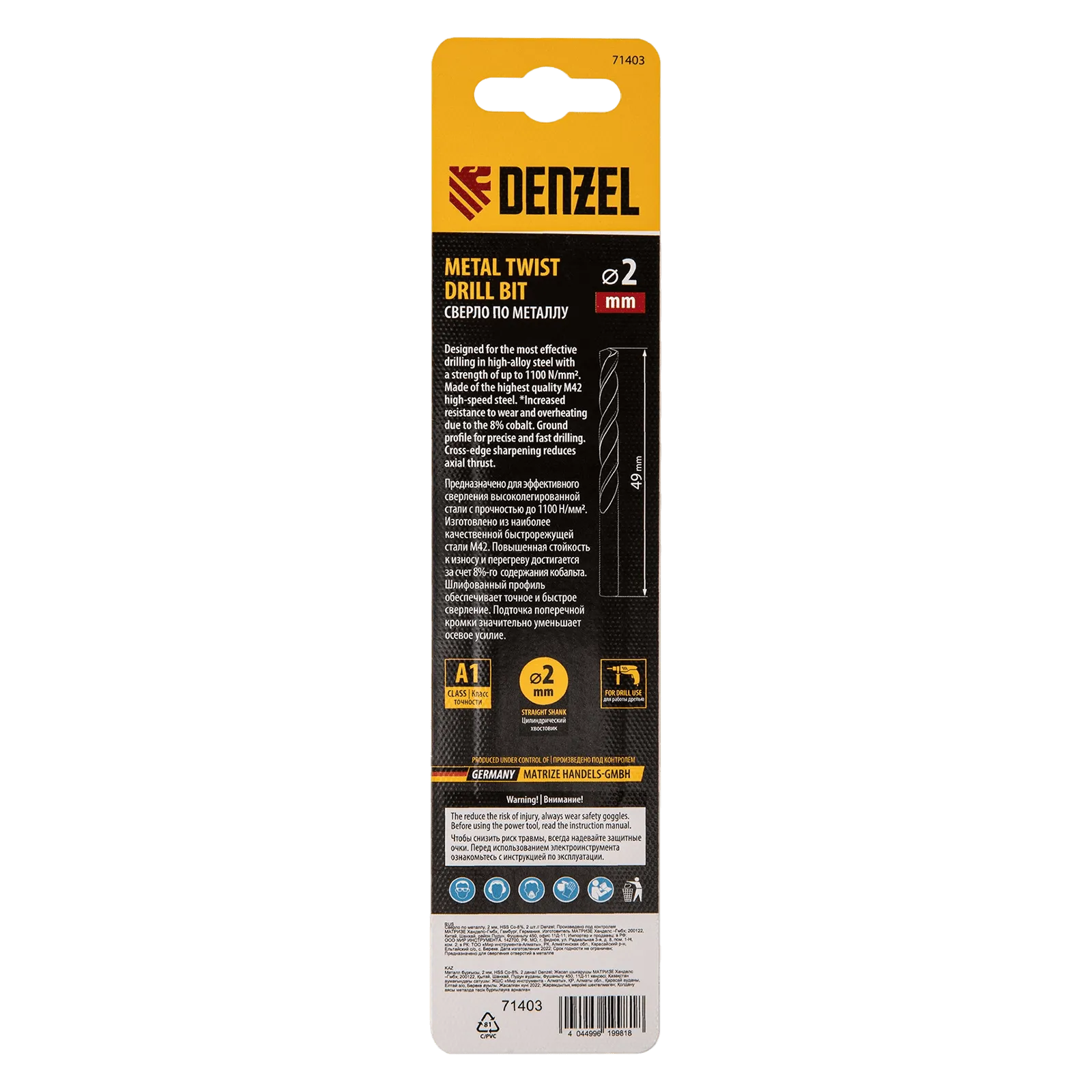 Кобальтовое сверло по металлу Denzel 71403 диаметром 2 мм, из стали HSS Co-8%, 2 шт. в упаковке, позволяет получать отверстия высокой точности в нержавеющей стали, цветных металлах, легированных и нелегированных сталях с пределом прочности до 1100 Н/мм2, а также в жестком пластике. Угол заточки 135° обеспечивает повышенную точность и чистоту сверления.
