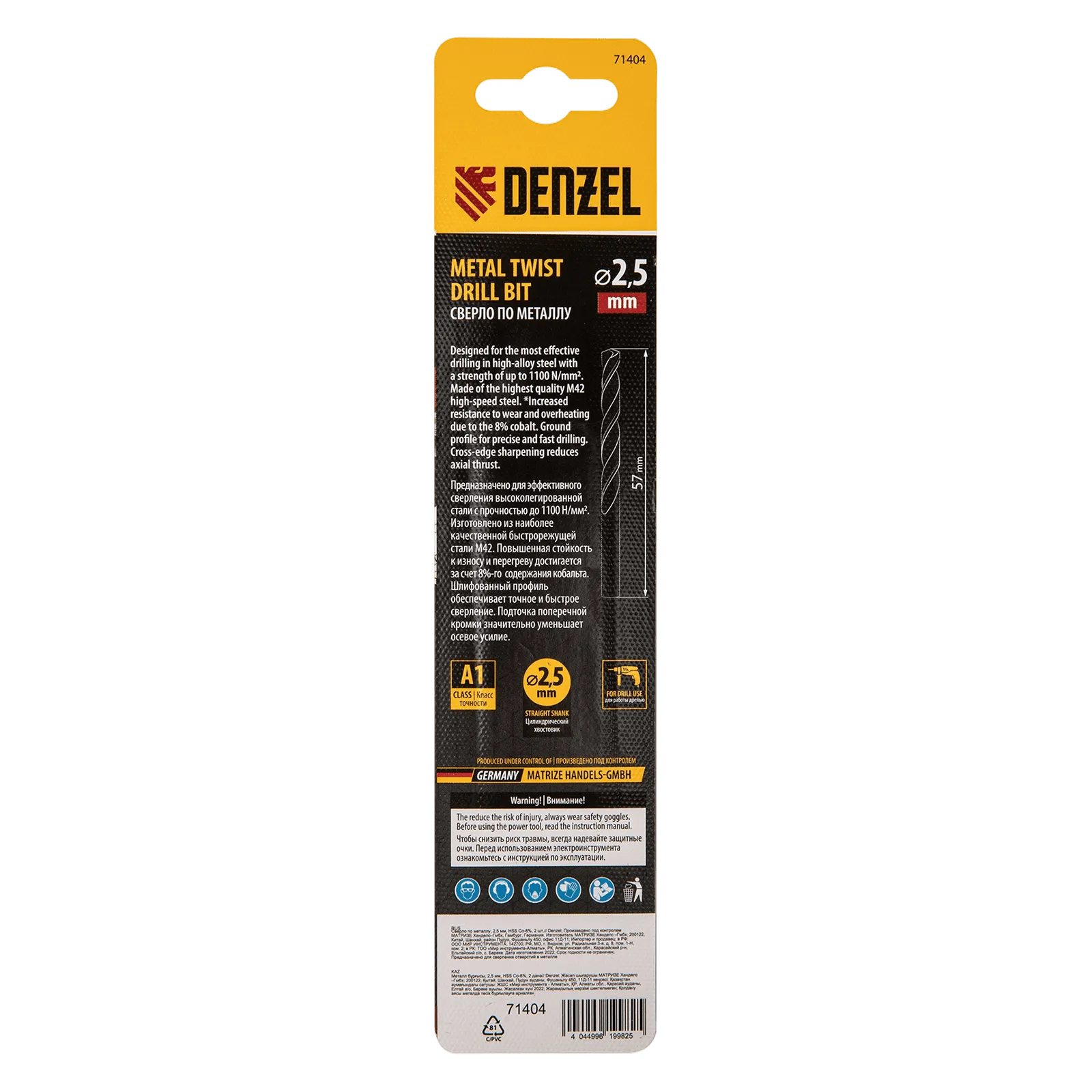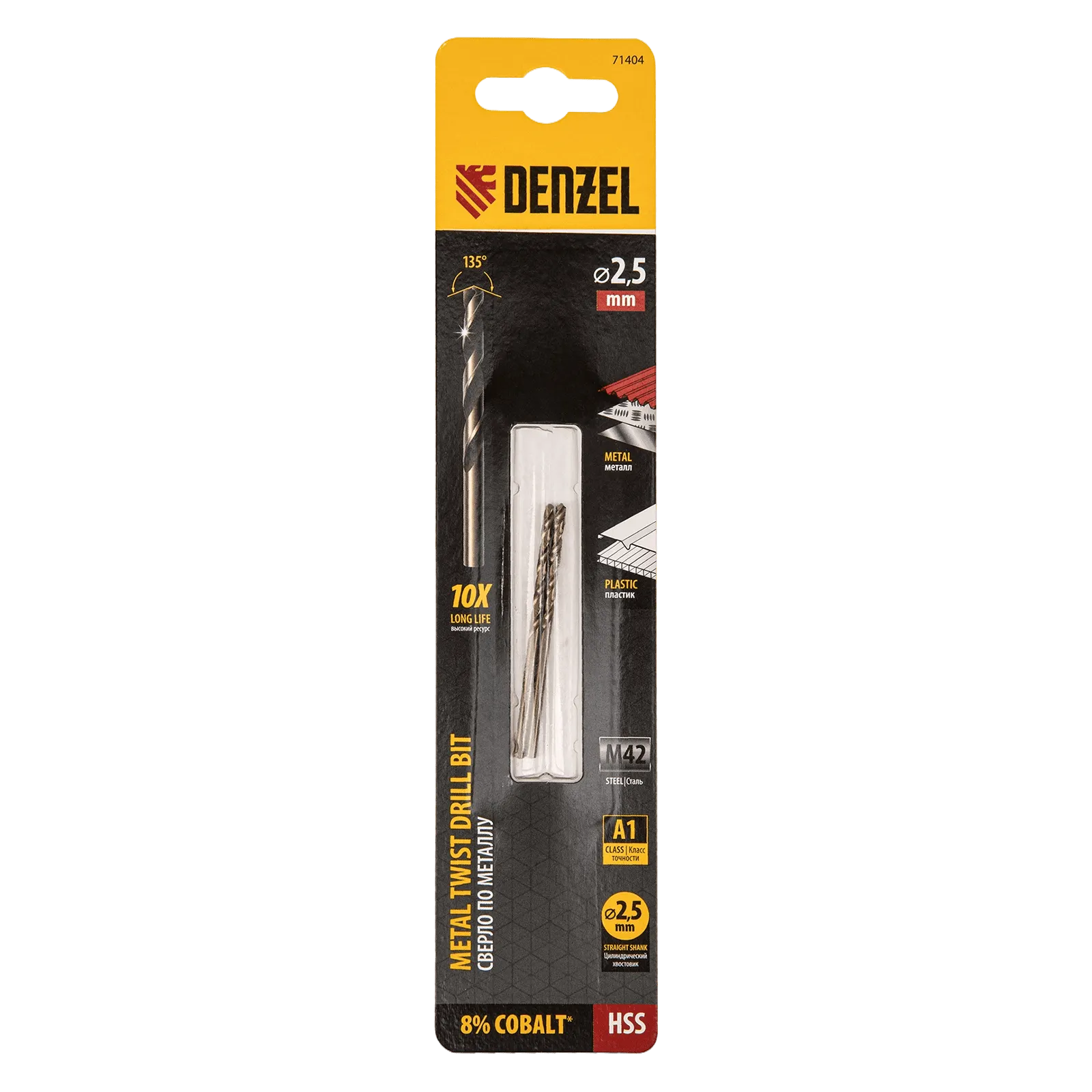 Кобальтовое сверло по металлу Denzel 71404 диаметром 2,5 мм, из стали HSS Co-8%, 2 шт. в упаковке, позволяет получать отверстия высокой точности в нержавеющей стали, цветных металлах, легированных и нелегированных сталях с пределом прочности до 1100 Н/мм2, а также в жестком пластике. Угол заточки 135° обеспечивает повышенную точность и чистоту сверления.