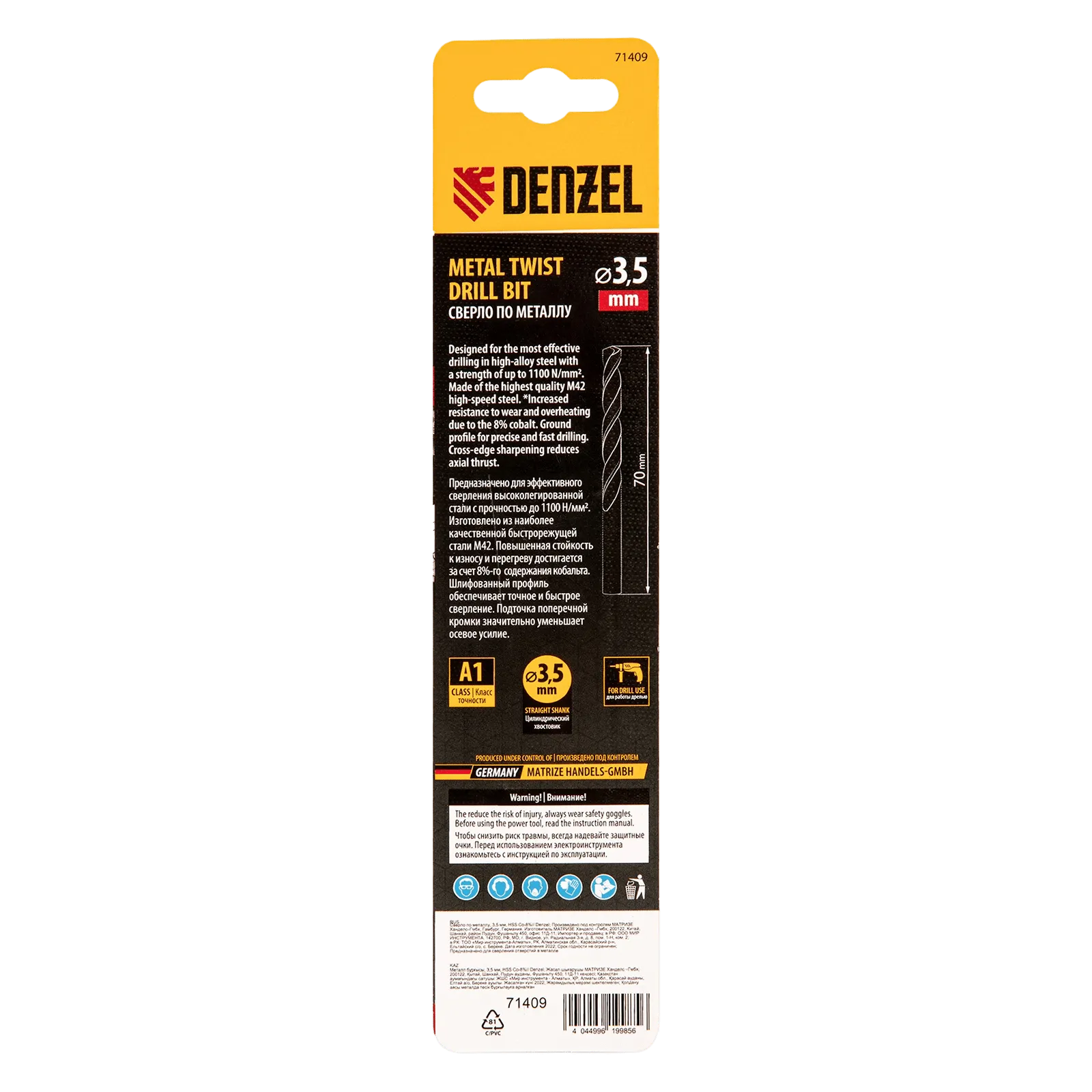 Кобальтовое сверло по металлу Denzel 71409 диаметром 3,5 мм, из стали HSS Co-8%, позволяет получать отверстия высокой точности в нержавеющей стали, цветных металлах, легированных и нелегированных сталях с пределом прочности до 1100 Н/мм2, а также в жестком пластике. Угол заточки 135° обеспечивает повышенную точность и чистоту сверления.