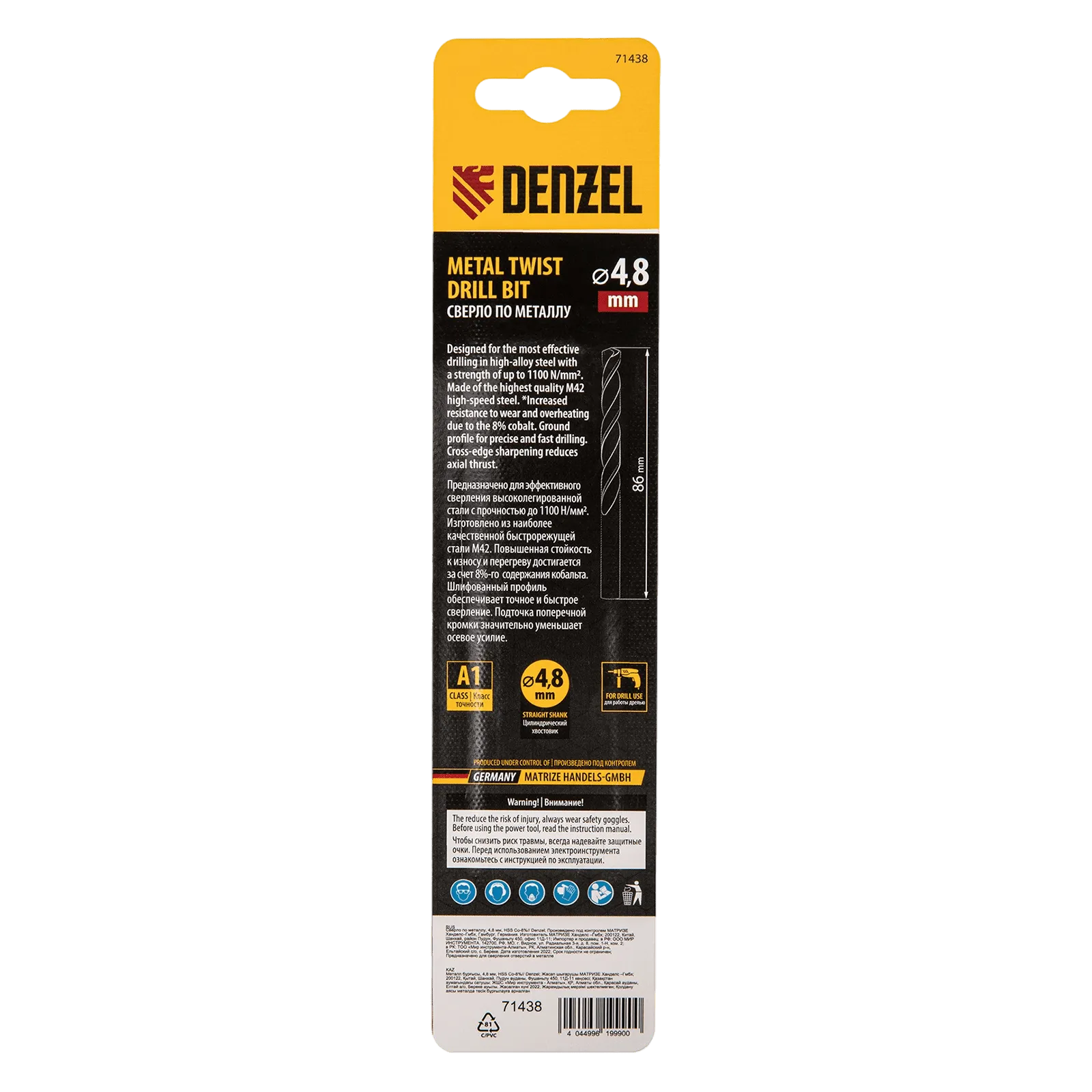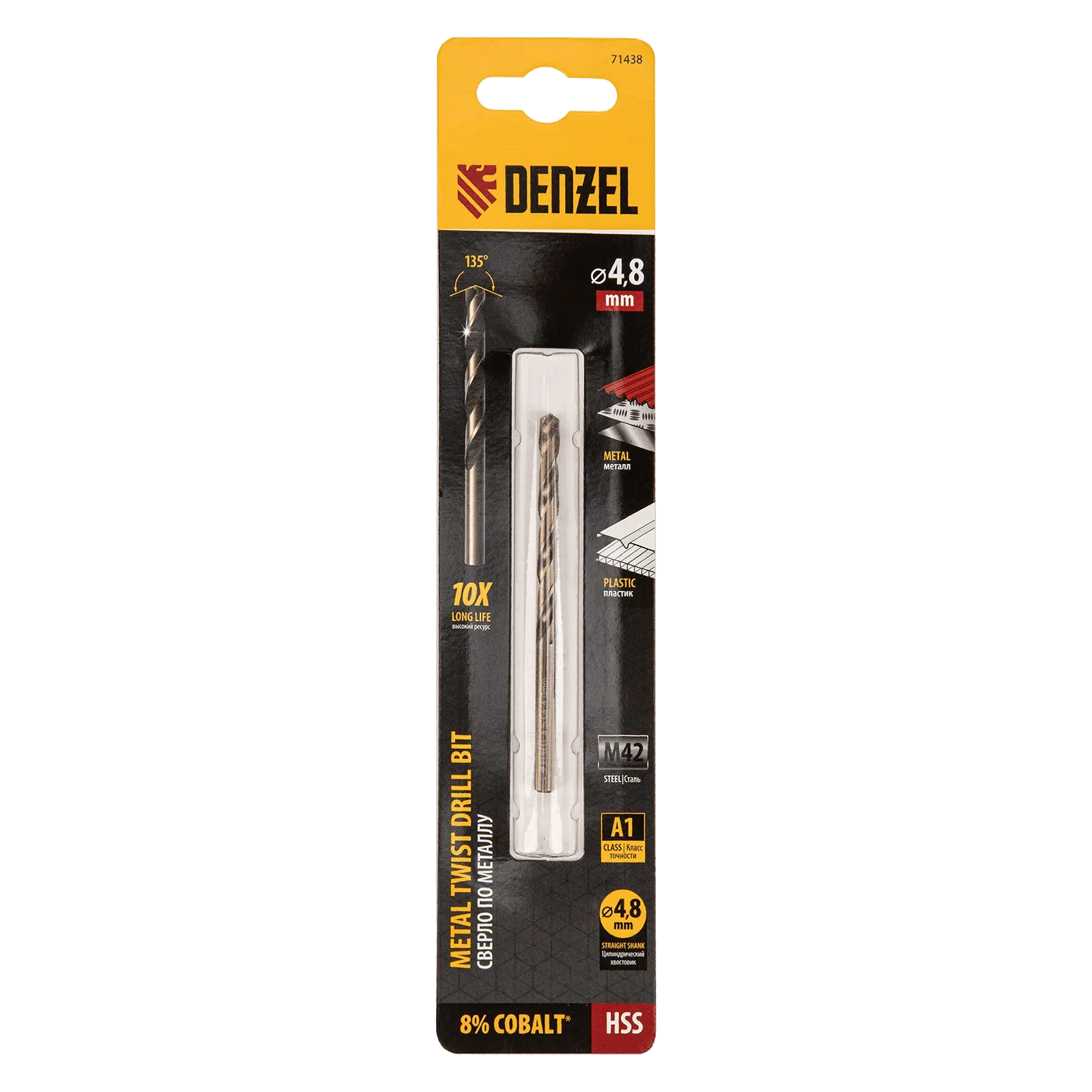 Кобальтовое сверло по металлу Denzel 71438 диаметром 4,8 мм, из стали HSS Co-8%, позволяет получать отверстия высокой точности в нержавеющей стали, цветных металлах, легированных и нелегированных сталях с пределом прочности до 1100 Н/мм2, а также в жестком пластике. Угол заточки 135° обеспечивает повышенную точность и чистоту сверления.