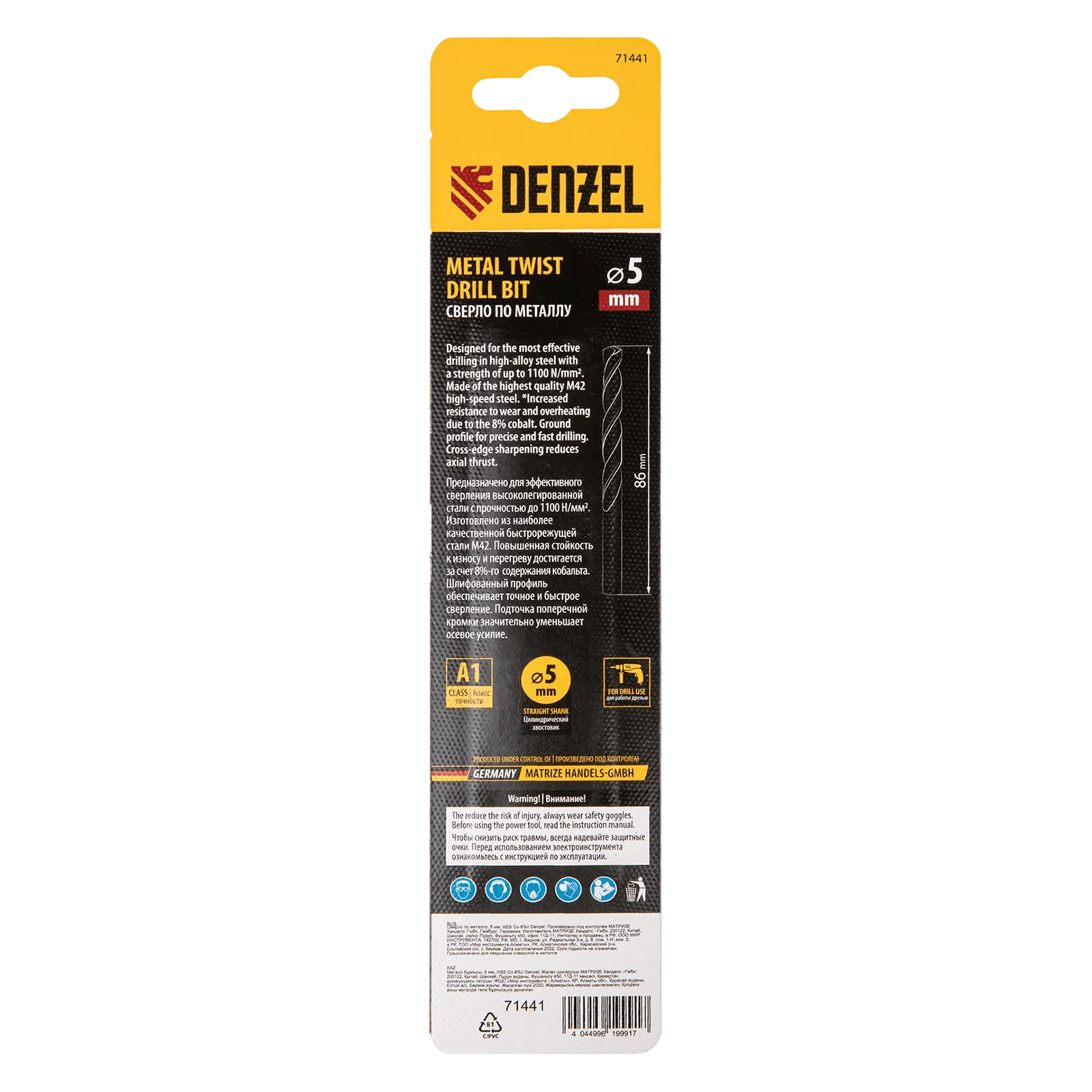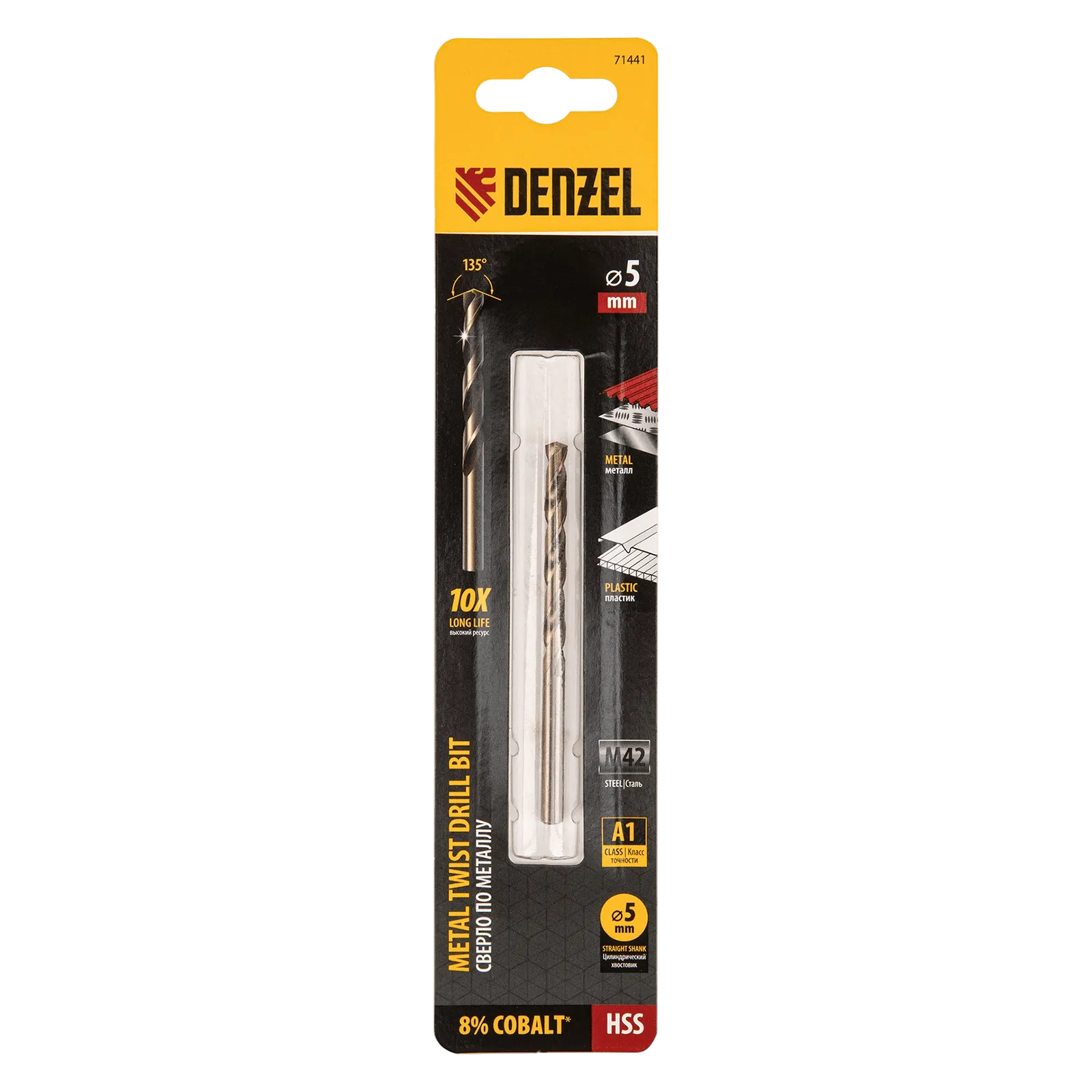 Кобальтовое сверло по металлу Denzel 71441 диаметром 5 мм, из стали HSS Co-8%, позволяет получать отверстия высокой точности в нержавеющей стали, цветных металлах, легированных и нелегированных сталях с пределом прочности до 1100 Н/мм2, а также в жестком пластике. Угол заточки 135° обеспечивает повышенную точность и чистоту сверления.
