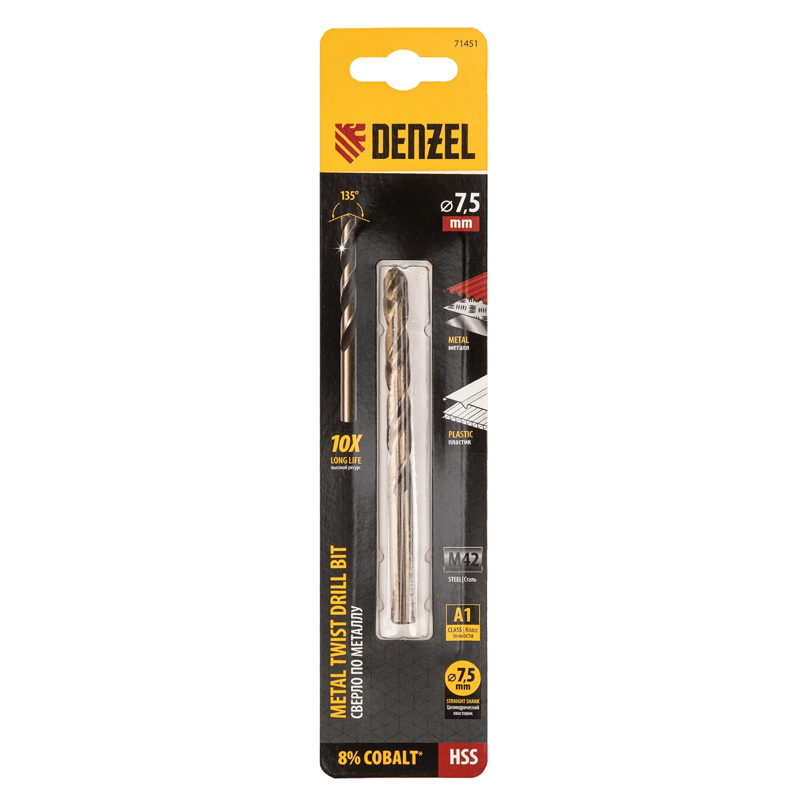 Кобальтовое сверло по металлу Denzel 71451 диаметром 7,5 мм, из стали HSS Co-8%, позволяет получать отверстия высокой точности в нержавеющей стали, цветных металлах, легированных и нелегированных сталях с пределом прочности до 1100 Н/мм2, а также в жестком пластике. Угол заточки 135° обеспечивает повышенную точность и чистоту сверления.