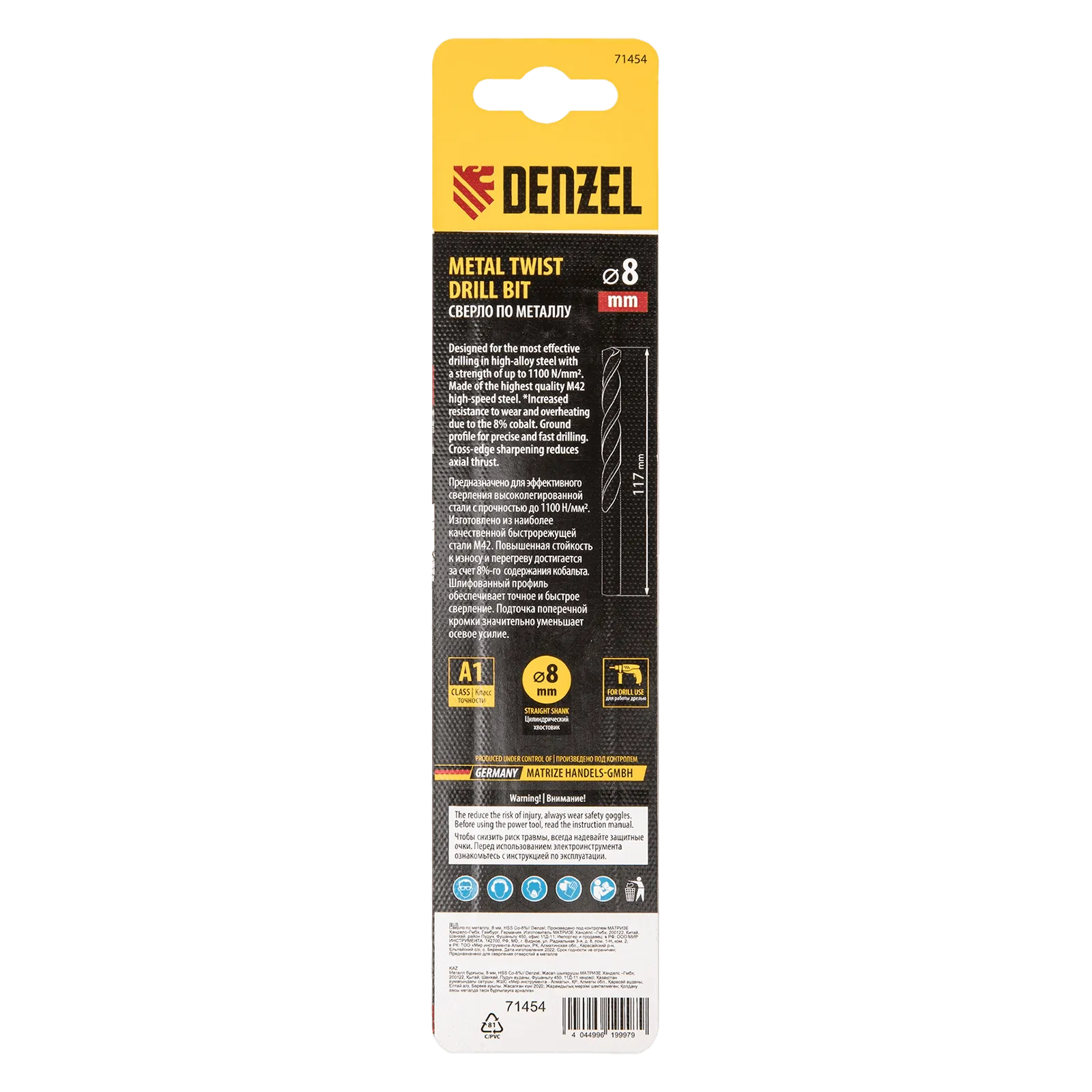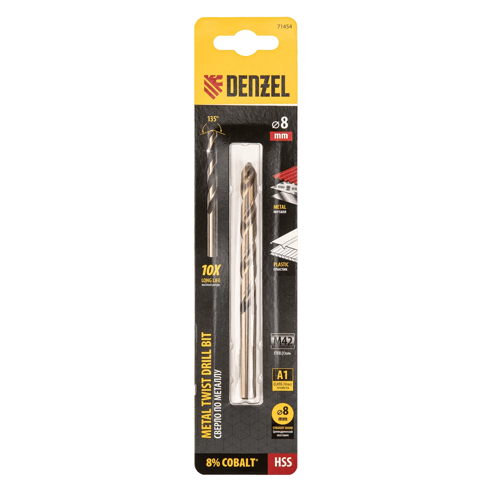 Кобальтовое сверло по металлу Denzel 71454 диаметром 8 мм, из стали HSS Co-8%, позволяет получать отверстия высокой точности в нержавеющей стали, цветных металлах, легированных и нелегированных сталях с пределом прочности до 1100 Н/мм2, а также в жестком пластике. Угол заточки 135° обеспечивает повышенную точность и чистоту сверления.