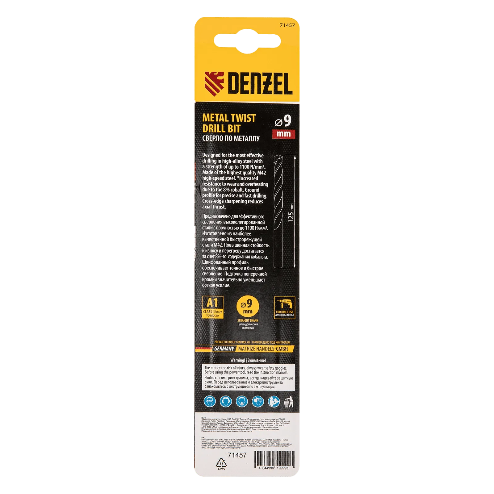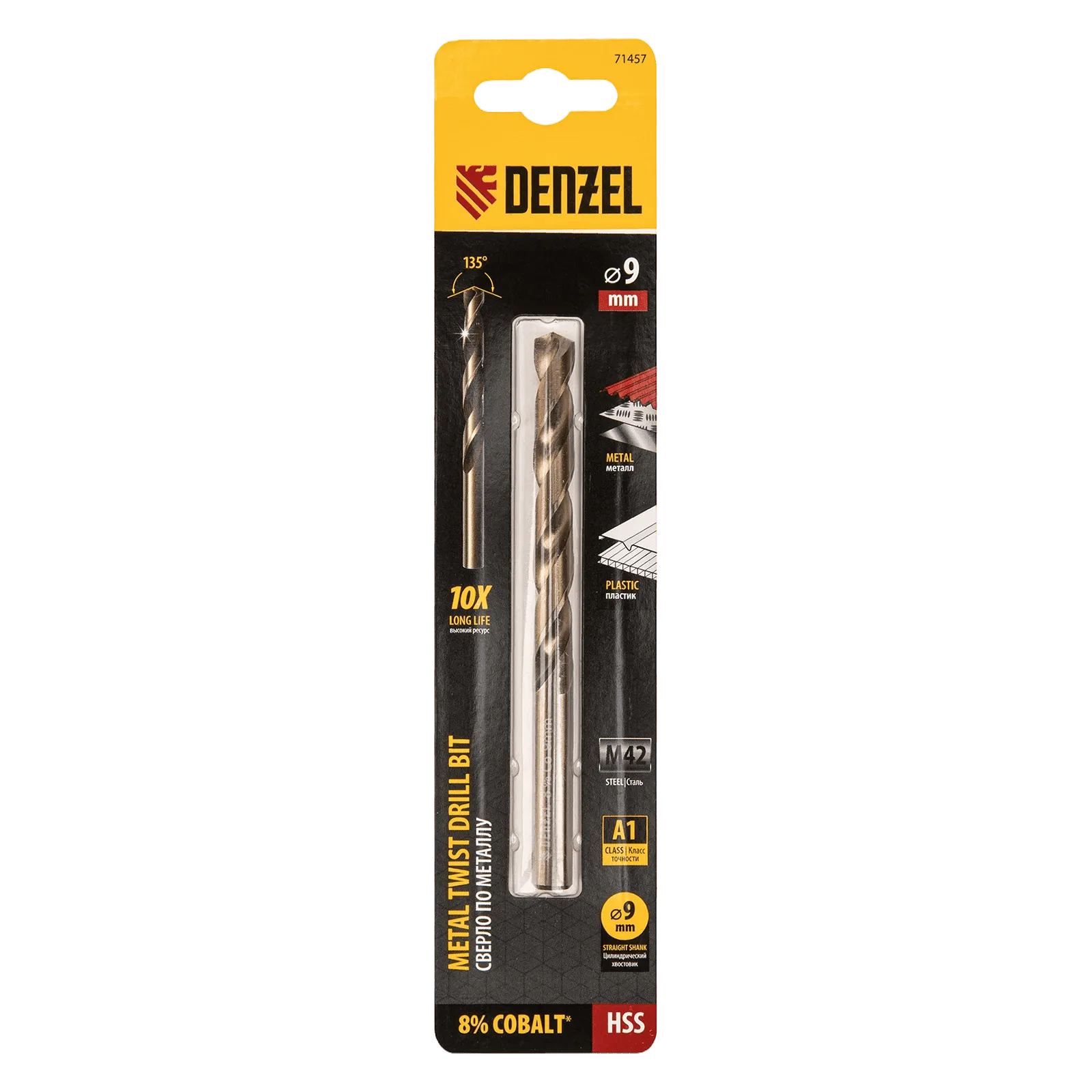 Кобальтовое сверло по металлу Denzel 71457 диаметром 9 мм, из стали HSS Co-8%, позволяет получать отверстия высокой точности в нержавеющей стали, цветных металлах, легированных и нелегированных сталях с пределом прочности до 1100 Н/мм2, а также в жестком пластике. Угол заточки 135° обеспечивает повышенную точность и чистоту сверления.