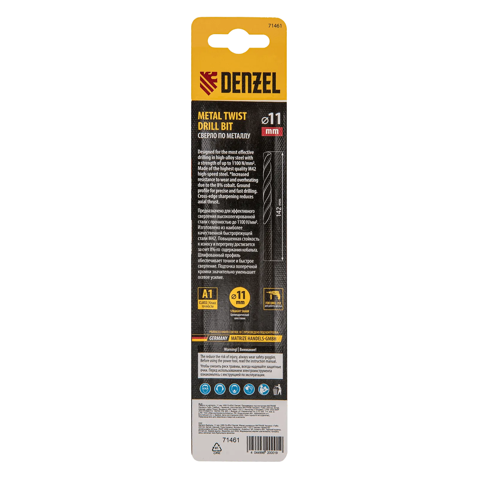 Кобальтовое сверло по металлу Denzel 71461 диаметром 11 мм, из стали HSS Co-8%, позволяет получать отверстия высокой точности в нержавеющей стали, цветных металлах, легированных и нелегированных сталях с пределом прочности до 1100 Н/мм2, а также в жестком пластике. Угол заточки 135° обеспечивает повышенную точность и чистоту сверления.