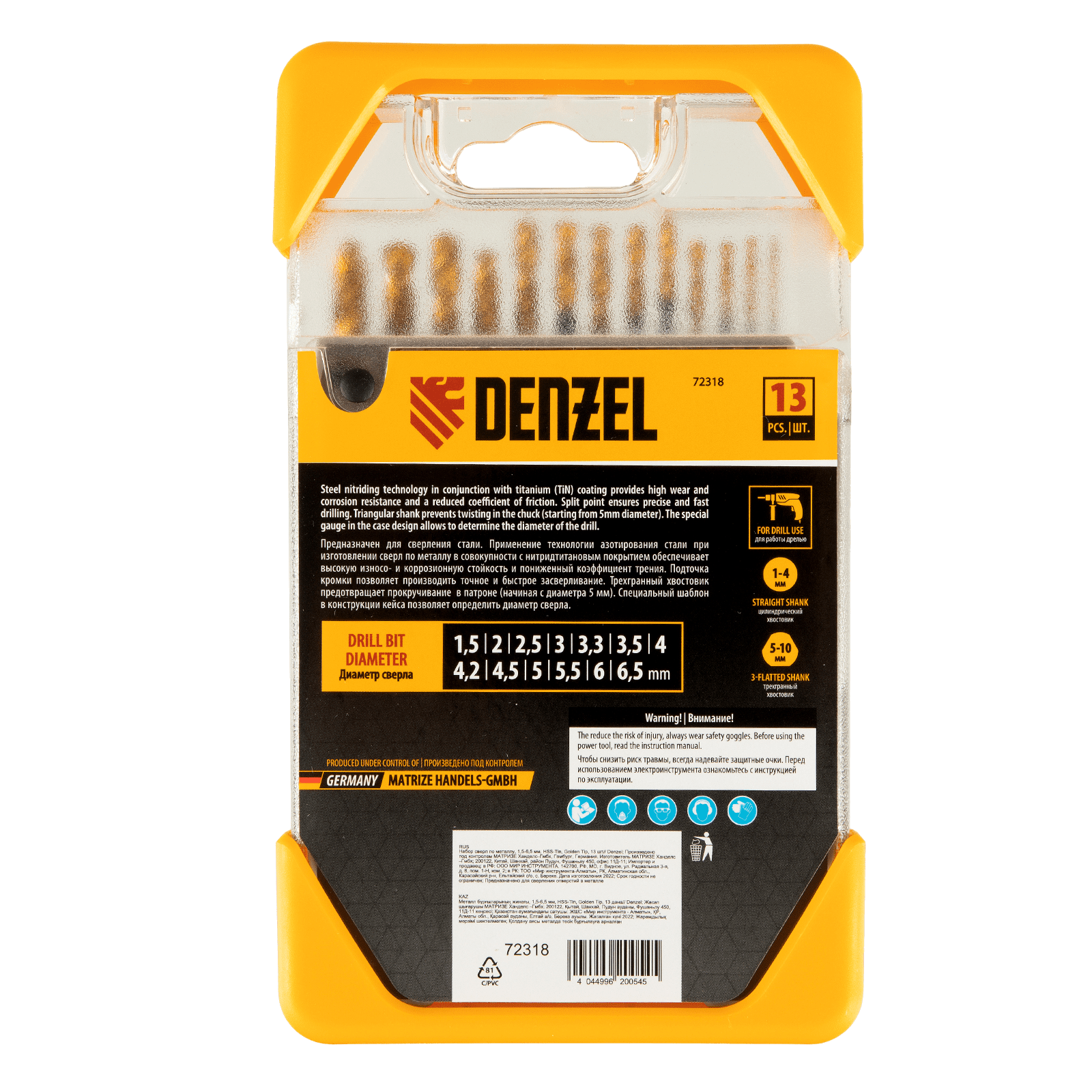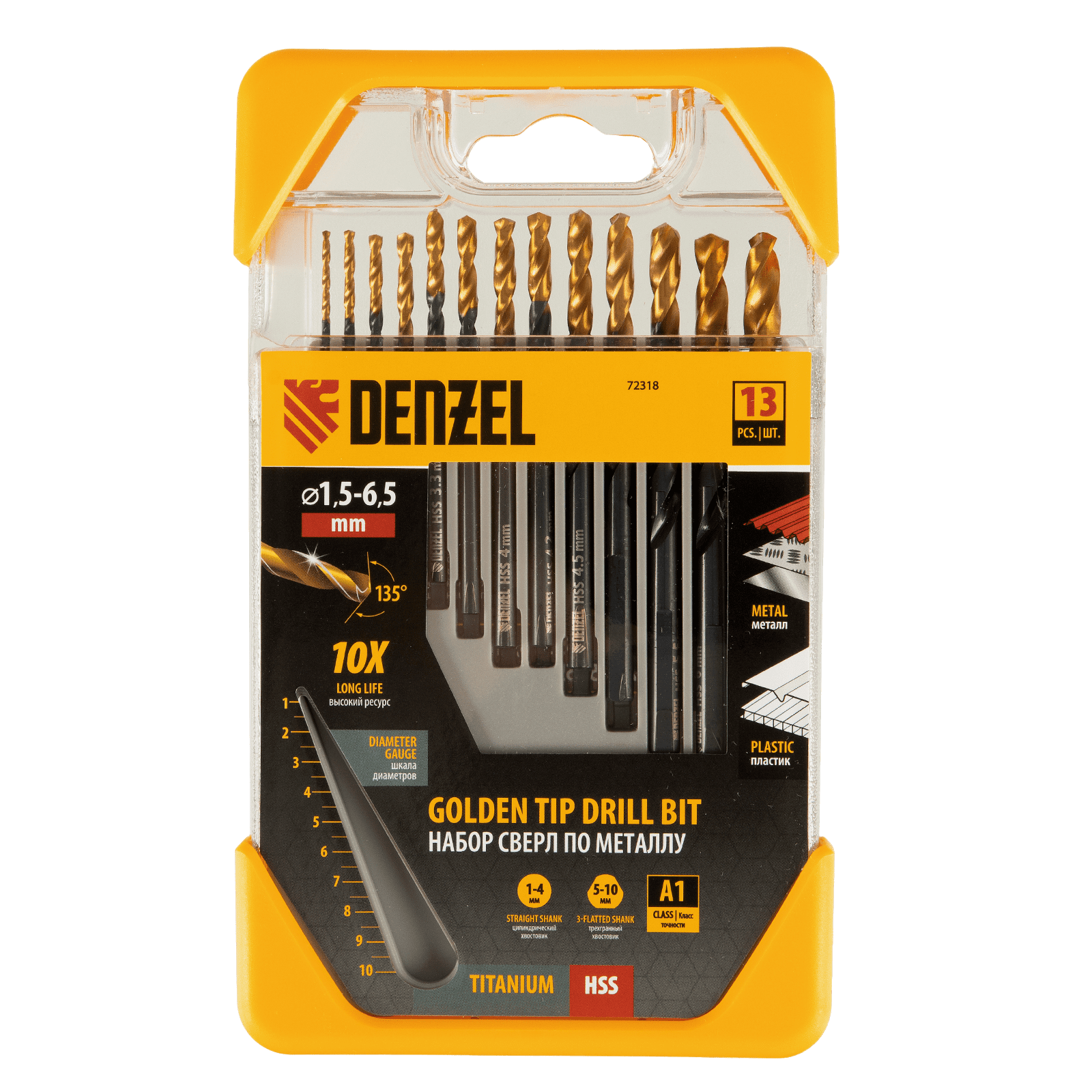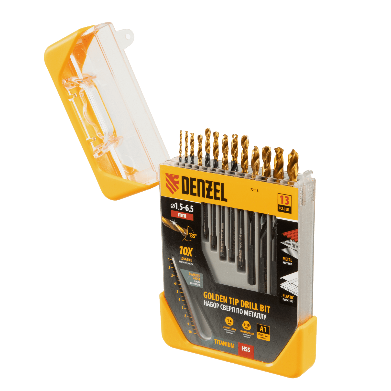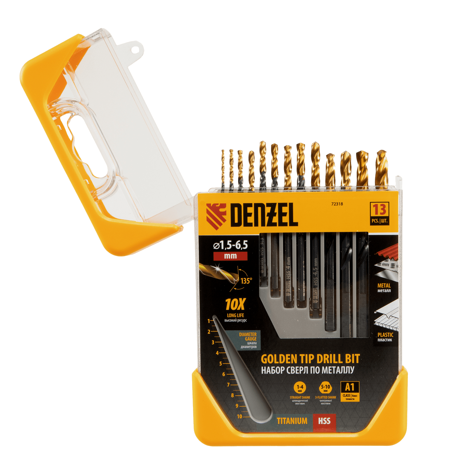 Набор Denzel Golden Tip 72318 включает 13 сверл по металлу для получения отверстий диаметром 1,5-6,5 в стальных заготовках. Оснастка вышлифована на высокоточном оборудовании и имеет класс точности A1, что позволяет эффективно решать поставленные задачи. Сверла упакованы в пластиковый кейс, с помощью которого можно измерить их диаметр: в крышке предусмотрен специальный шаблон.