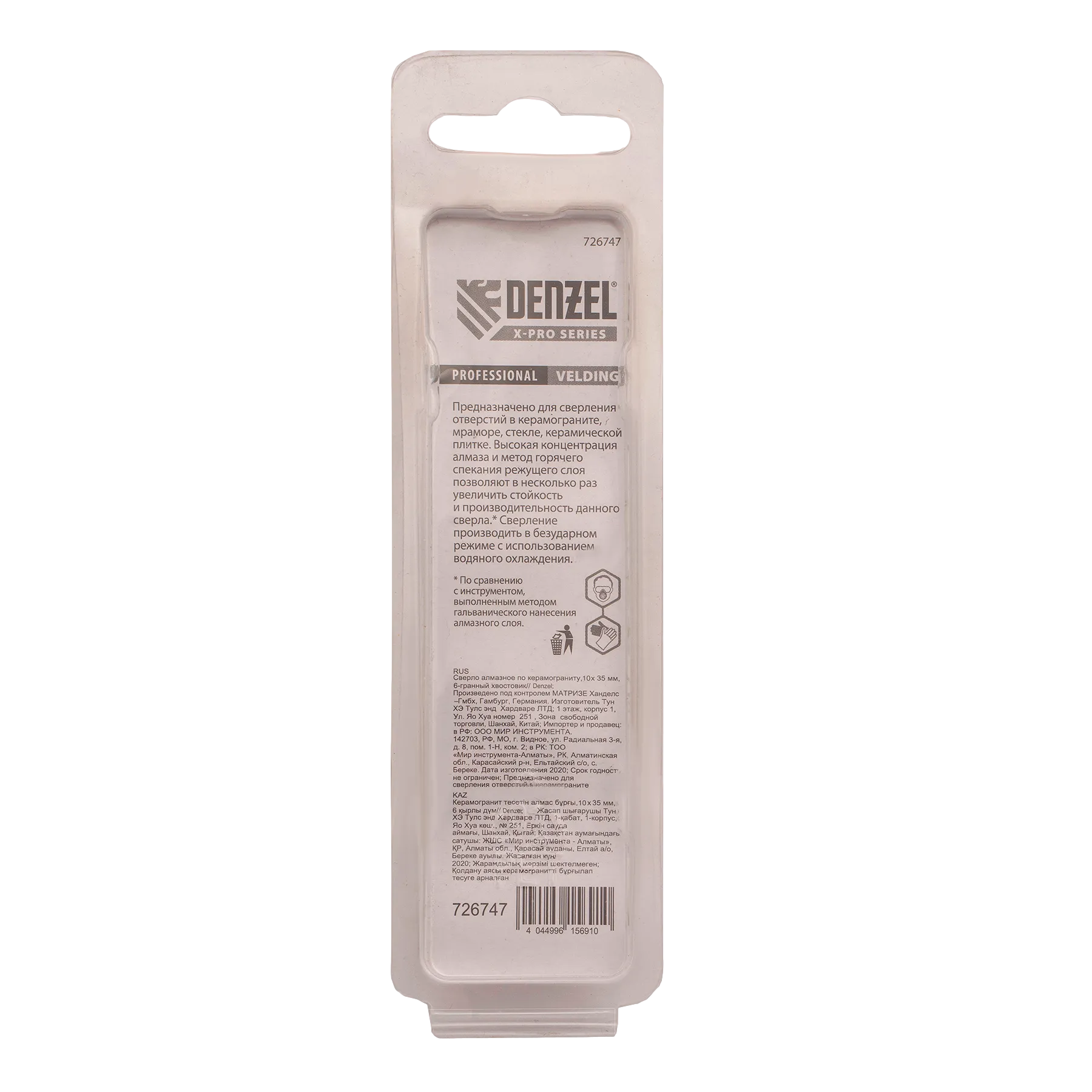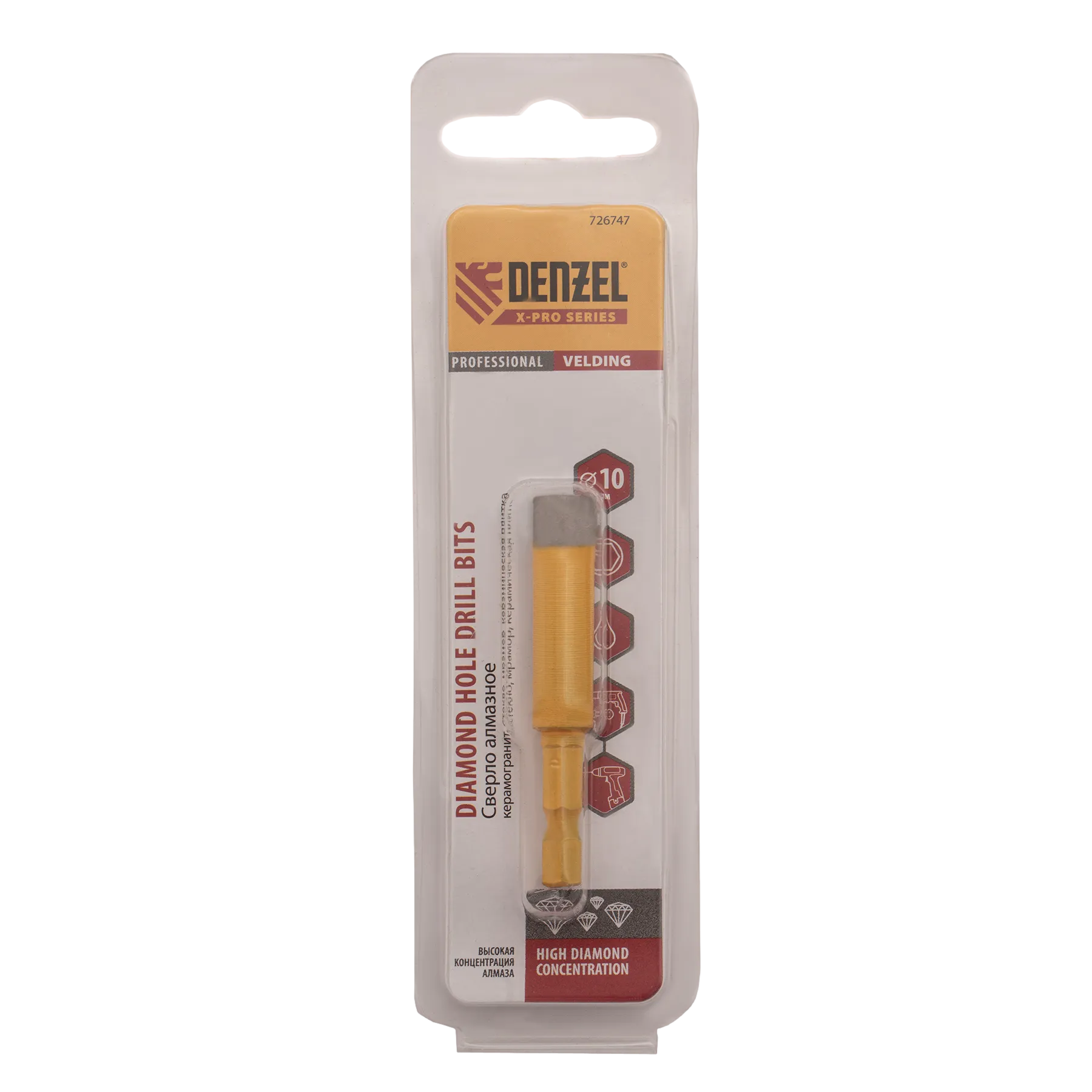 Алмазное сверло Denzel 726747 размером 10 х 35 мм, с шестигранным хвостовиком, — режущий инструмент для получения точных отверстий диаметром 10 мм. Подходит для работ по стеклу, керамике, а также керамограниту и мрамору. Используется в качестве оснастки для дрелей и шуруповертов. Сверление с применением водяного охлаждения позволит избежать перегрева сверла и продлить срок его службы. Использование кондуктора 72833 препятствует смещению коронки и облегчает засверливание. Оснастка предназначена для профессионального использования.