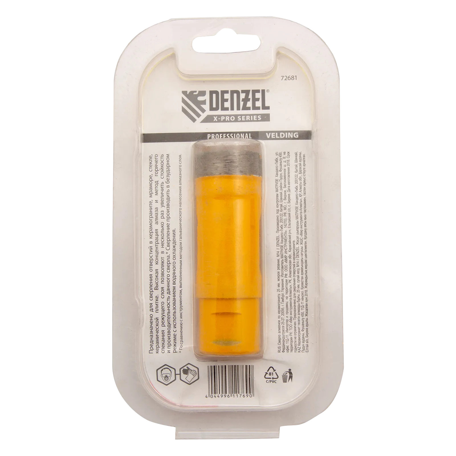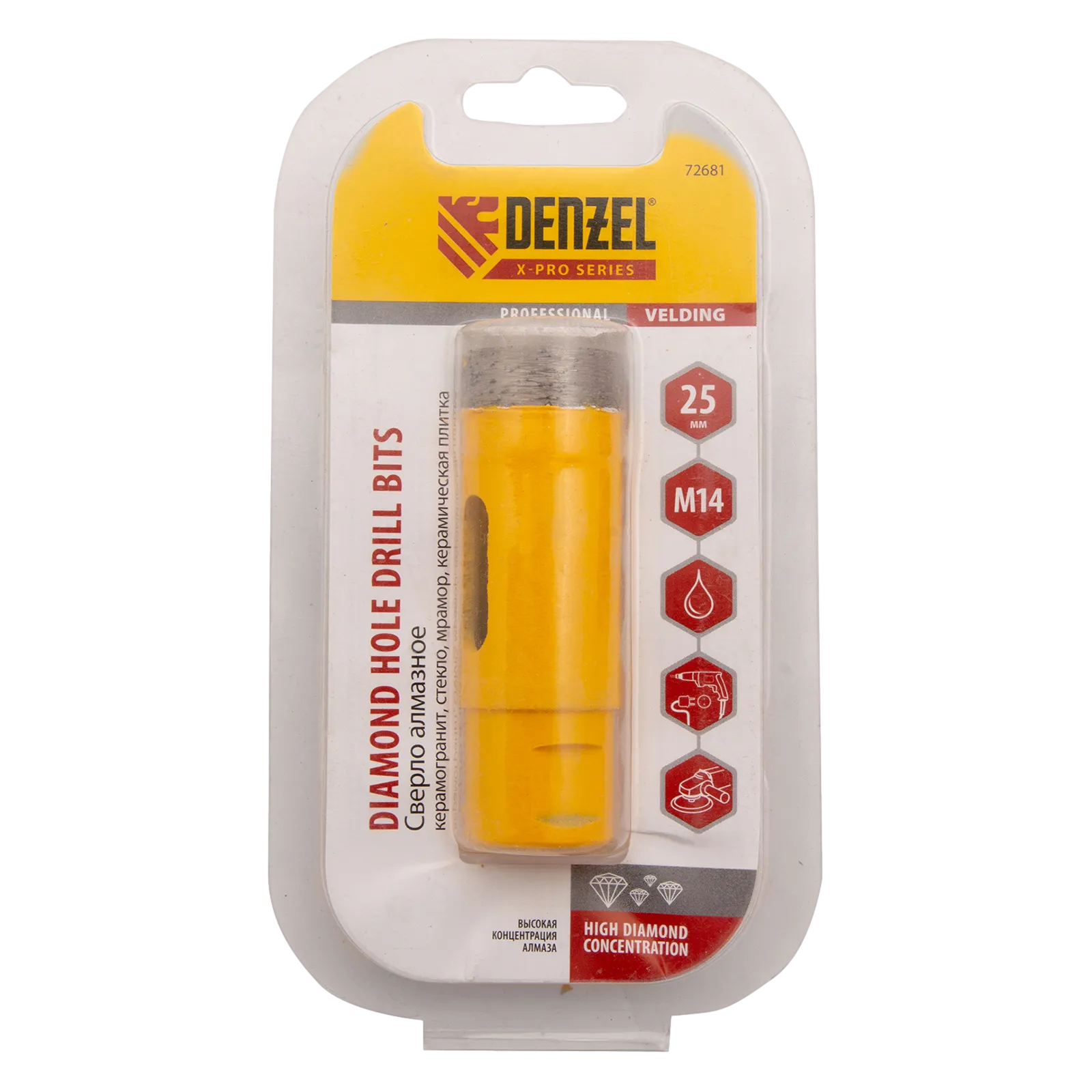 Алмазное сверло Denzel 72681 диаметром 25 мм, с резьбой М14, предназначено для «мокрого» сверления по керамограниту, мрамору, стеклу и керамической плитке. Позволяет получать ровные отверстия без сколов, используется для проведения ремонтных и отделочных работ. Сверло (коронку) устанавливают на вал углошлифовальной машины, благодаря чему скорость сверления увеличивается в несколько раз по сравнению с дрелью или шуруповертом. Применение водяного охлаждения повышает срок службы оснастки. Чтобы точно позиционировать сверло при сверлении дрелью, рекомендуется использовать кондуктор (арт. 72830).