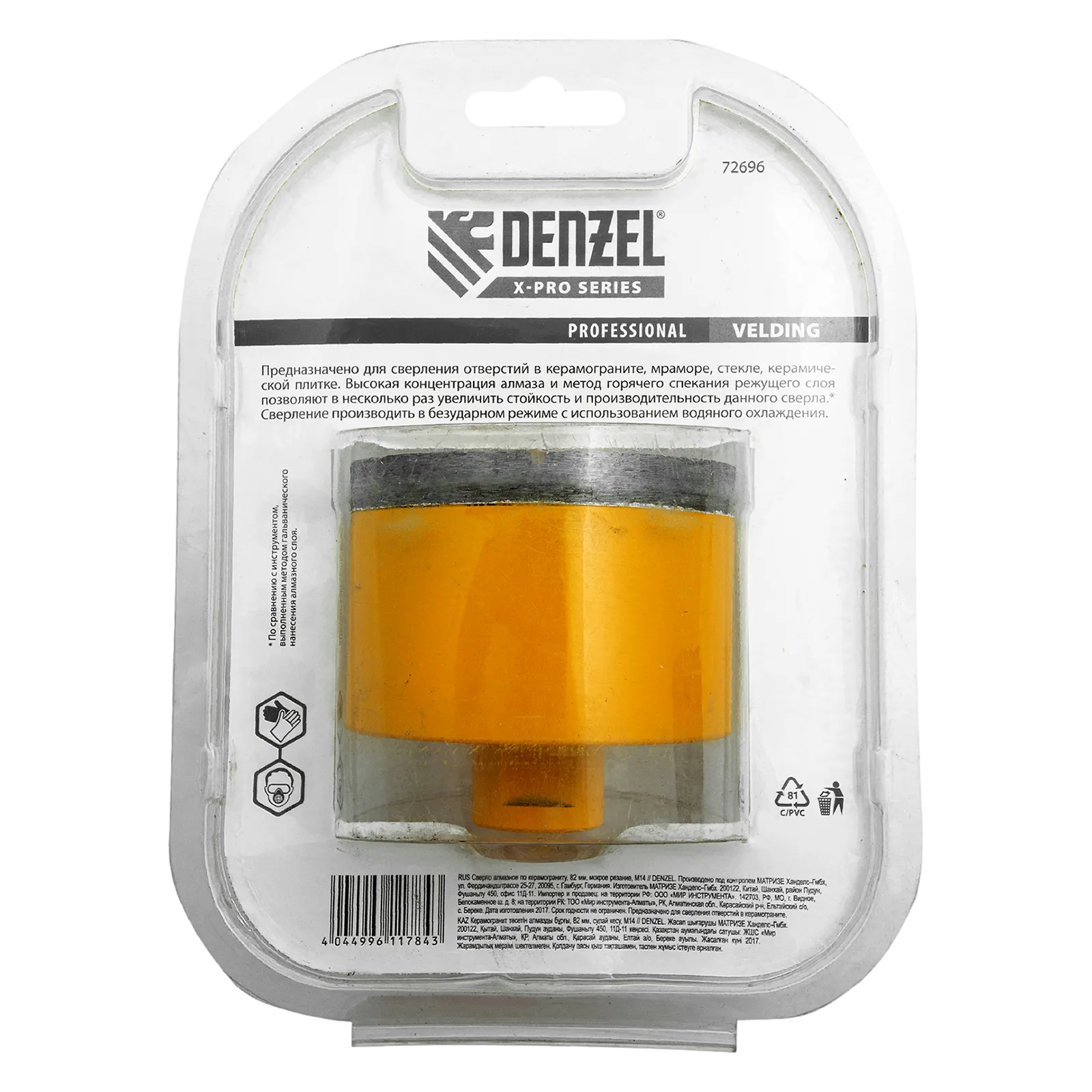 Алмазное сверло Denzel 72696 диаметром 82 мм, с резьбой М14, предназначено для «мокрого» сверления по керамограниту, мрамору, стеклу и керамической плитке. Позволяет получать ровные отверстия без сколов, используется для проведения ремонтных и отделочных работ. Сверло (коронку) устанавливают на вал углошлифовальной машины, благодаря чему скорость сверления увеличивается в несколько раз по сравнению с дрелью или шуруповертом. Применение водяного охлаждения повышает срок службы оснастки. Чтобы точно позиционировать сверло при сверлении дрелью, рекомендуется использовать кондуктор (арт. 72830).