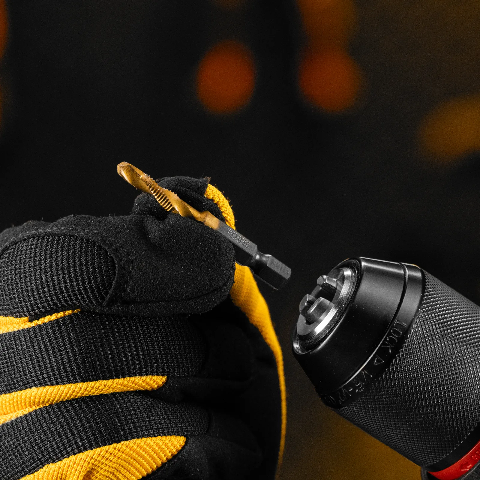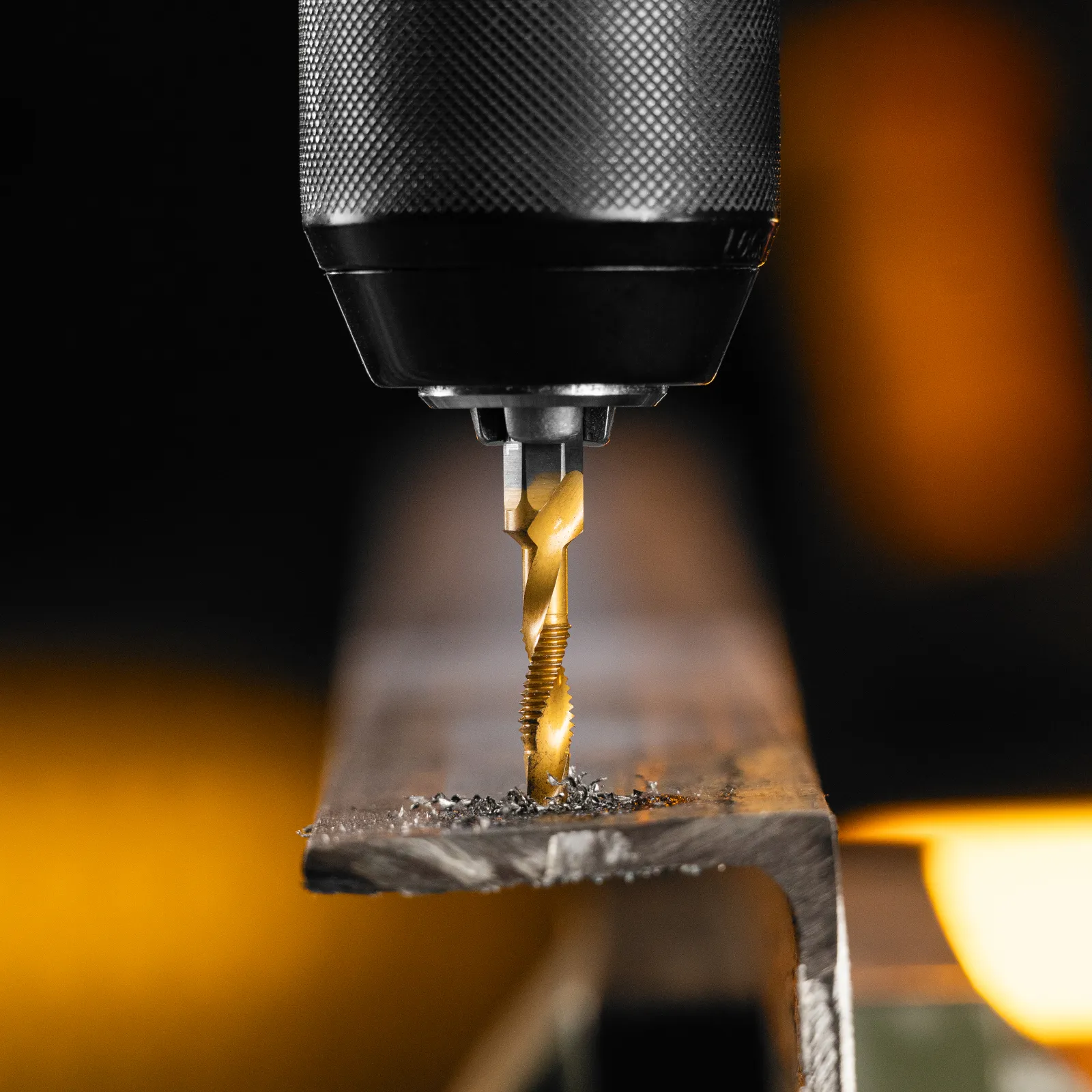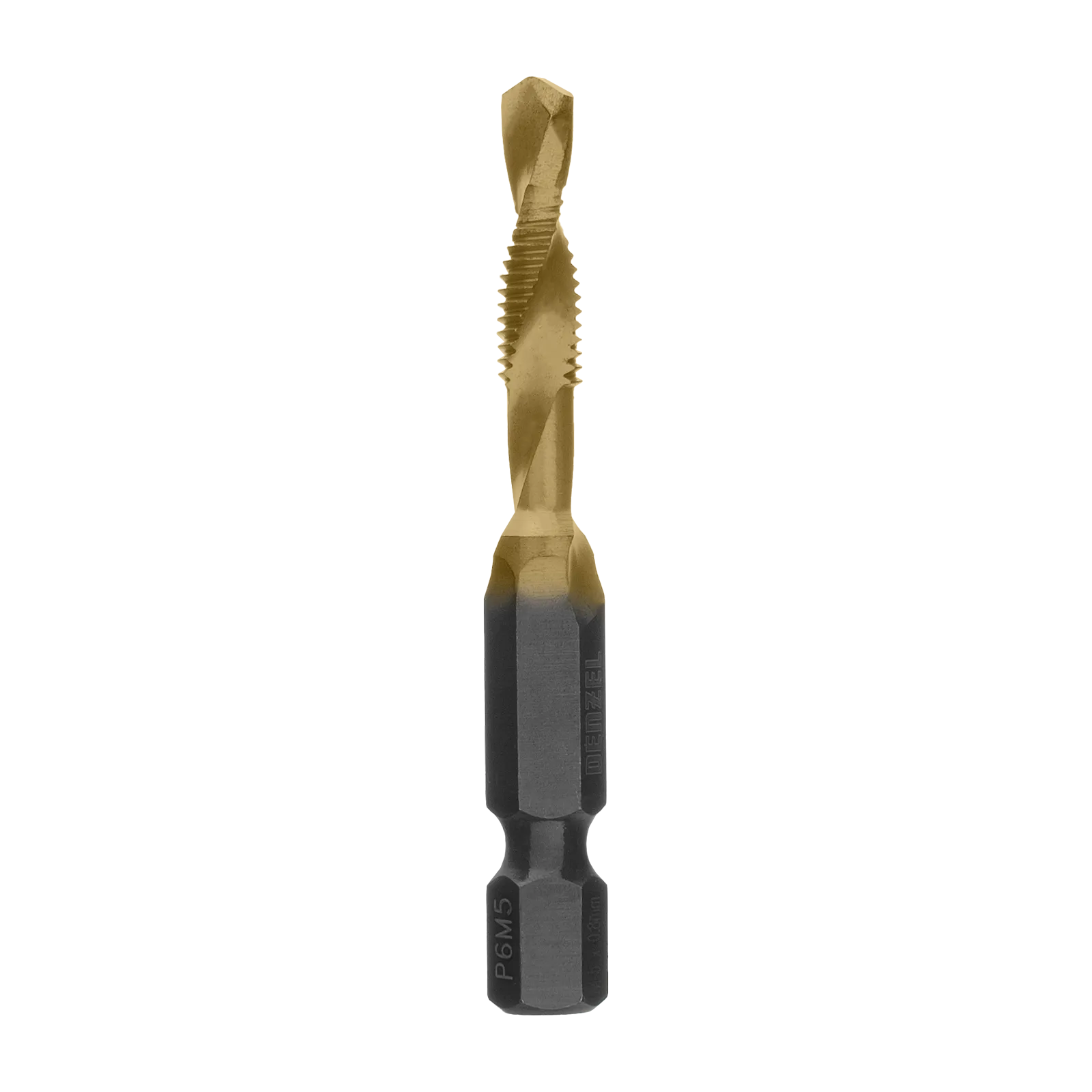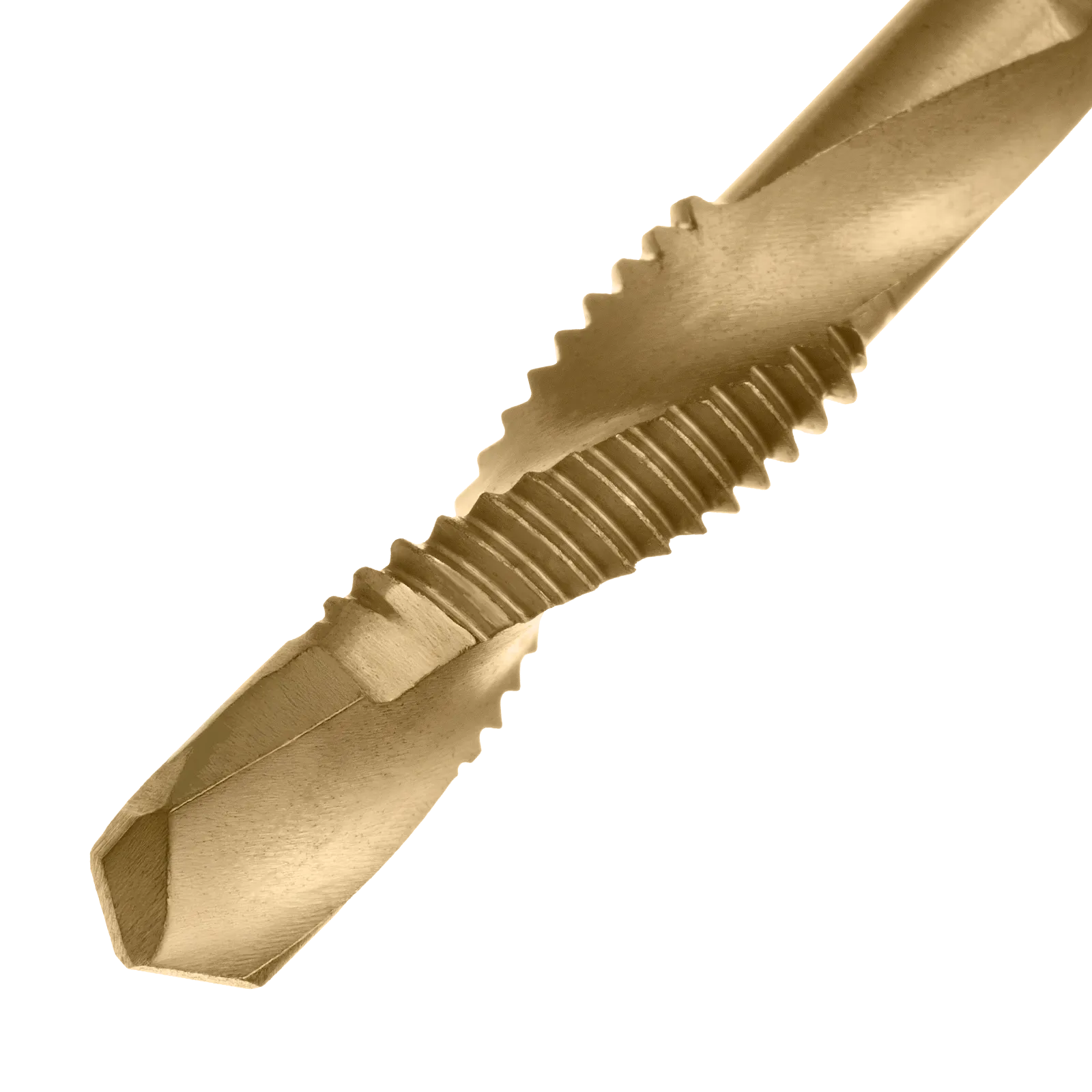 - Долговечность — нитридтитановое покрытие защищает от повреждений и уменьшает трение, что увеличивает устойчивость сверла-метчика к износу.