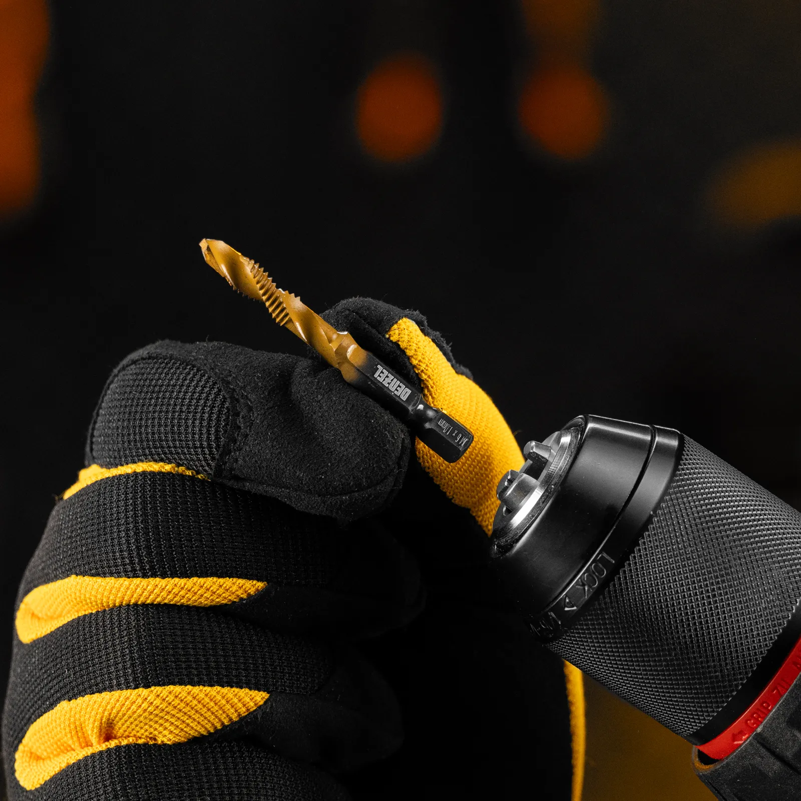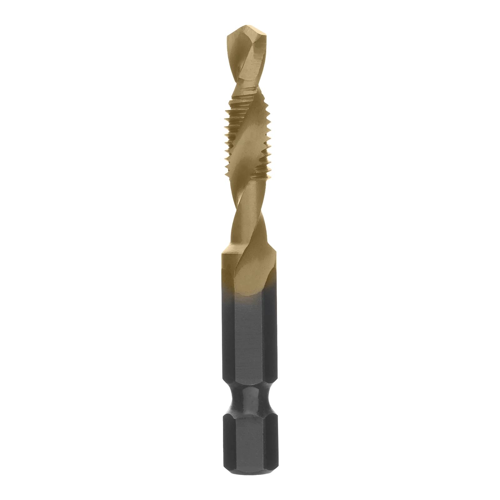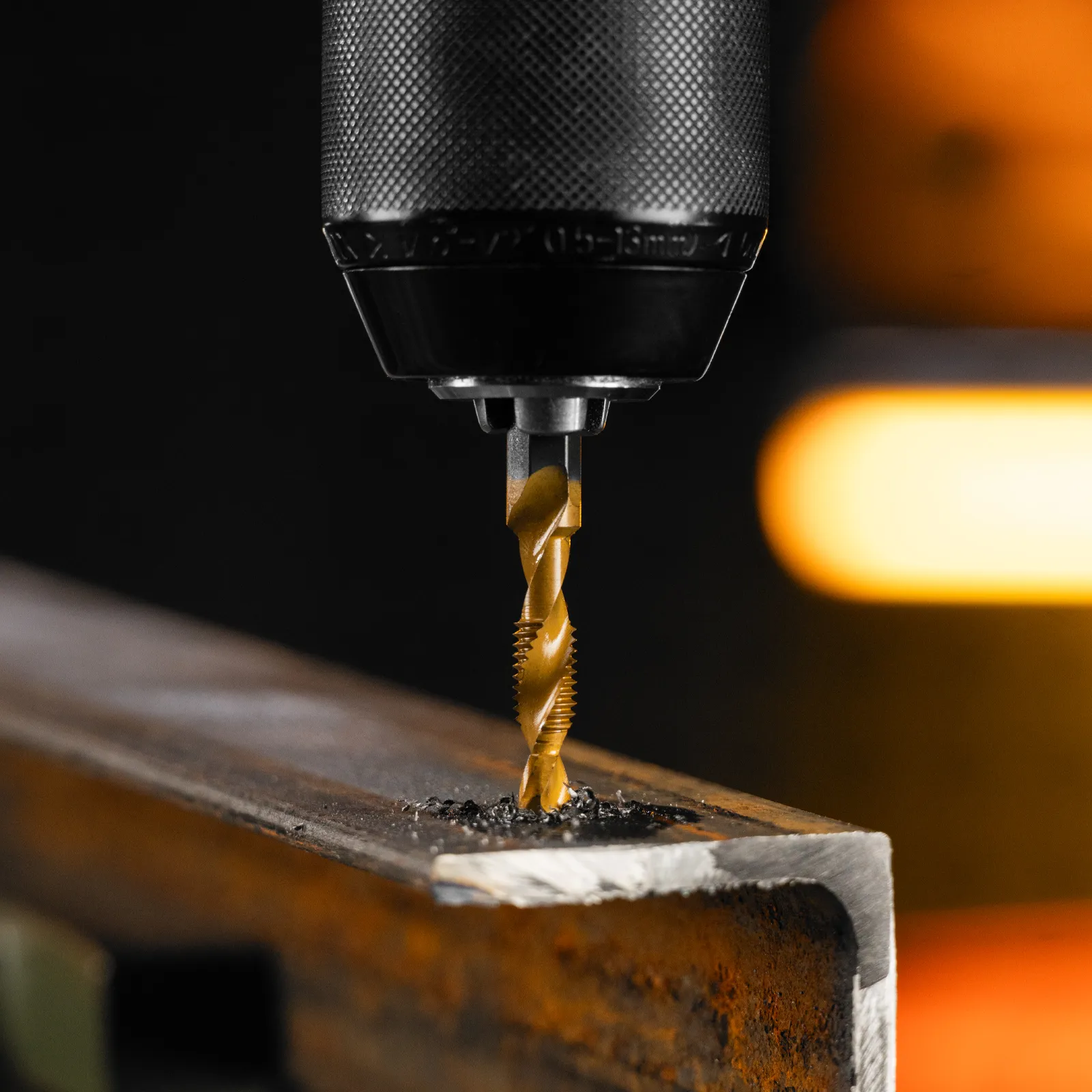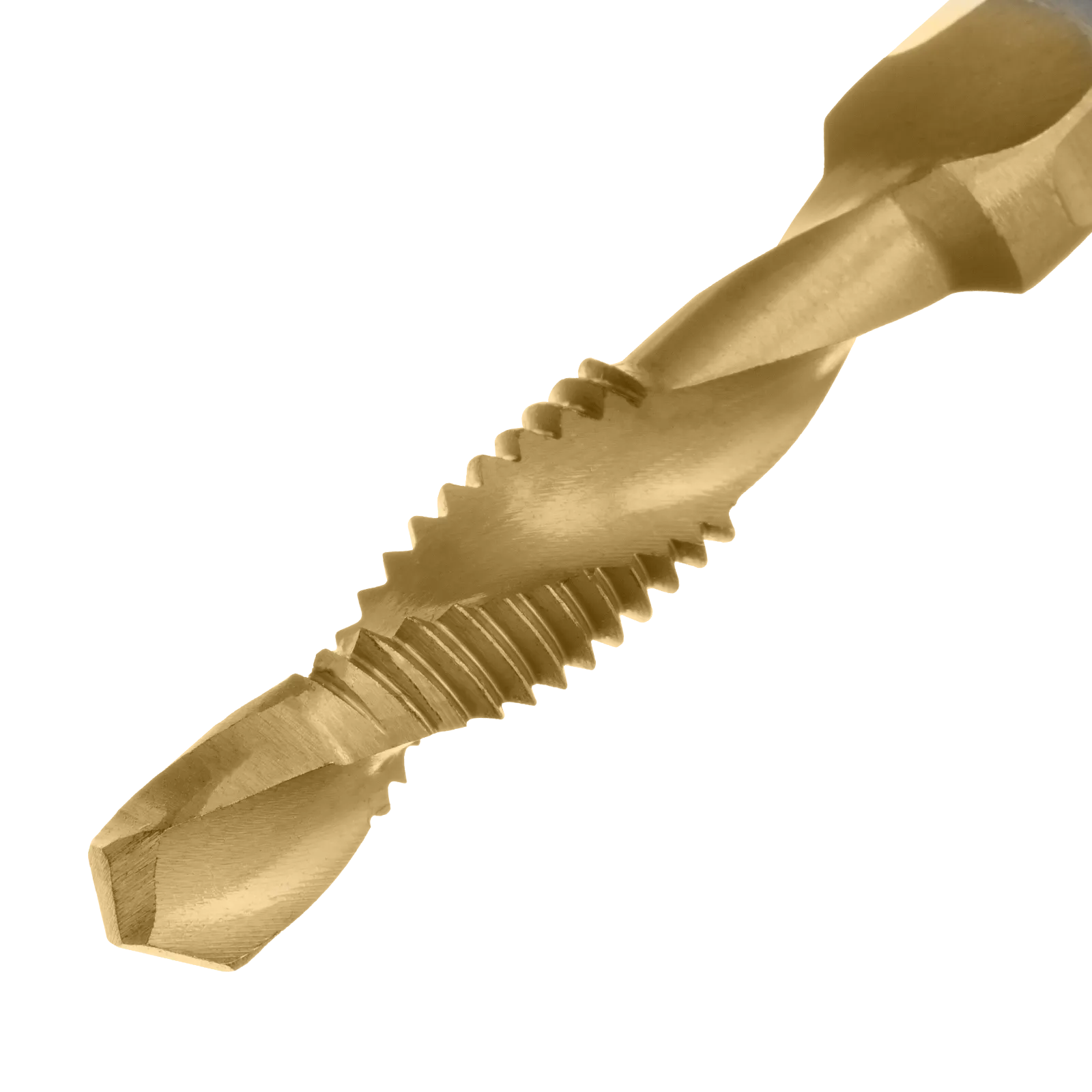 - Долговечность — нитридтитановое покрытие защищает от повреждений и уменьшает трение, что увеличивает устойчивость сверла-метчика к износу.