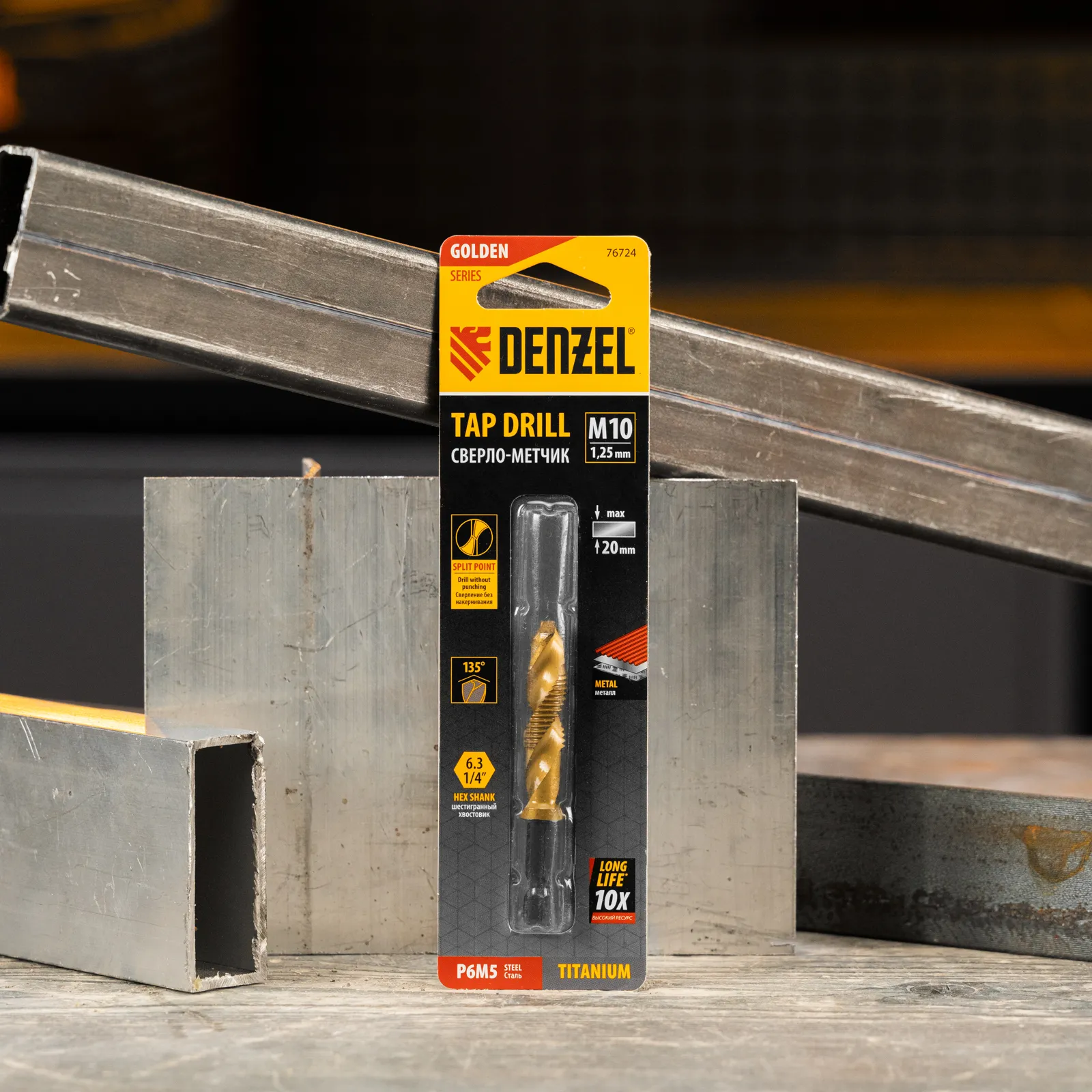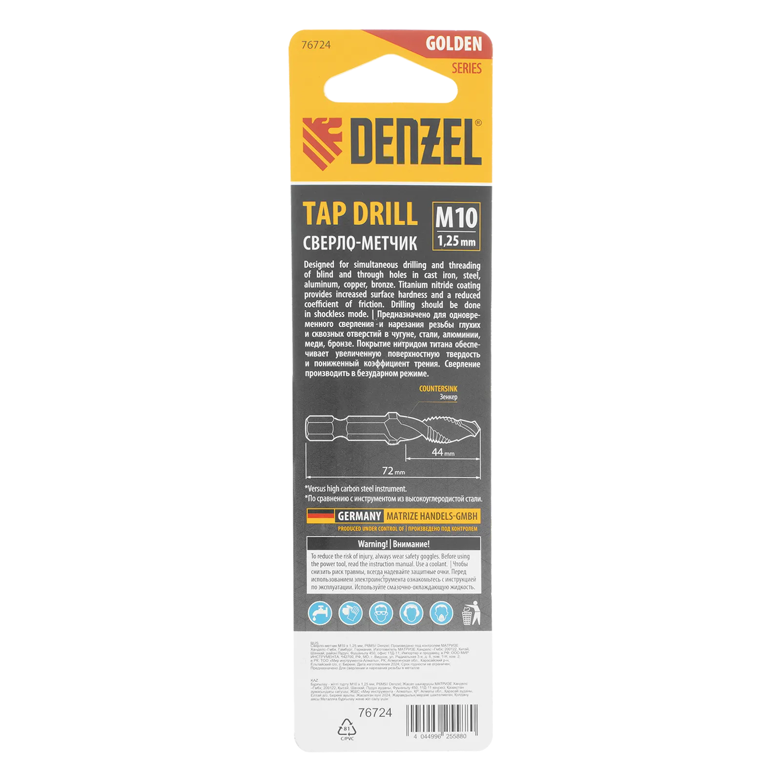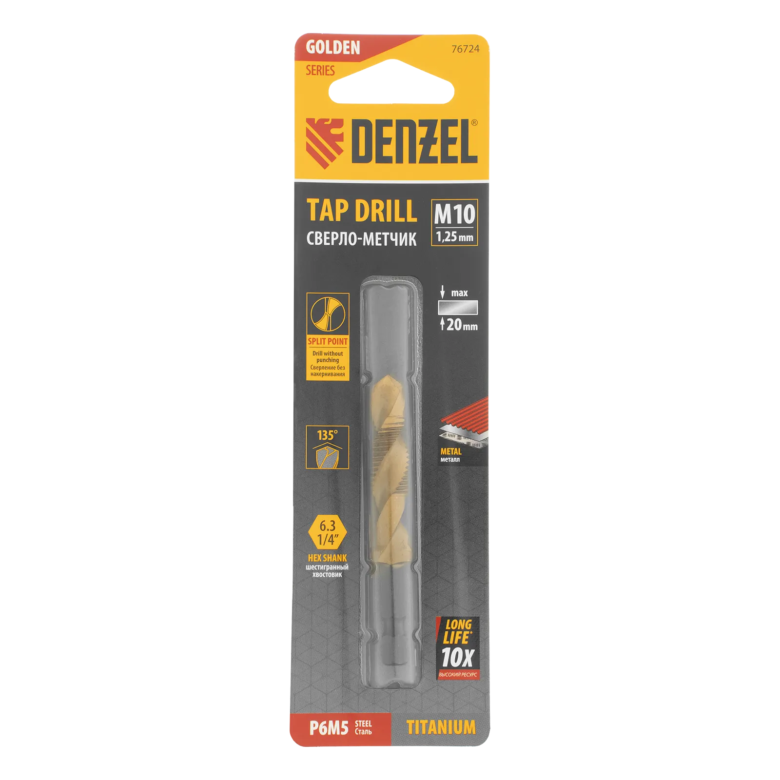 Сверло-метчик Denzel 76724 из стали P6M5 предназначено для получения глухих и сквозных отверстий в металлических заготовках с одновременным нарезанием правой резьбы M10 с шагом 1,25 мм. Позволяет существенно сэкономить время работы, объединив две операции в одну. Угол заточки 135° оптимален для работы с чугуном, сталью, алюминием, медью, бронзой. Ресурс оснастки увеличен в 10 раз по сравнению с аналогичными моделями из углеродистой стали.