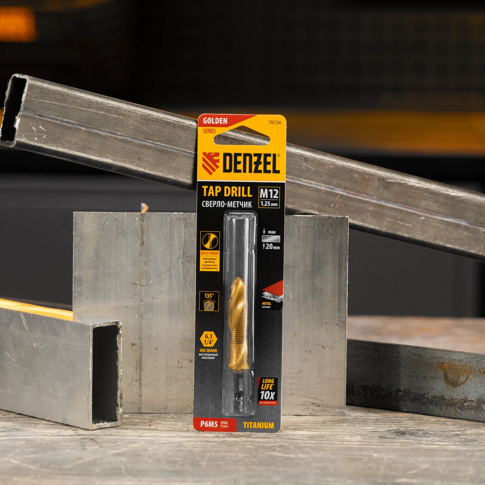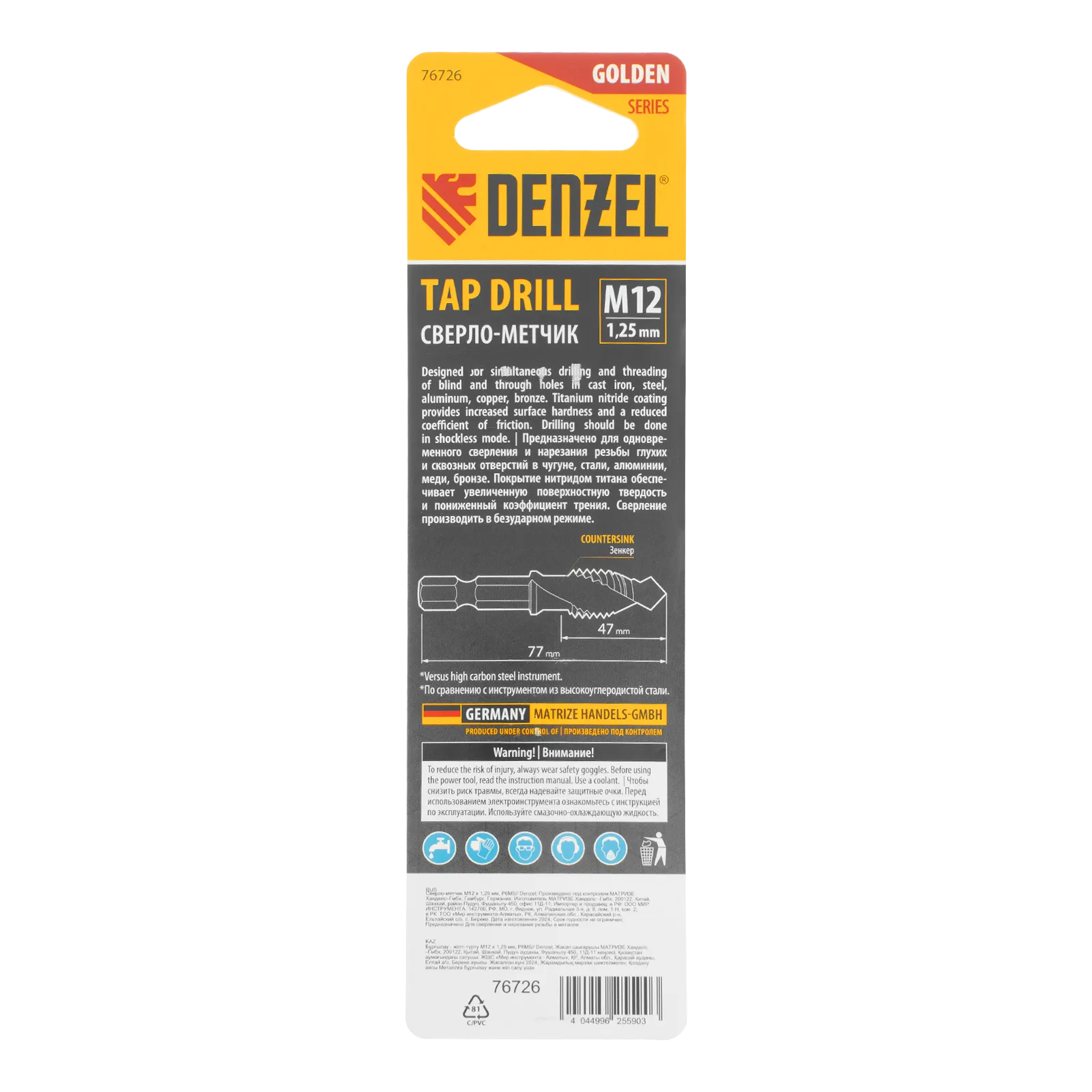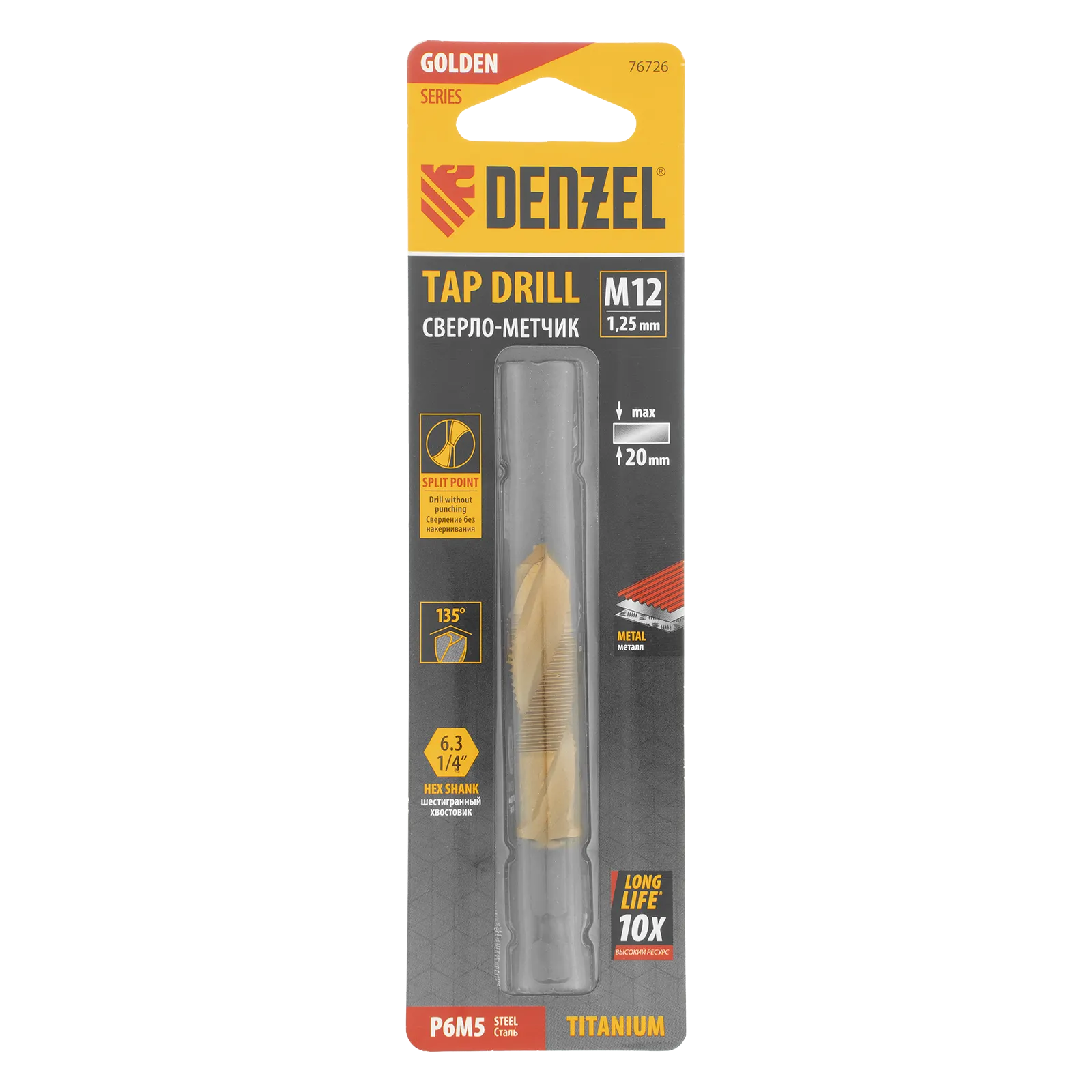 Сверло-метчик Denzel 76726 из стали P6M5 предназначено для получения глухих и сквозных отверстий в металлических заготовках с одновременным нарезанием правой резьбы M12 с шагом 1,25 мм. Позволяет существенно сэкономить время работы, объединив две операции в одну. Угол заточки 135° оптимален для работы с чугуном, сталью, алюминием, медью, бронзой. Ресурс оснастки увеличен в 10 раз по сравнению с аналогичными моделями из углеродистой стали.