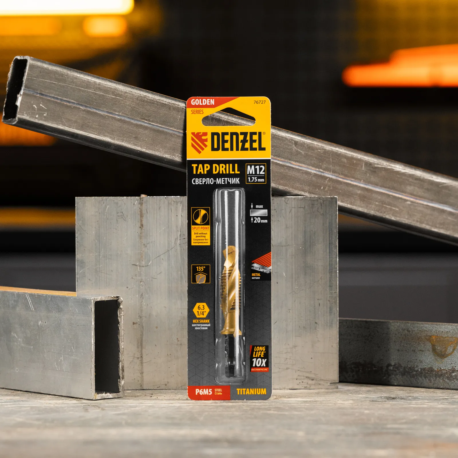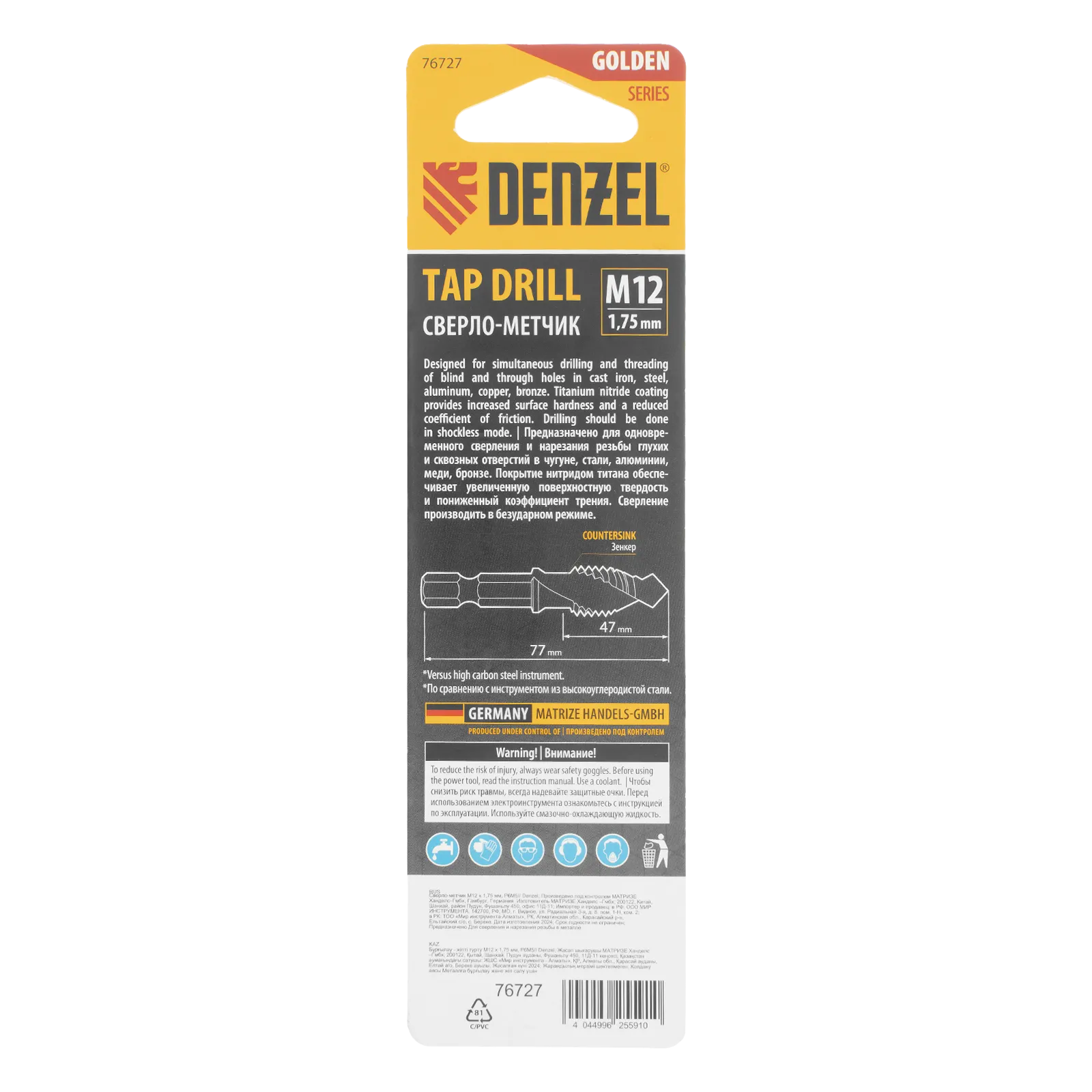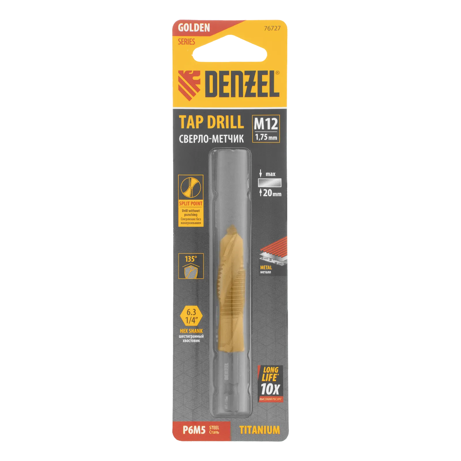 Сверло-метчик Denzel 76727 из стали P6M5 предназначено для получения глухих и сквозных отверстий в металлических заготовках с одновременным нарезанием правой резьбы M12 с шагом 1,75 мм. Позволяет существенно сэкономить время работы, объединив две операции в одну. Угол заточки 135° оптимален для работы с чугуном, сталью, алюминием, медью, бронзой. Ресурс оснастки увеличен в 10 раз по сравнению с аналогичными моделями из углеродистой стали.
