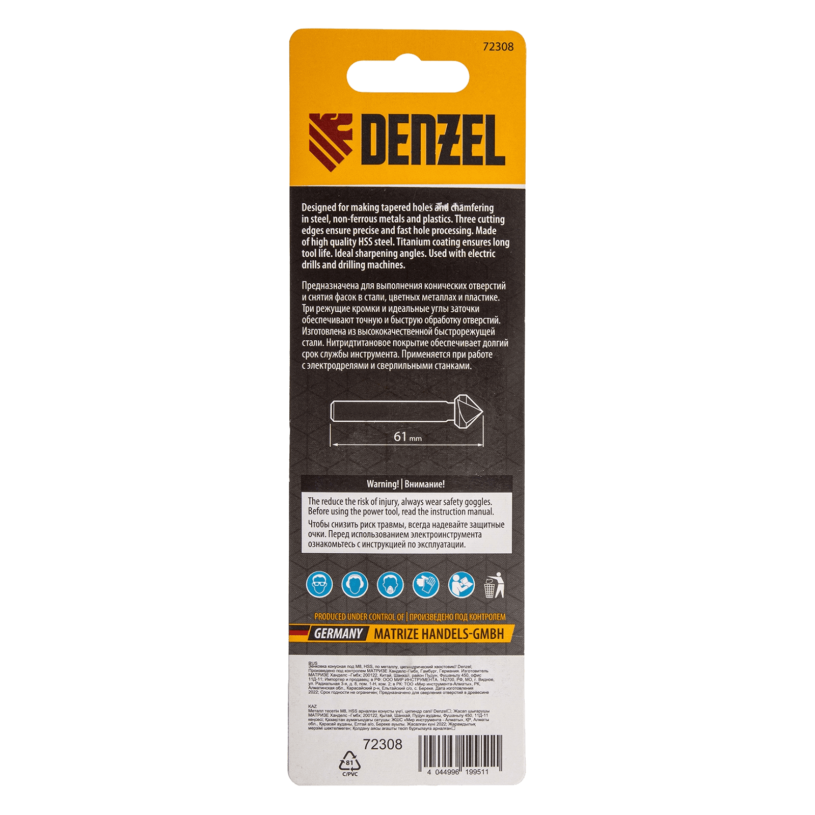 Конусная зенковка Denzel 72308 под болт M8, с 6-гранным хвостовиком, применяется для выполнения конических отверстий и снятия фасок в стали, цветных металлах, древесине и пластике. Устанавливается в патрон дрели или сверлильного станка. Три режущие кромки и идеальные углы заточки 90° обеспечивают точную и быструю обработку отверстий. Оснастка используется во время выполнения слесарных работ.