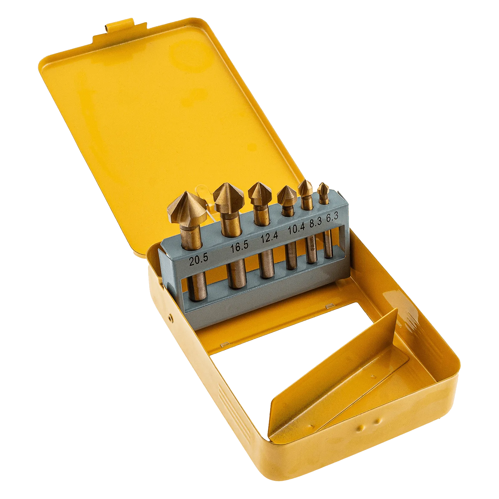 - Удобное хранение и транспортировка — зенковки упакованы в прочный металлический кейс.