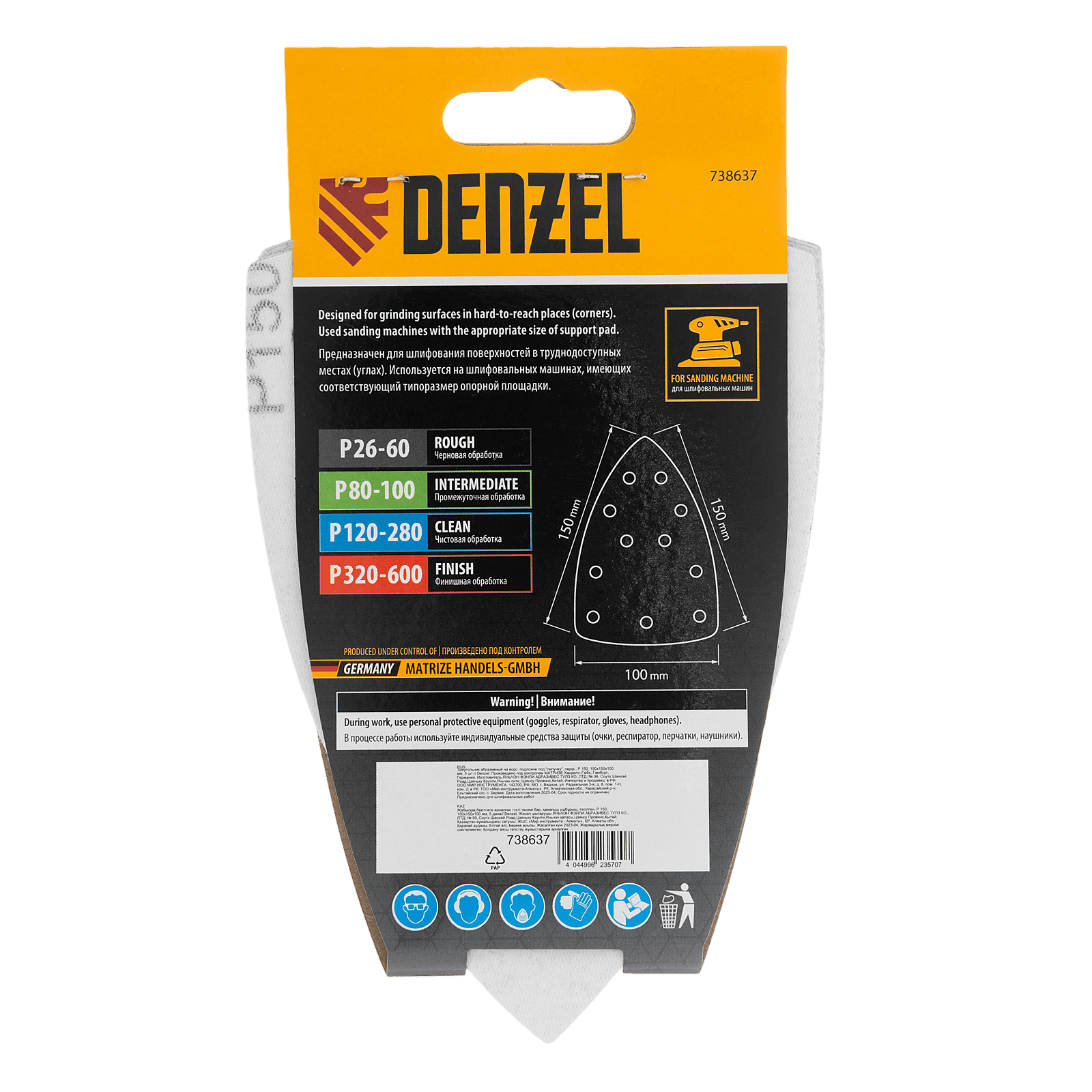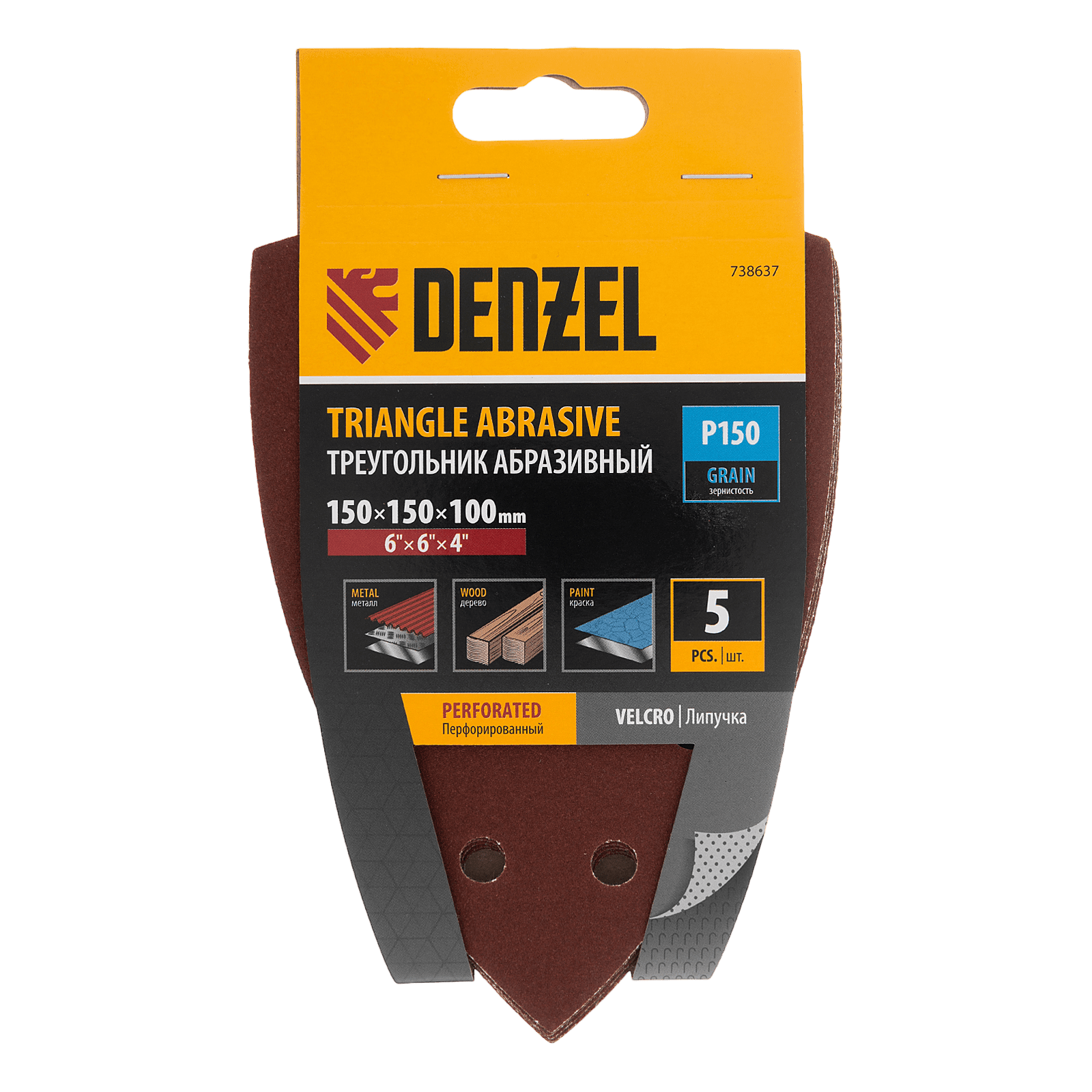 Абразивный перфорированный треугольник на ворсовой подложке «под липучку» Denzel 738637 размером 150 х 150 х 100 мм, 5 шт. в упаковке, имеет зернистость P 150 и предназначен для чистовой обработки металлических, деревянных и других деталей. Позволяет придать поверхности гладкость и подготовить ее к отделке, удобен для работы в углах и других труднодоступных местах. Треугольник совместим с плоскошлифовальной машиной Denzel 27614, также подходит для установки на другие шлифмашины с размером рабочей платформы 150 х 150 х 100 мм.