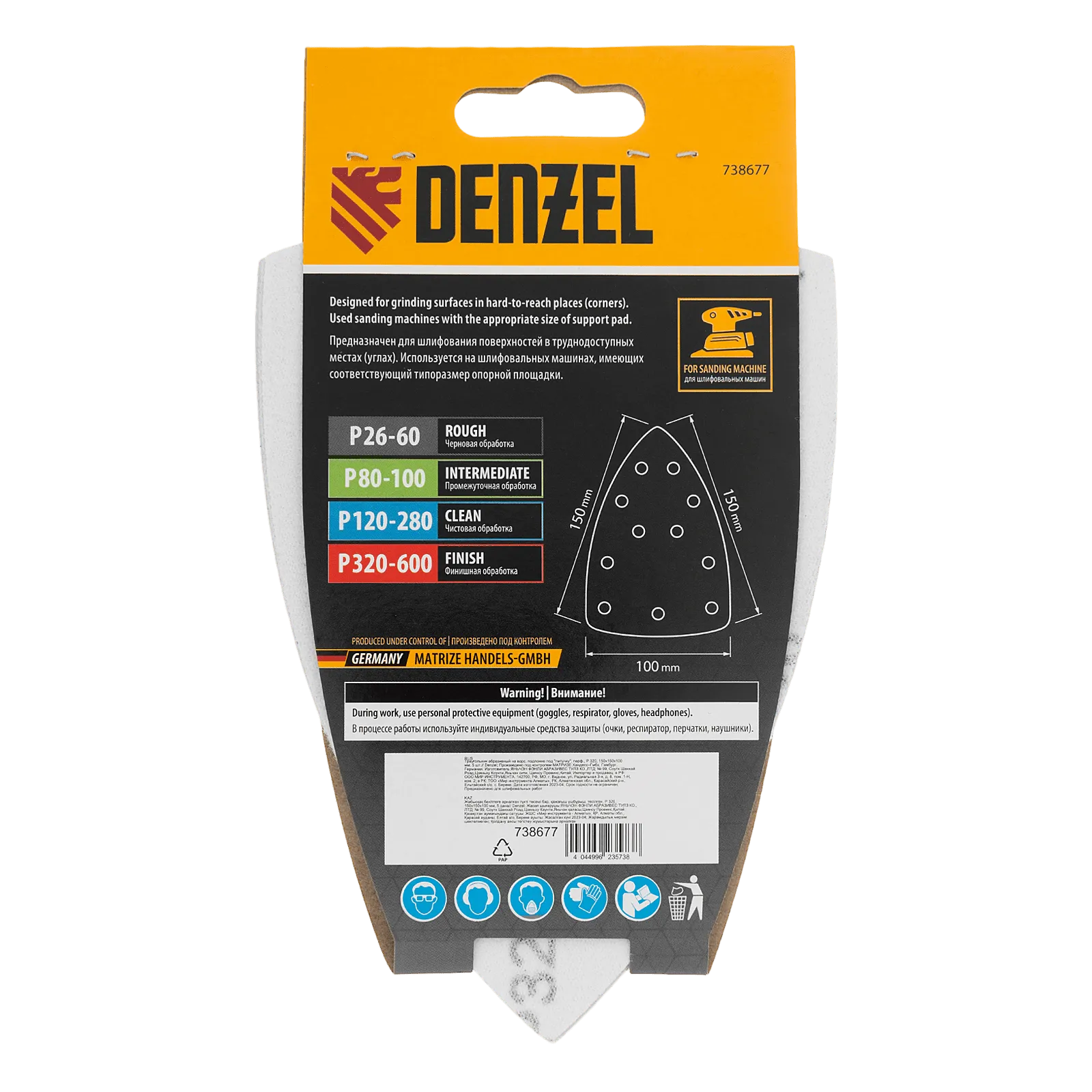 Абразивный перфорированный треугольник на ворсовой подложке «под липучку» Denzel 738677 размером 150 х 150 х 100 мм, 5 шт. в упаковке, имеет зернистость P 320 и предназначен для финишной обработки металлических, деревянных и других деталей. Позволяет устранять с поверхности мельчайшие шероховатости, удобен для работы в углах и других труднодоступных местах. Треугольник совместим с плоскошлифовальной машиной Denzel 27614, также подходит для установки на другие шлифмашины с размером рабочей платформы 150 х 150 х 100 мм.