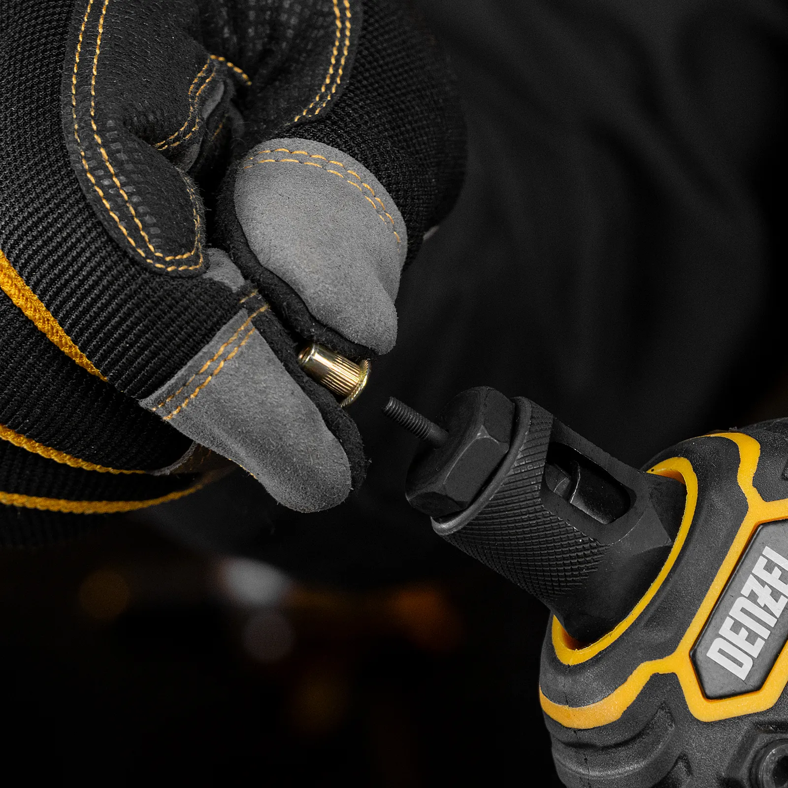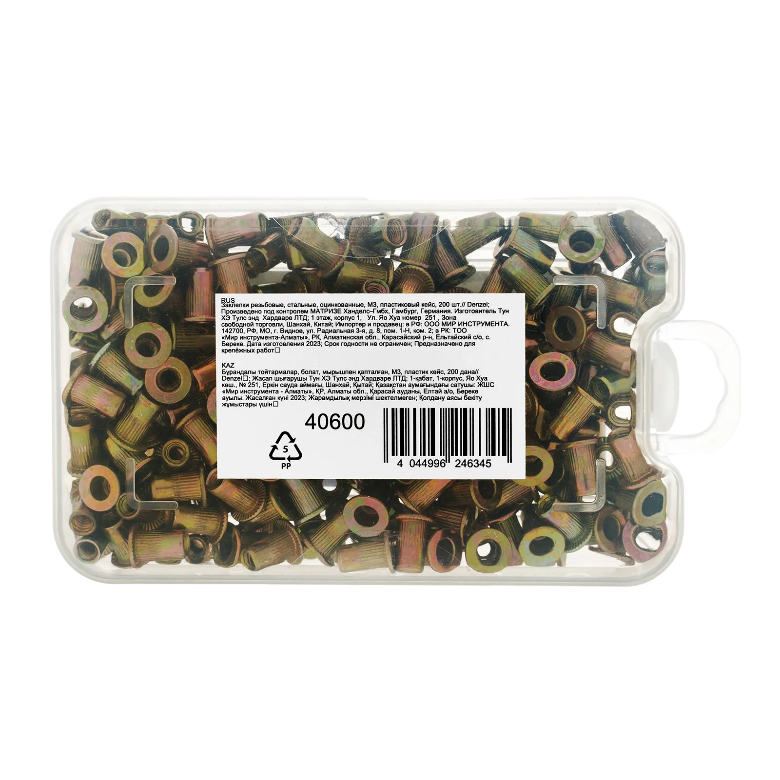 Стальные резьбовые заклепки Denzel 40600, с резьбой M3, оцинкованные, предназначены для скрепления листовых материалов толщиной 0,5-1,5 мм. Совместимы с заклепочником Denzel 40501. Позволяют получить резьбовое соединение даже при одностороннем доступе к месту крепления. Крепежные элементы используются для проведения строительных и монтажных работ, пригодятся на даче и в гараже.