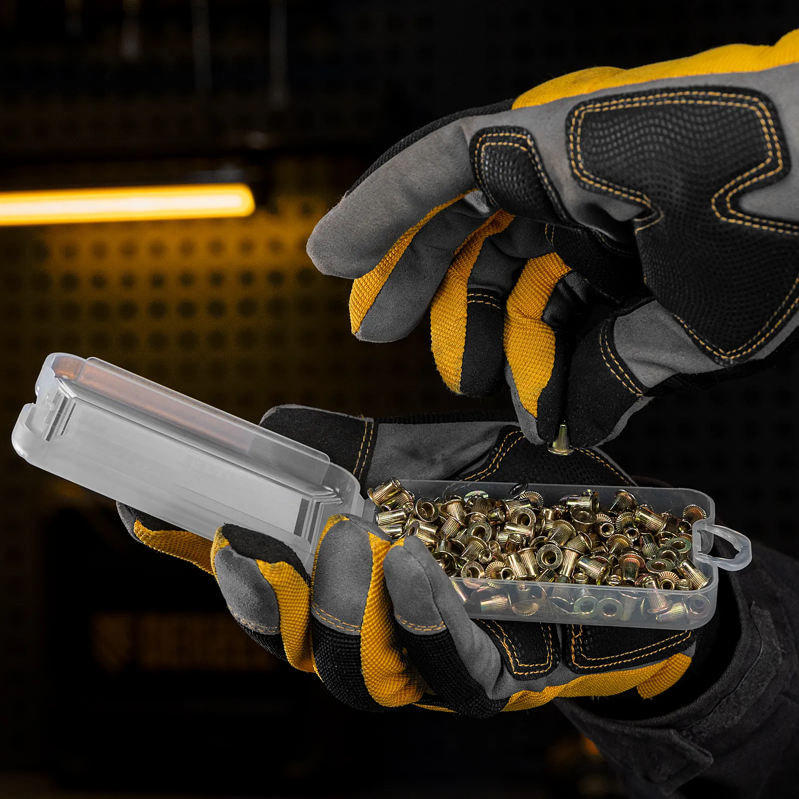 - Удобное хранение и транспортировка — заклепки поставляются в прочном пластиковом кейсе с защелкой.