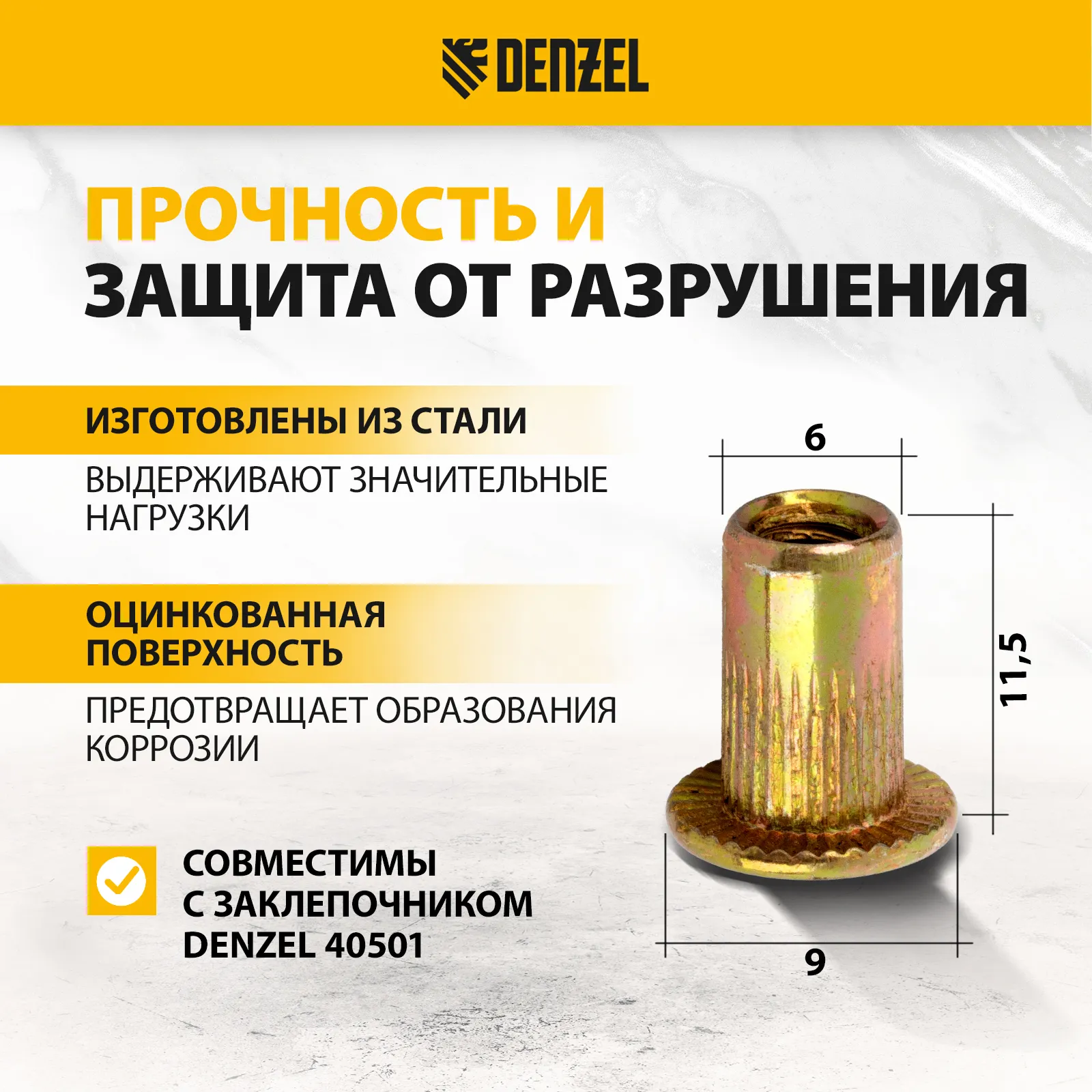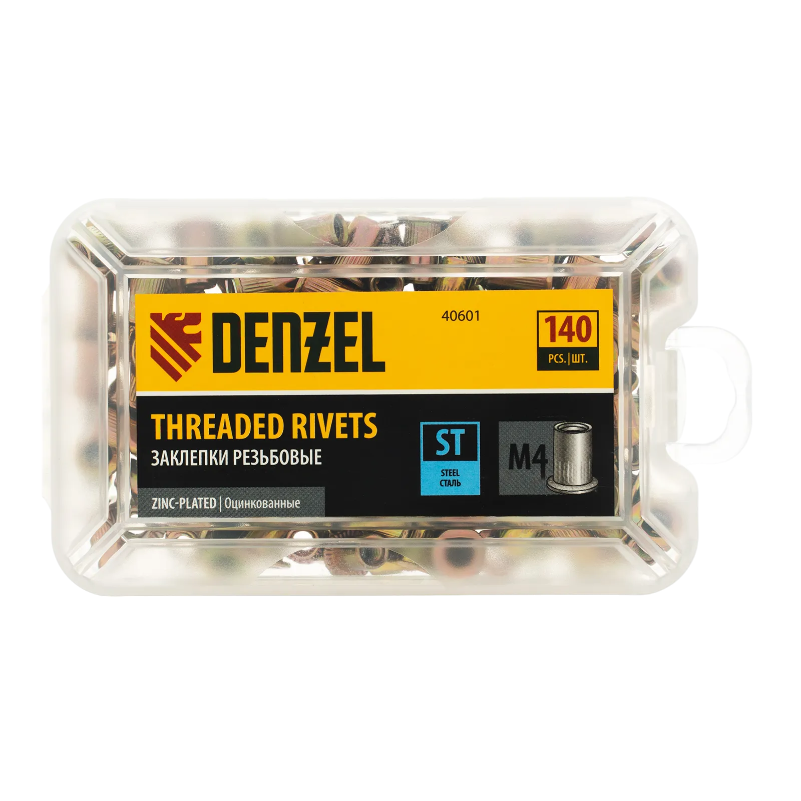 Стальные резьбовые заклепки Denzel 40601, с резьбой M4, оцинкованные, предназначены для скрепления листовых материалов толщиной 0,5-2 мм. Совместимы с заклепочником Denzel 40501. Позволяют получить резьбовое соединение даже при одностороннем доступе к месту крепления. Крепежные элементы используются для проведения строительных и монтажных работ, пригодятся на даче и в гараже.