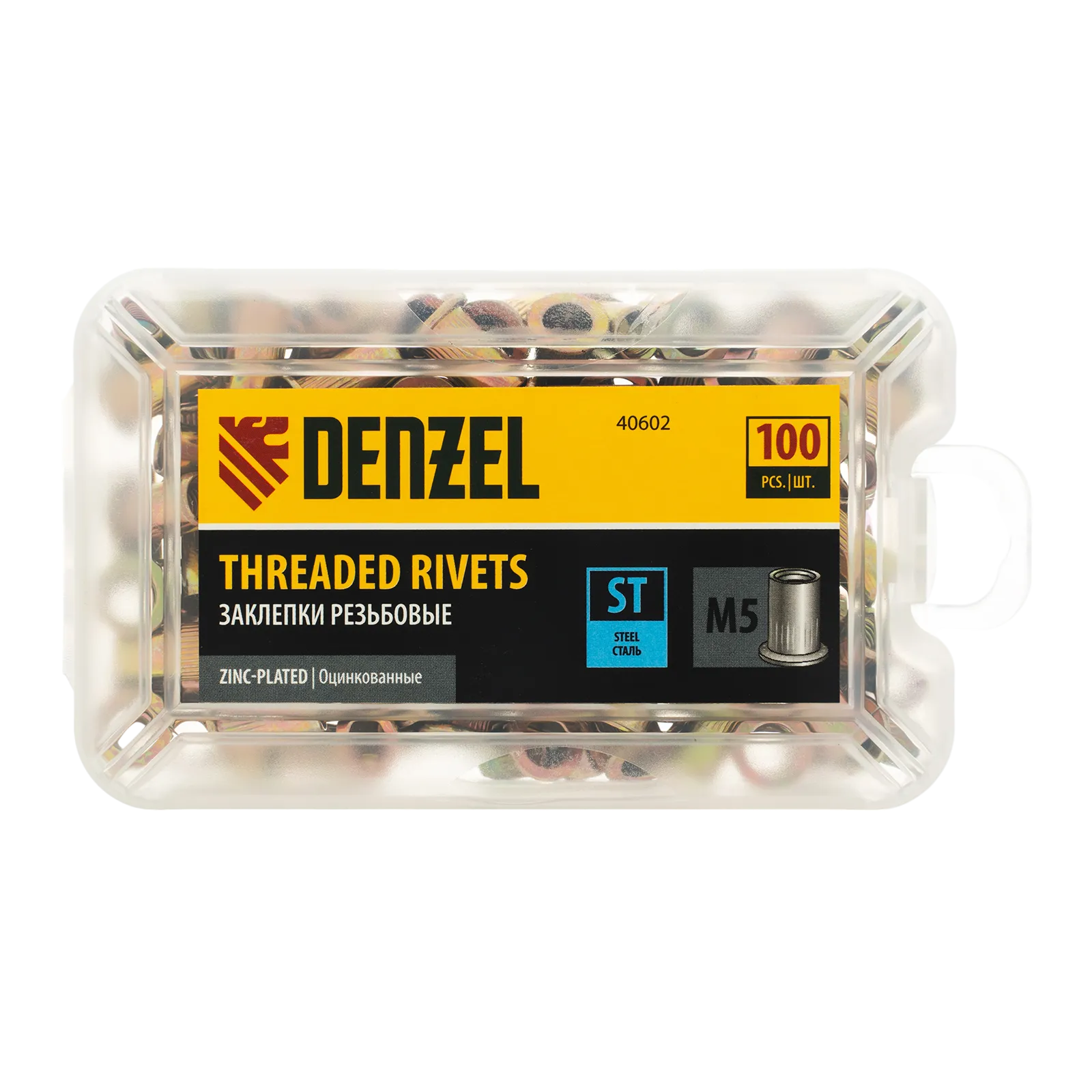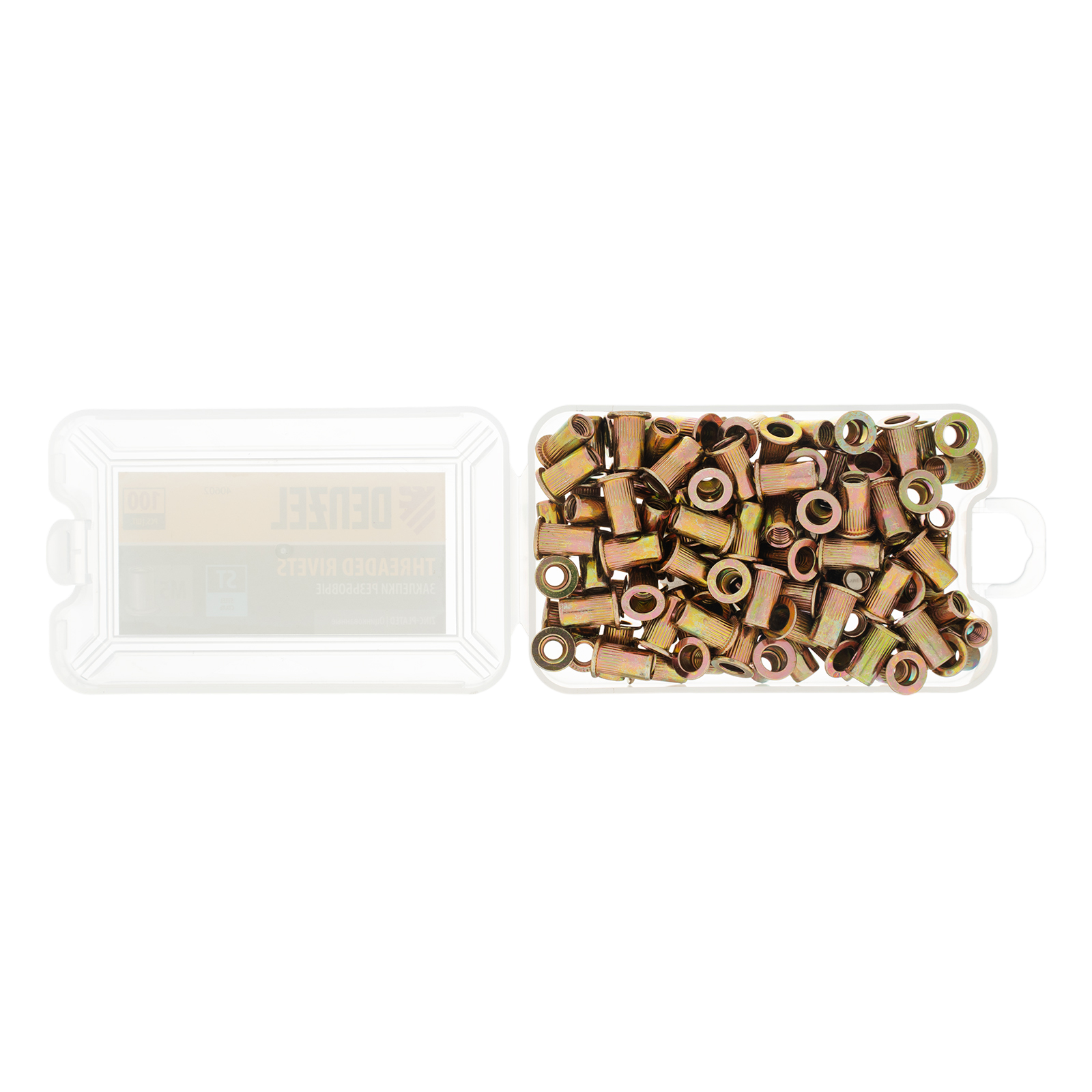 Стальные резьбовые заклепки Denzel 40602, с резьбой M5, оцинкованные, предназначены для скрепления листовых материалов толщиной 0,5-2,5 мм. Совместимы с заклепочником Denzel 40501. Позволяют получить резьбовое соединение даже при одностороннем доступе к месту крепления. Крепежные элементы используются для проведения строительных и монтажных работ, пригодятся на даче и в гараже.