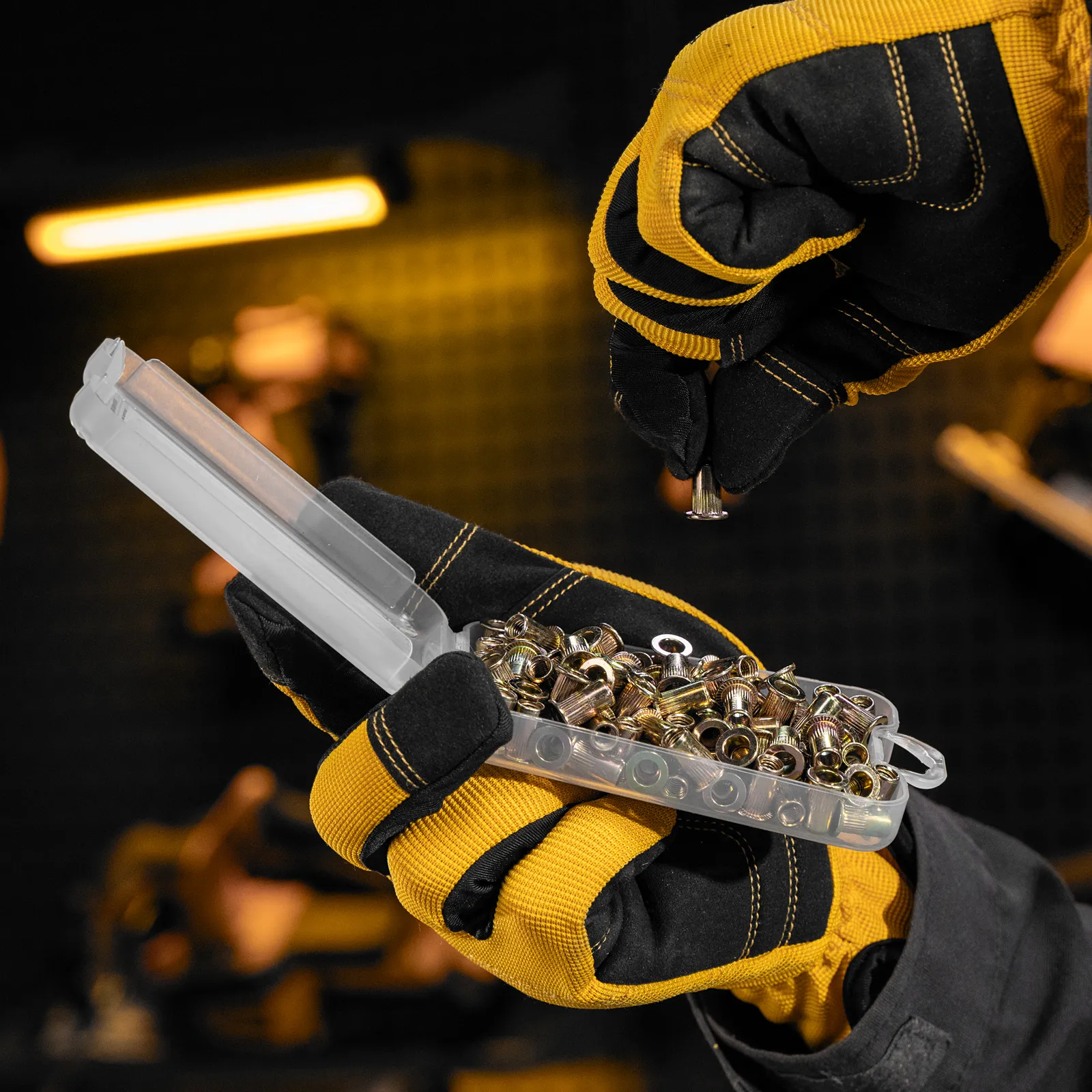 - Удобное хранение и транспортировка — заклепки поставляются в прочном пластиковом кейсе с защелкой.