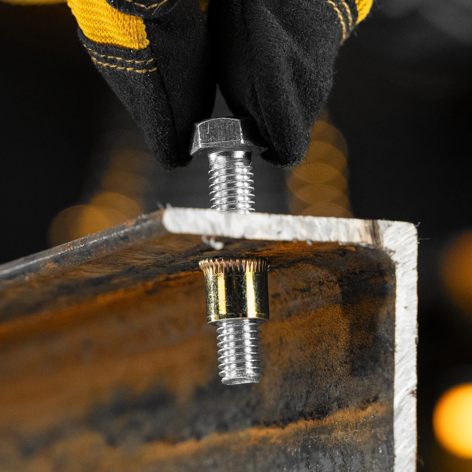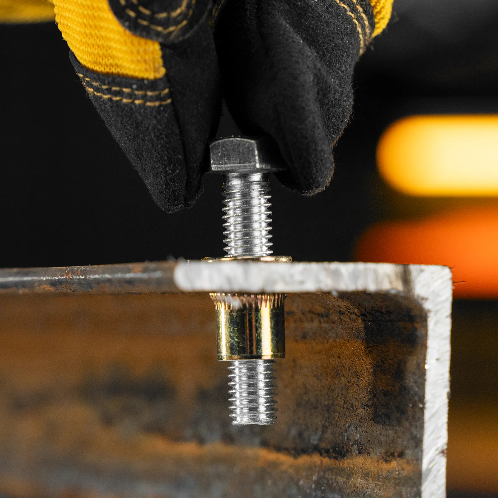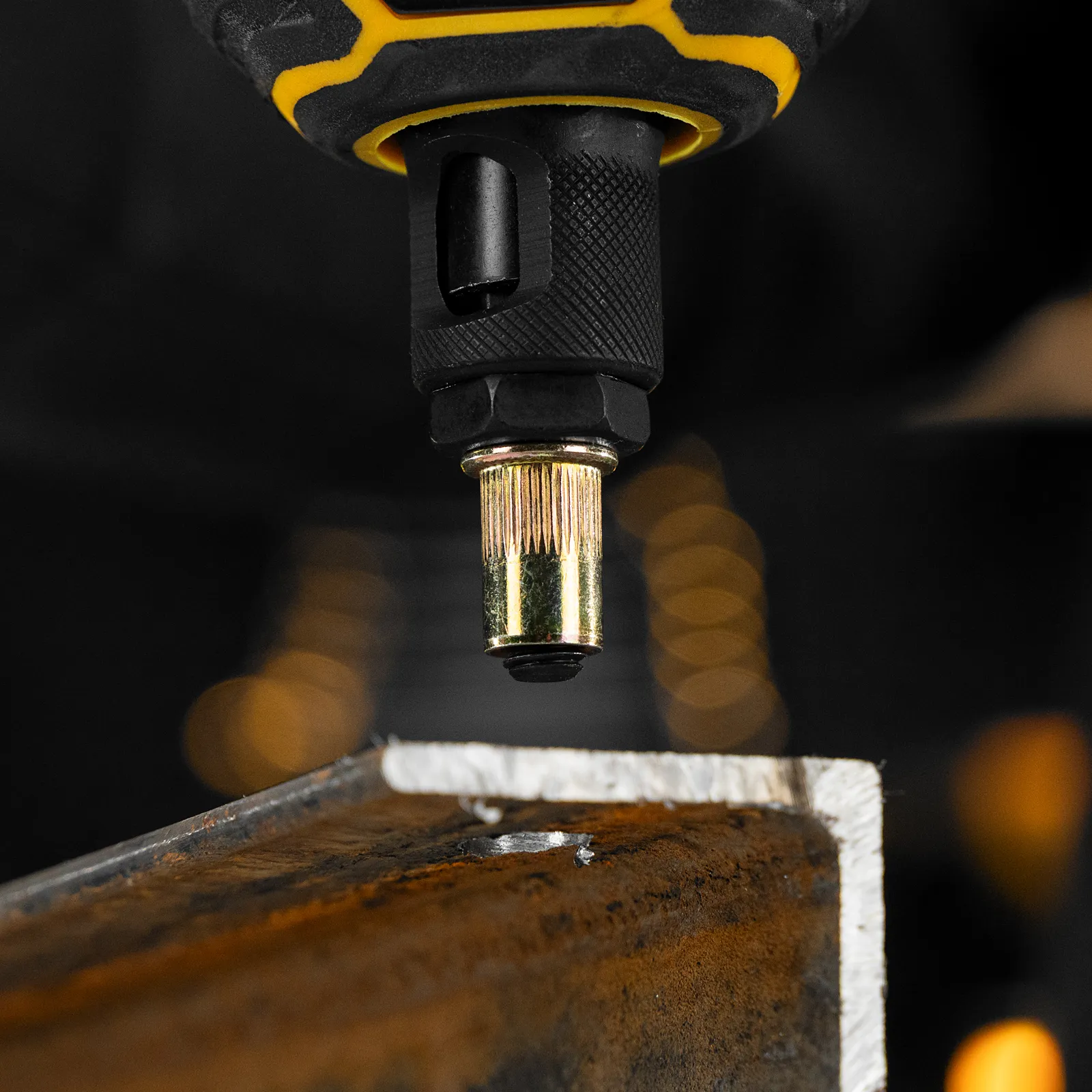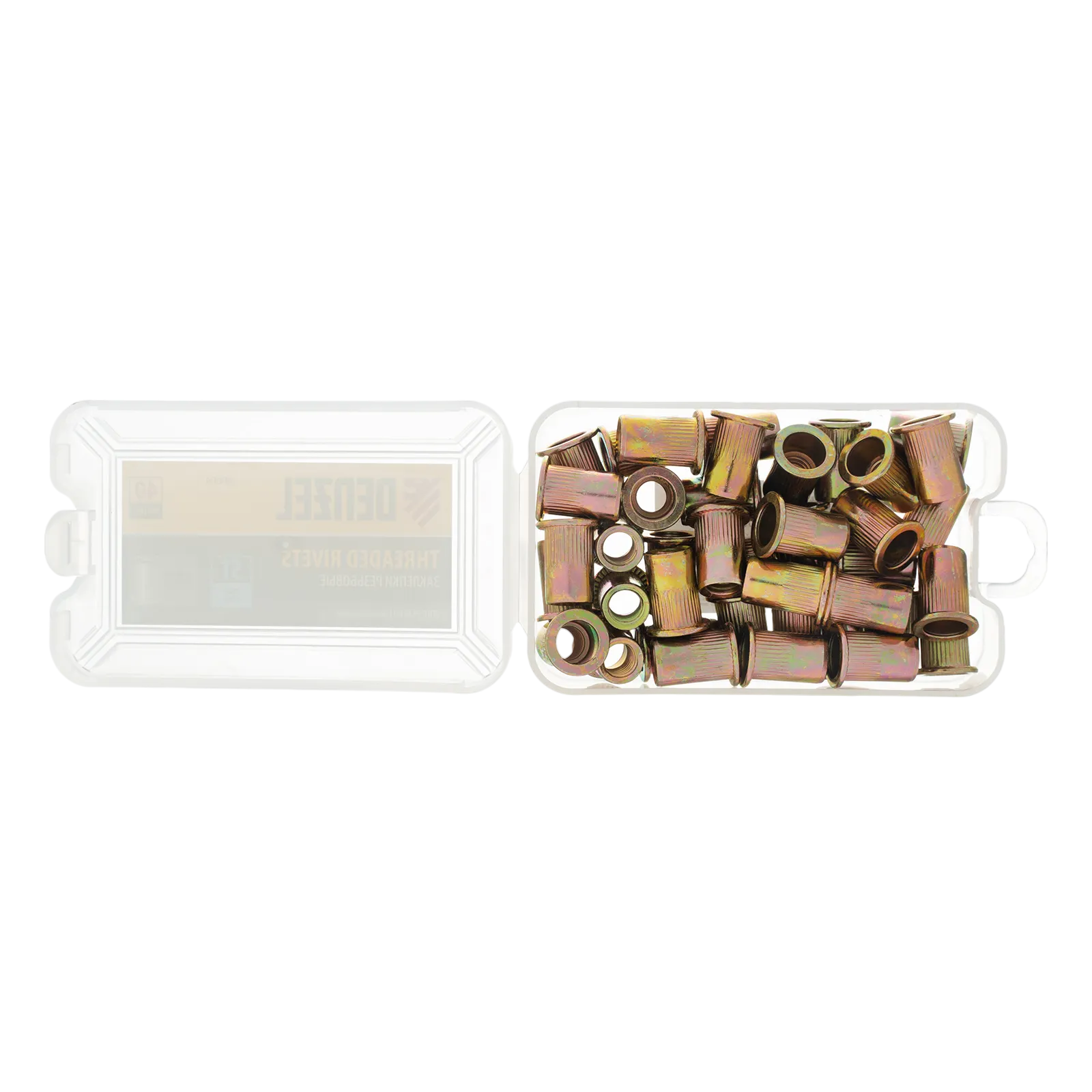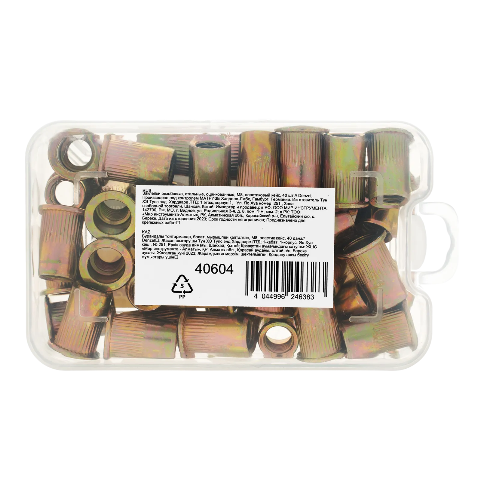 Стальные резьбовые заклепки Denzel 40604, с резьбой M8, оцинкованные, предназначены для скрепления листовых материалов толщиной 1,5-3,5 мм. Совместимы с заклепочником Denzel 40501. Позволяют получить резьбовое соединение даже при одностороннем доступе к месту крепления. Крепежные элементы используются для проведения строительных и монтажных работ, пригодятся на даче и в гараже.