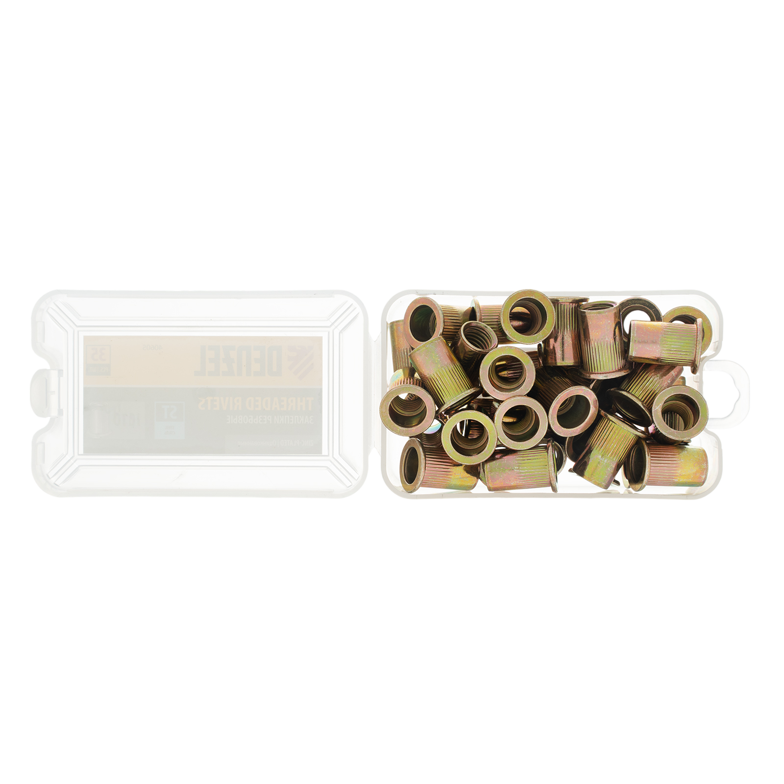 Стальные резьбовые заклепки Denzel 40605 с резьбой M10, оцинкованные, предназначены для скрепления листовых материалов толщиной 1-4 мм. Совместимы с заклепочником Denzel 40501. Позволяют получить резьбовое соединение даже при одностороннем доступе к месту крепления. Крепежные элементы используются для проведения строительных и монтажных работ, пригодятся на даче и в гараже.