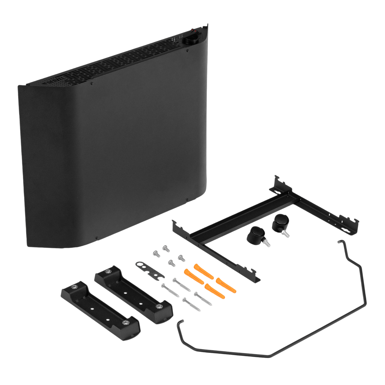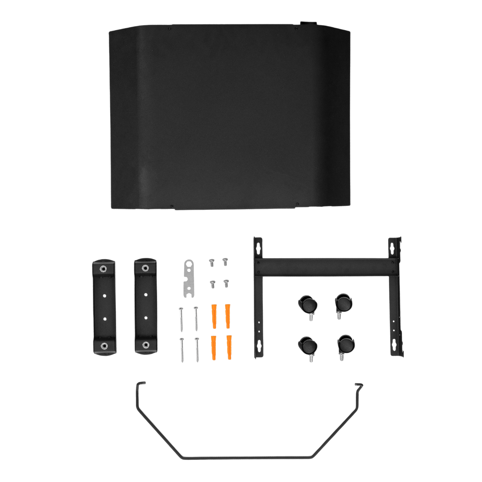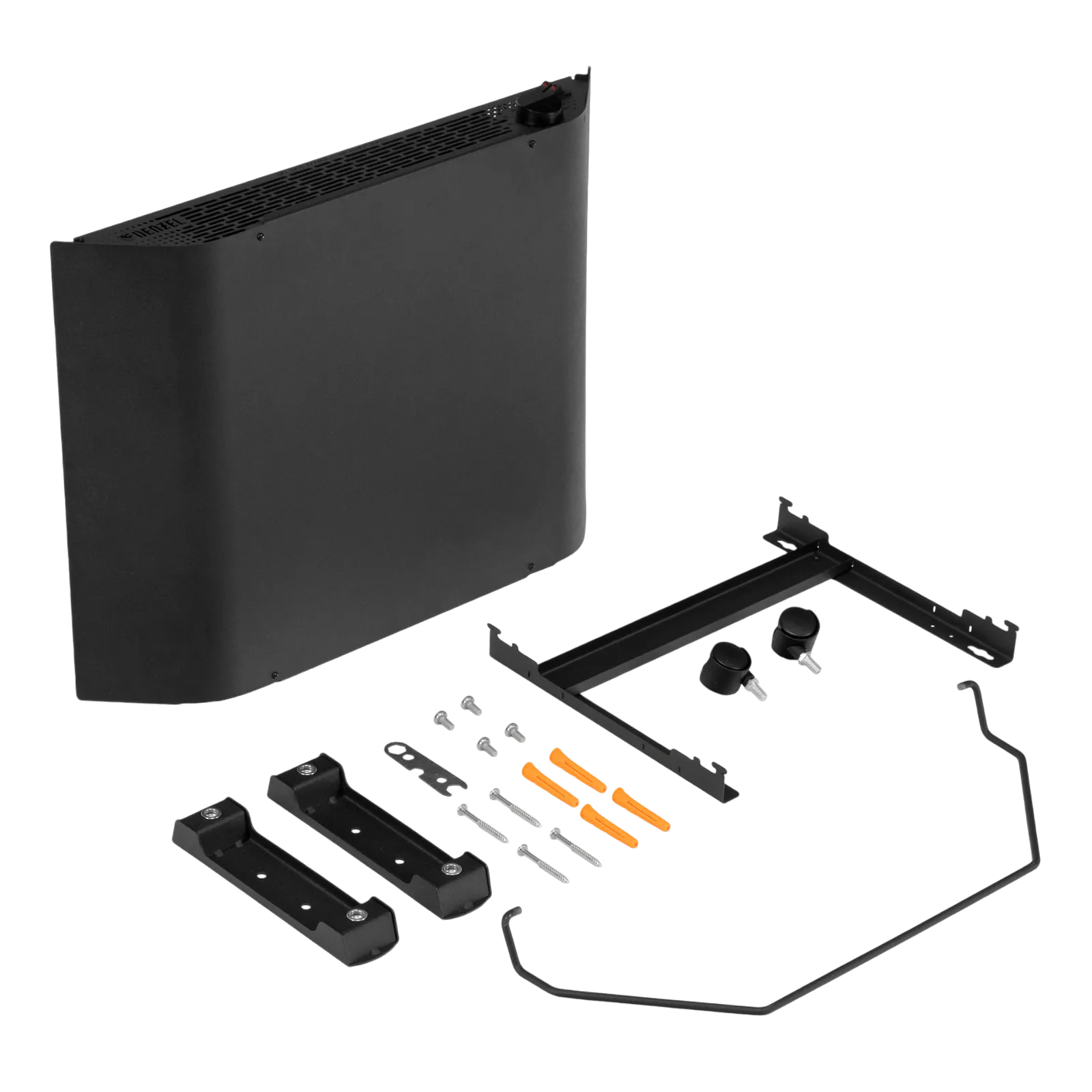 - Напольная или настенная установка — в комплект поставки включена цельнометаллическая крепежная рамка для стены, а также стальные ножки с колесами.