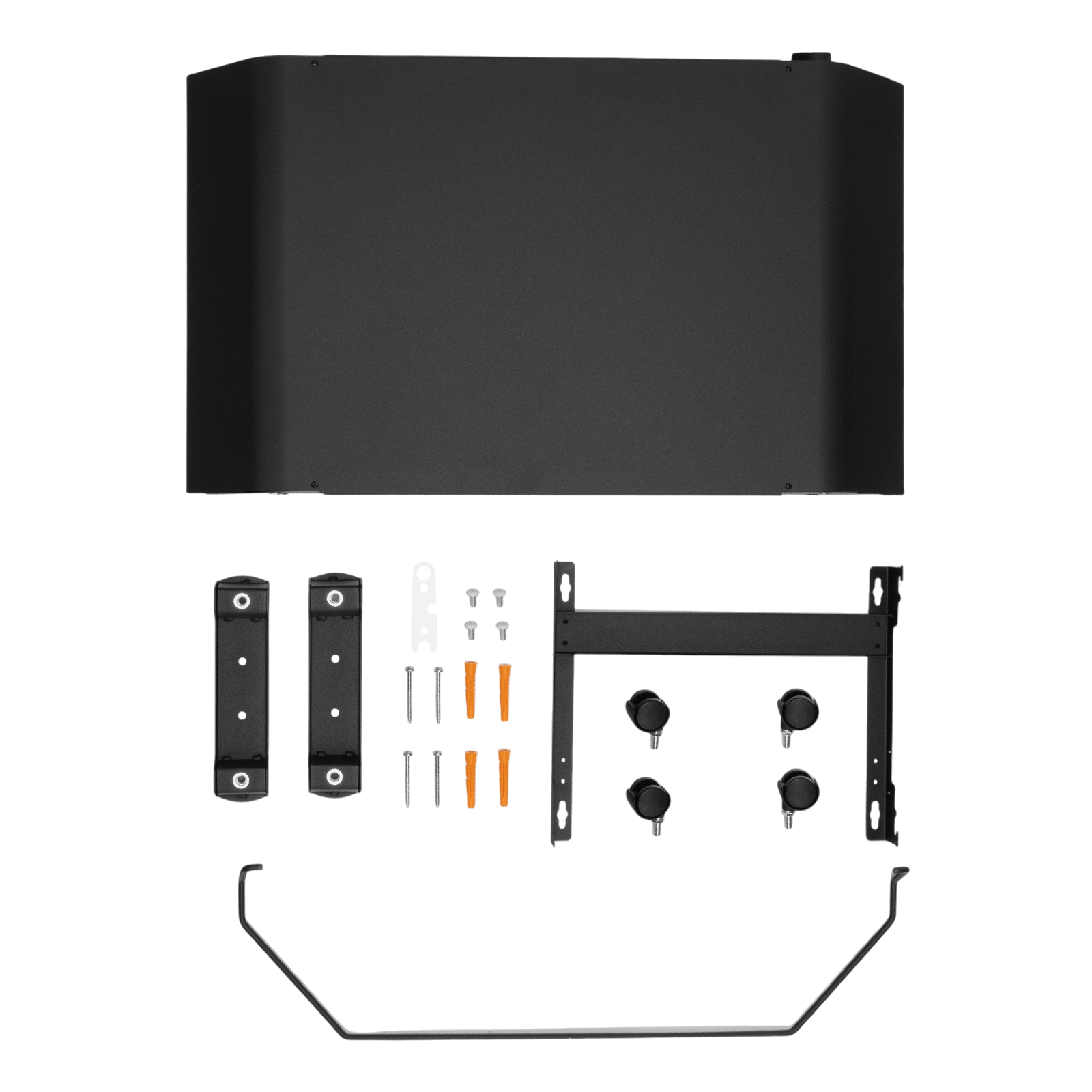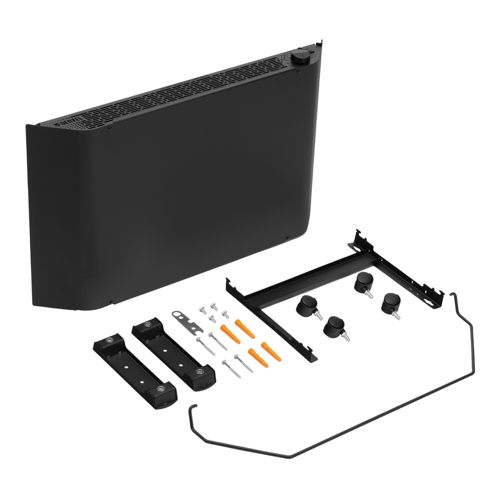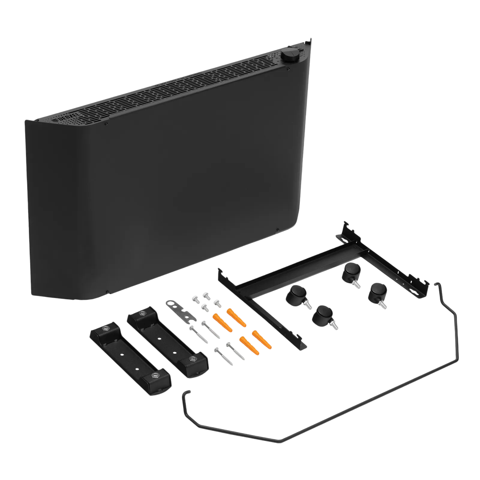 - Напольная или настенная установка — в комплект поставки включена цельнометаллическая крепежная рамка для стены, а также стальные ножки с колесами.