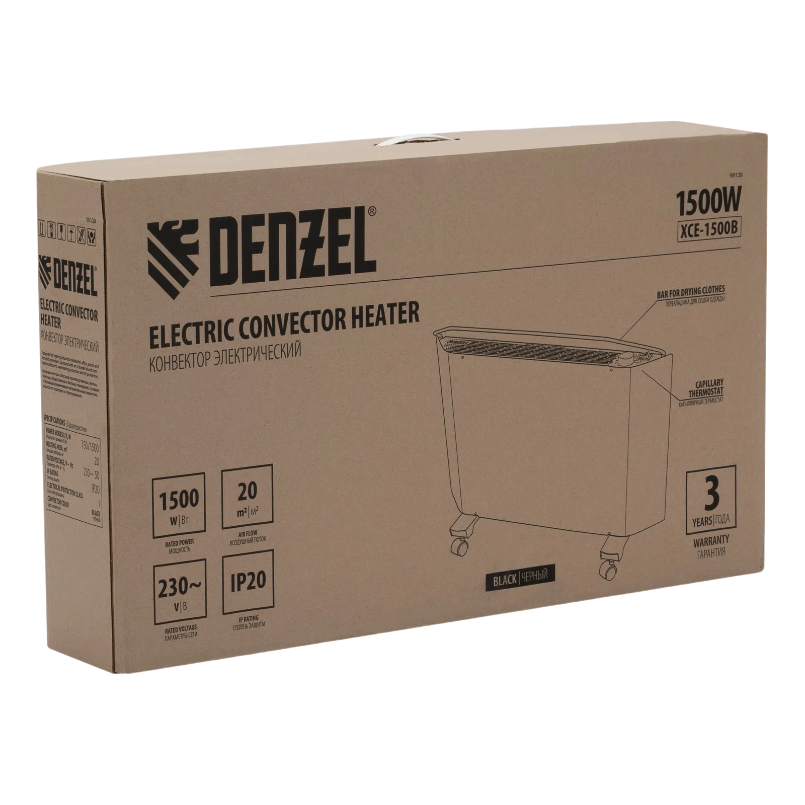 Электрический конвектор Denzel XCE-1500B 98128 черного цвета, максимальной мощностью 1500 Вт, с сушилкой для одежды, колесами и X-образным нагревательным элементом, работает от сети 230 В и предназначен для обогрева закрытых помещений площадью до 20 м2. Надежный и долговечный X-образный нагревательный элемент обеспечивает быстрый нагрев до необходимой температуры.