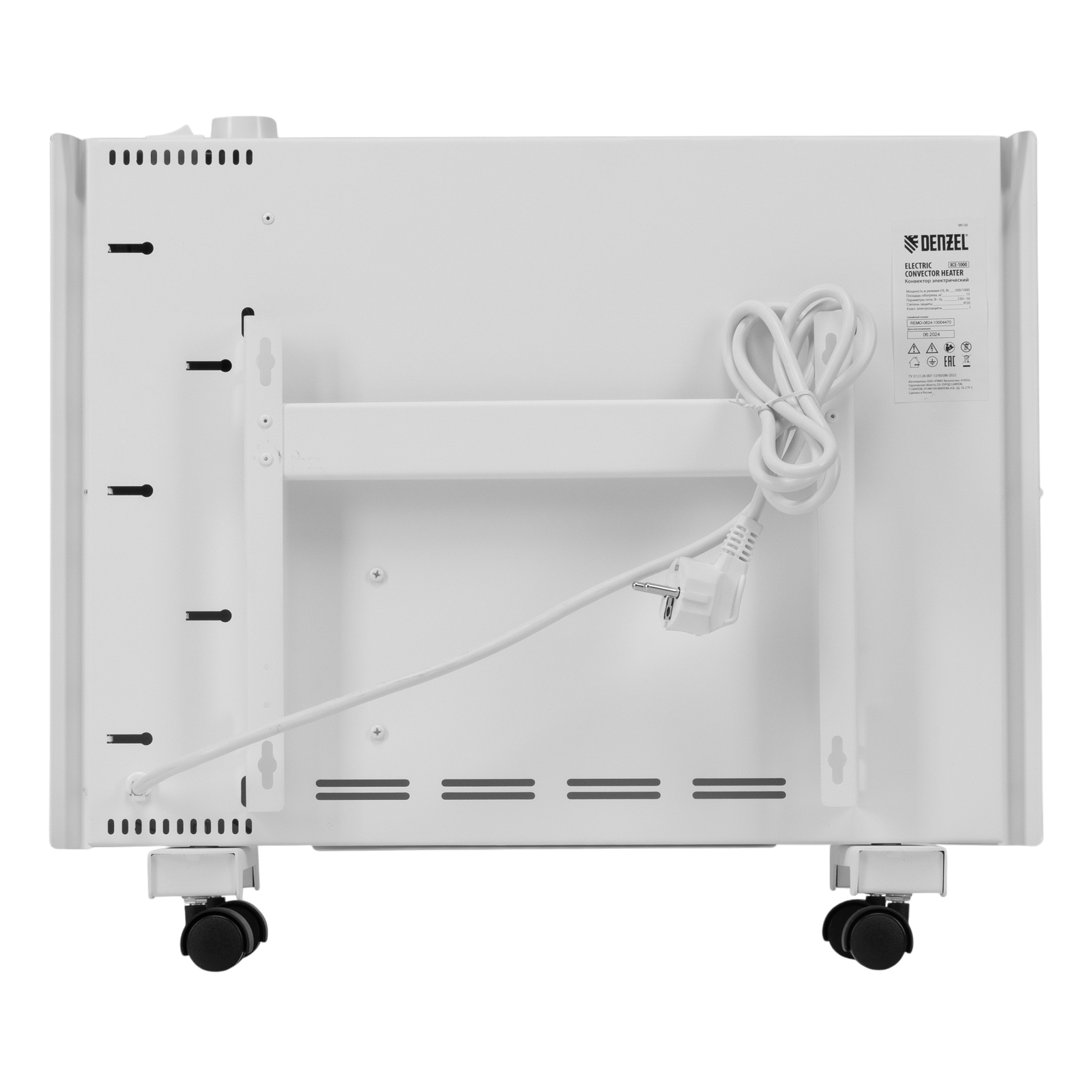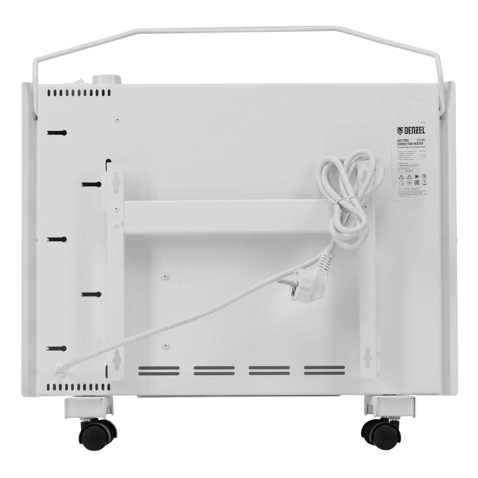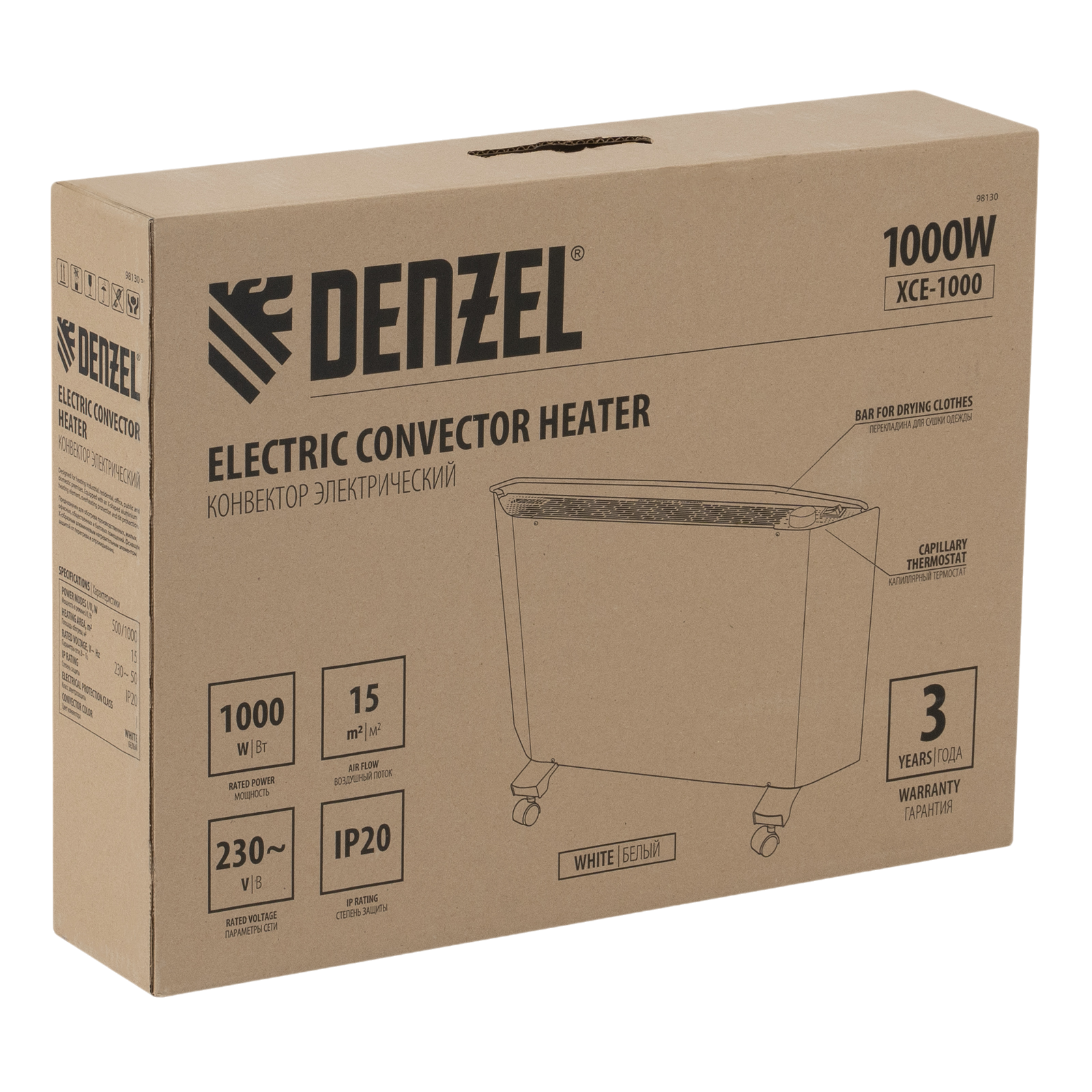 Электрический конвектор Denzel XCE-1000 98130 белого цвета, максимальной мощностью 1000 Вт, с сушилкой для одежды, колесами и X-образным нагревательным элементом, работает от сети 230 В и предназначен для обогрева закрытых помещений площадью до 15 м2. Надежный и долговечный X-образный нагревательный элемент обеспечивает быстрый нагрев до необходимой температуры.