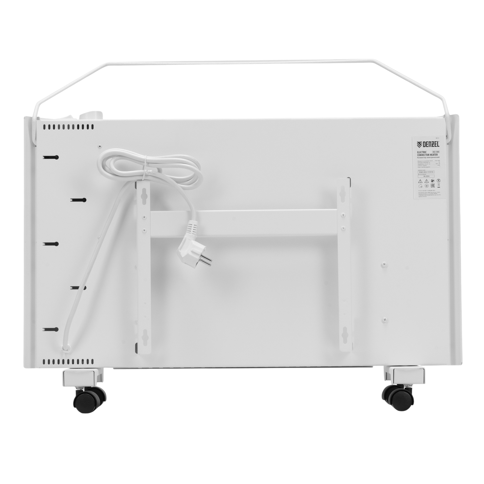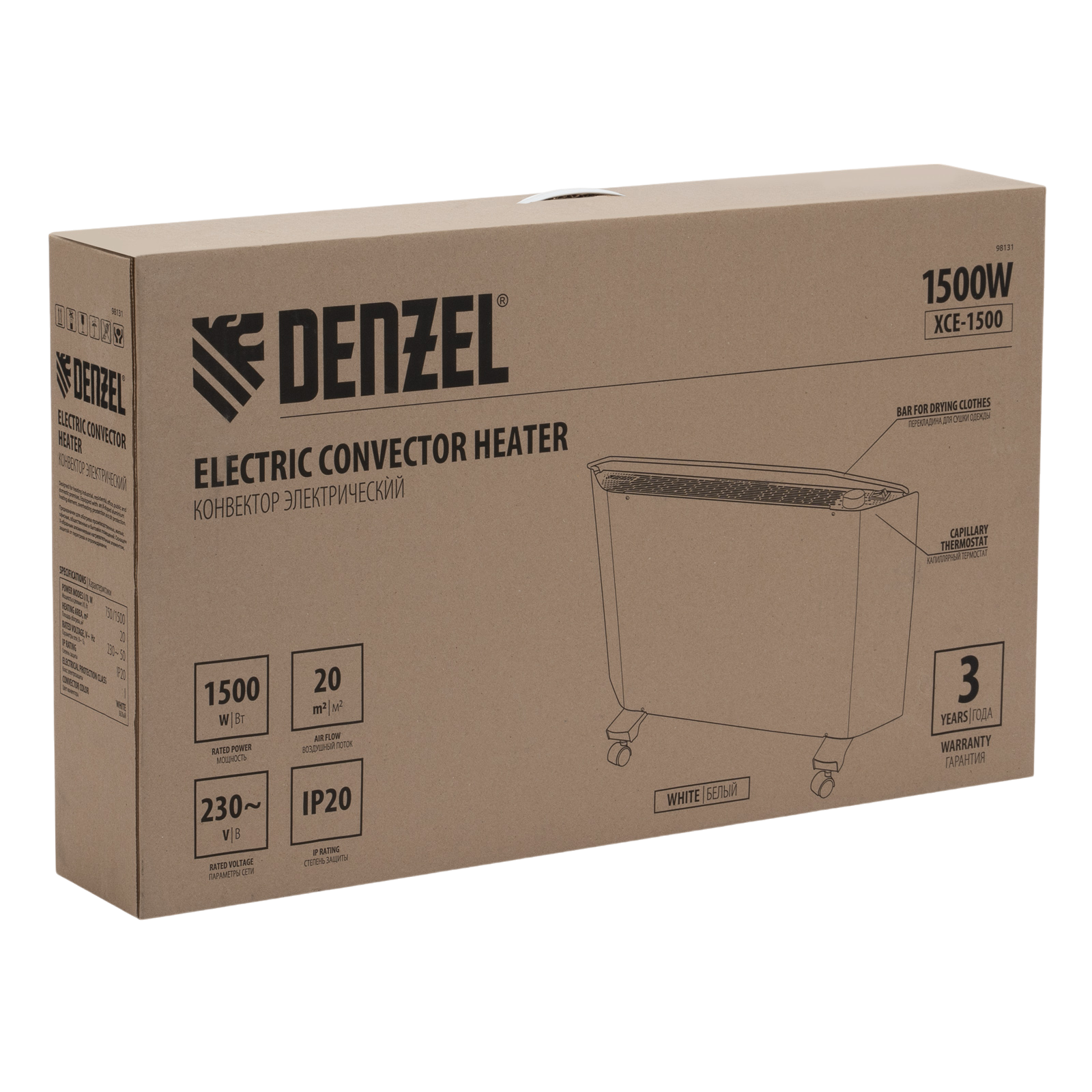 Электрический конвектор Denzel XCE-1500 98131 белого цвета, максимальной мощностью 1500 Вт, с сушилкой для одежды, колесами и X-образным нагревательным элементом, работает от сети 230 В и предназначен для обогрева закрытых помещений площадью до 20 м2. Надежный и долговечный X-образный нагревательный элемент обеспечивает быстрый нагрев до необходимой температуры.