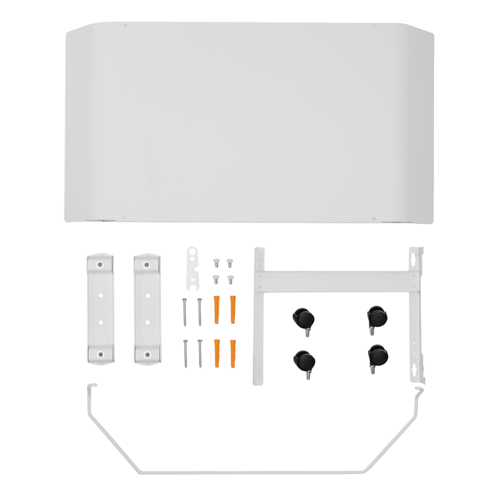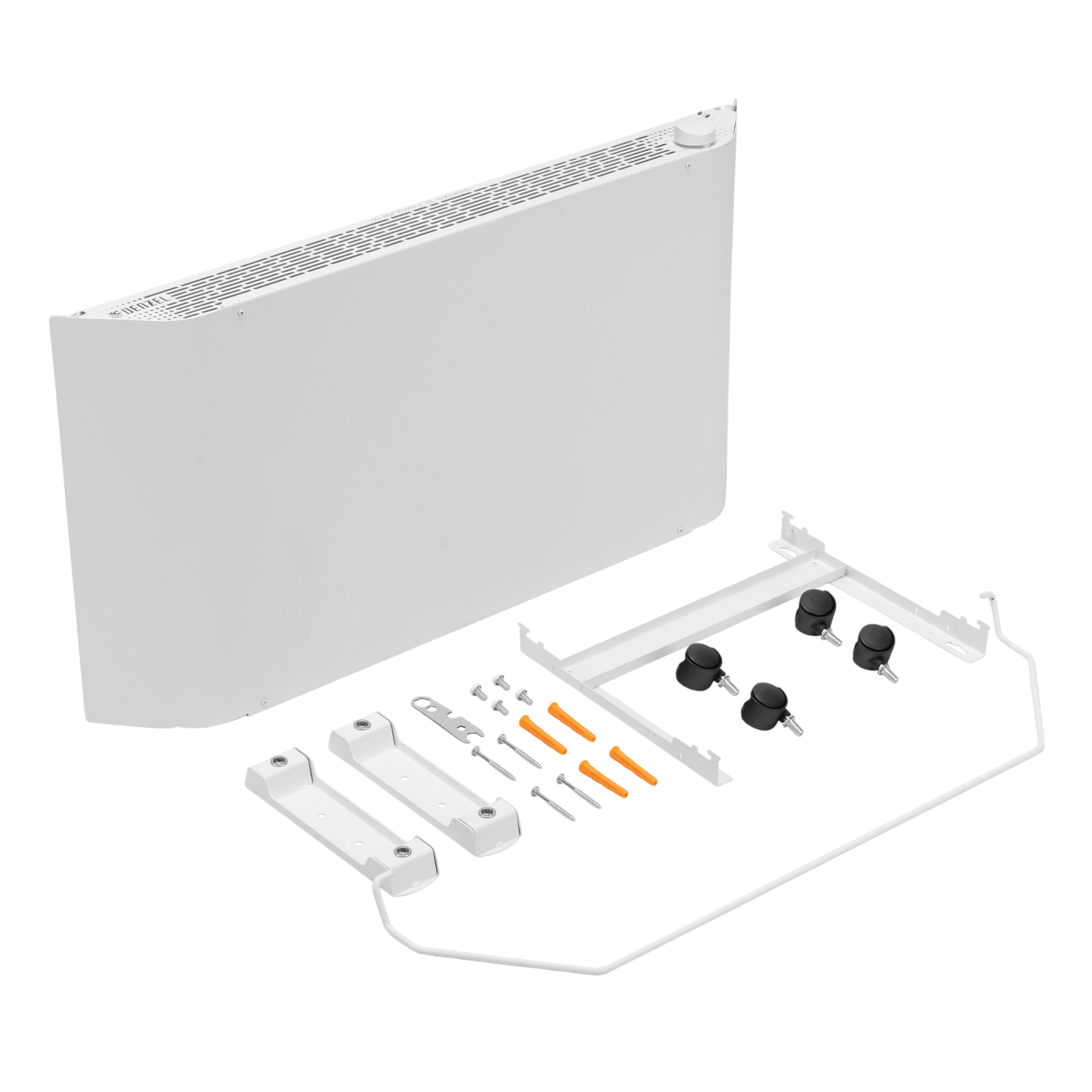 - Напольная или настенная установка — в комплект поставки включена цельнометаллическая крепежная рамка для стены, а также стальные ножки с колесами.