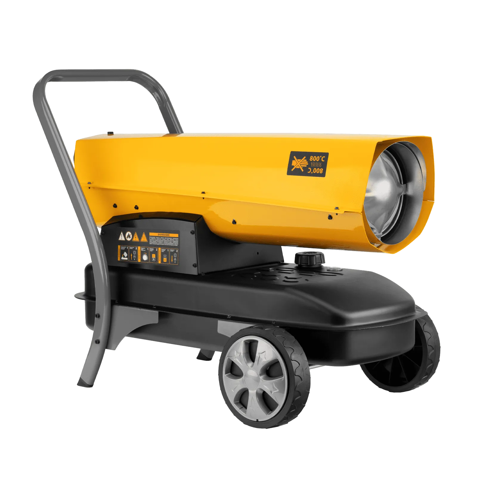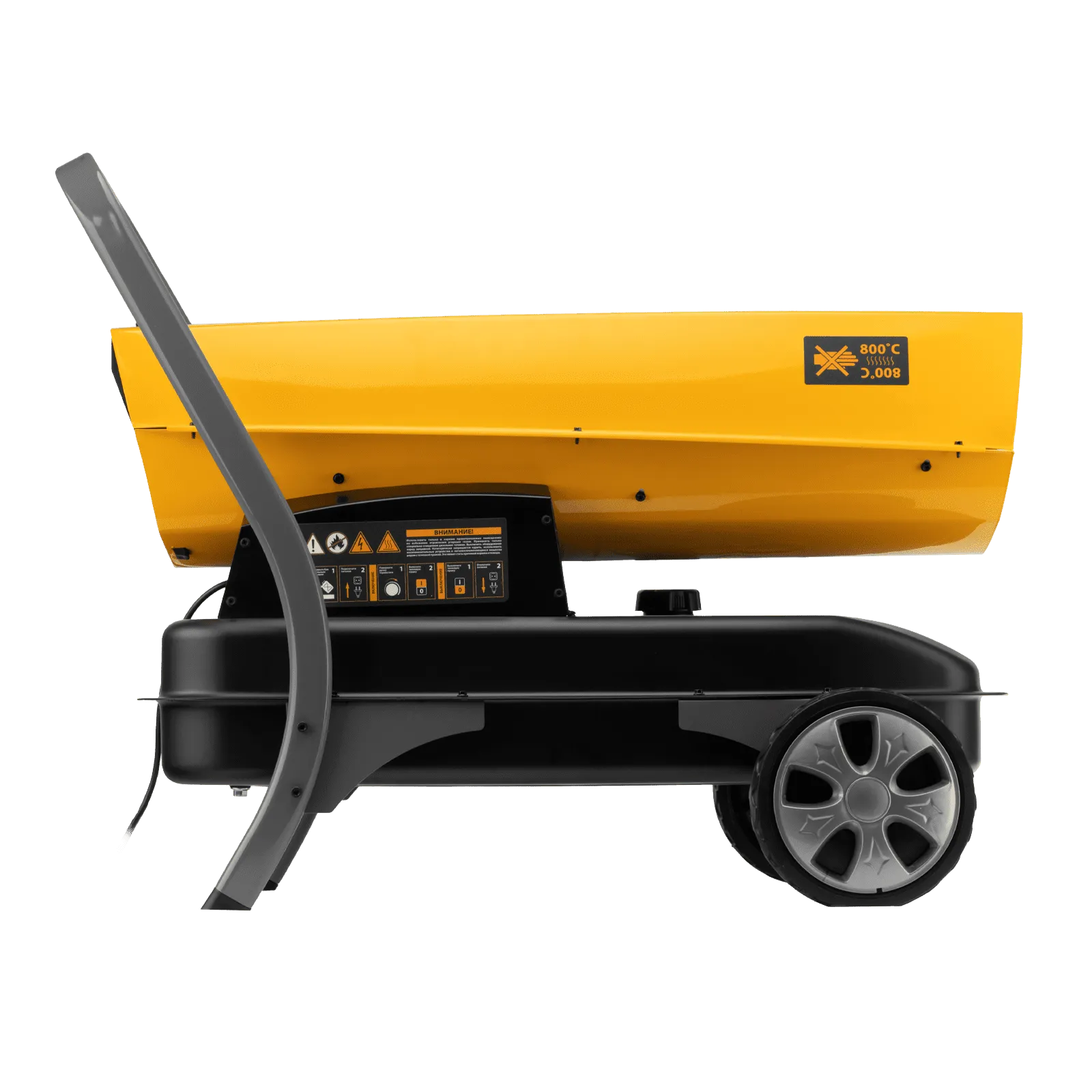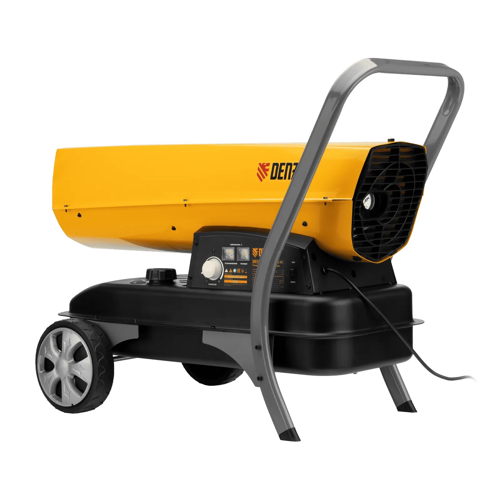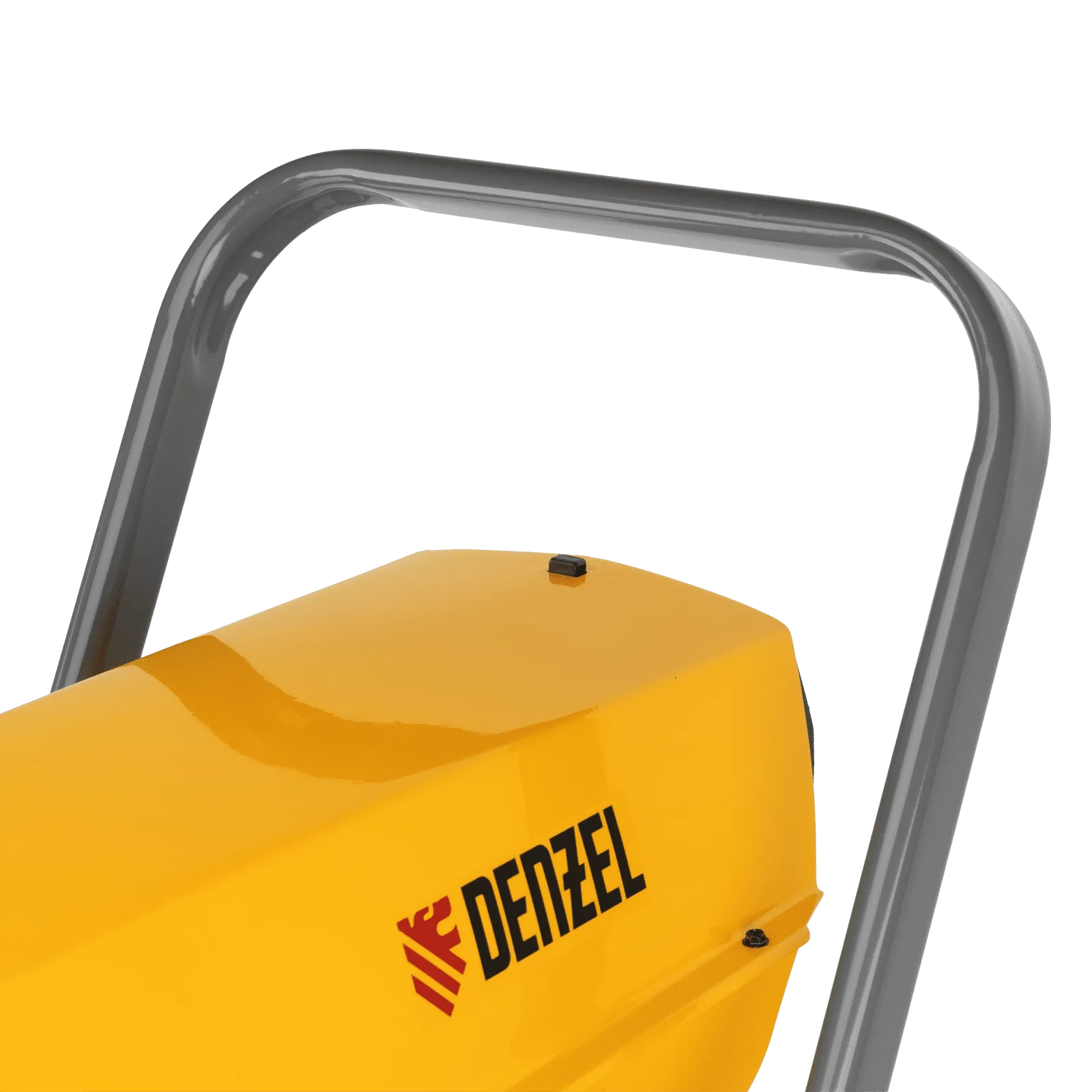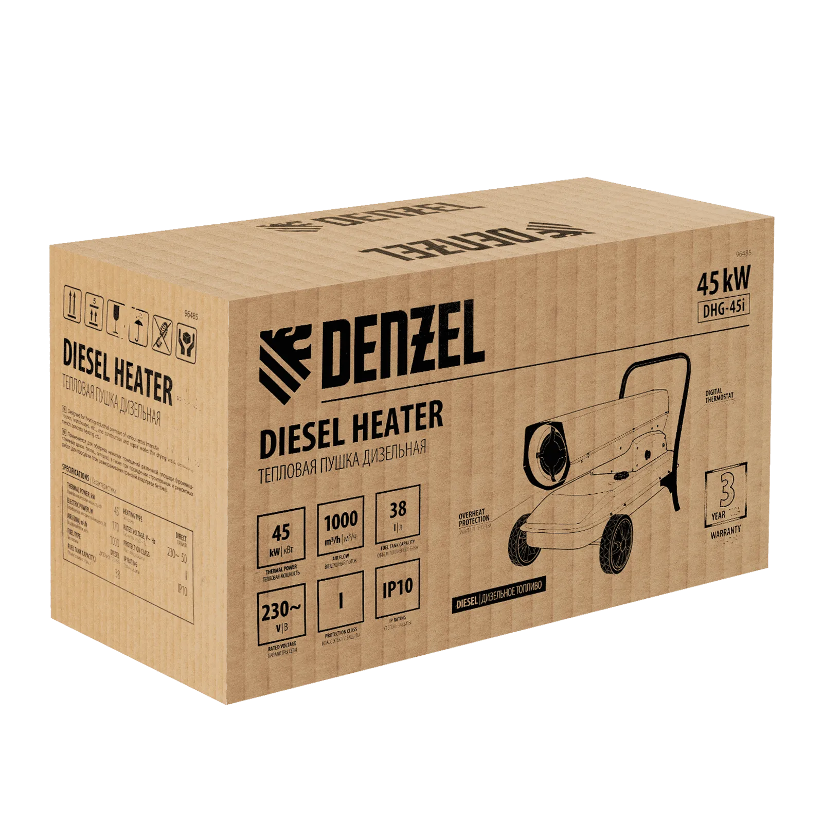 Дизельная тепловая пушка Denzel DHG-45i 96485 номинальной тепловой мощностью 45 кВт и производительностью 1000 куб. м/ч, с прямым типом нагрева, с электронным термостатом, предназначена для обогрева цехов, складов, теплиц и других нежилых помещений. Используется в строительстве и на производстве. Пушка характеризуется низким расходом топлива: полного бака хватает более чем на 9 часов работы. Важно: в обогреваемом помещении необходимо обеспечить хорошую вентиляцию.