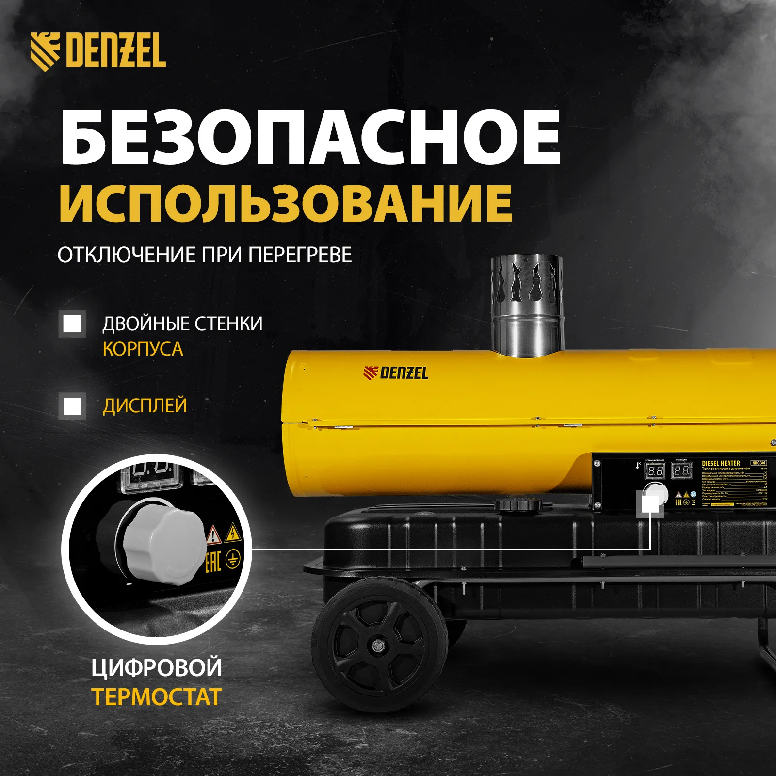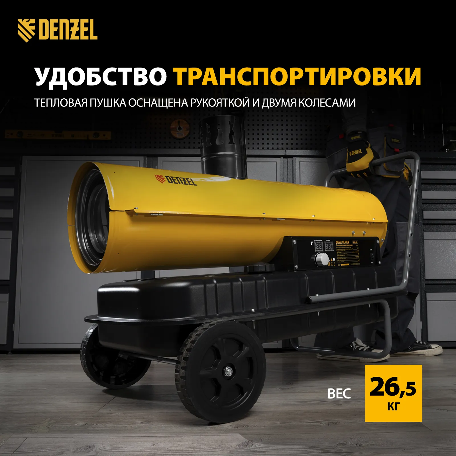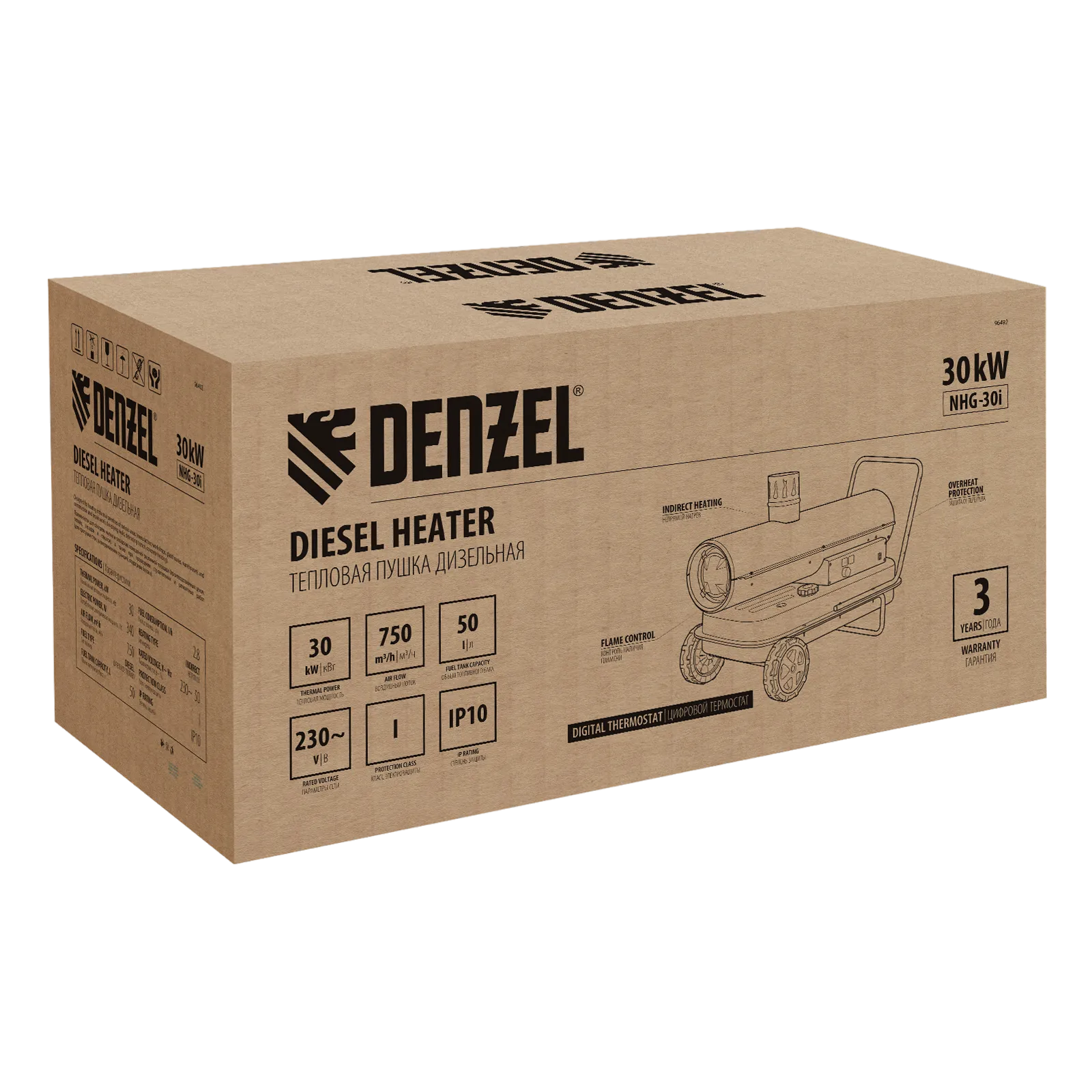 Дизельная тепловая пушка непрямого нагрева DENZEL NHG-30i 96492 с цифровым термостатом обладает тепловой мощностью 30 кВт и генерирует поток теплого воздуха 750 м3/ч. Предназначена для обогрева шатров, палаток, складов, а также технических помещений, ангаров, теплиц и строительных объектов. В работе пушки используется схема непрямого нагрева: при помощи отводного патрубка продукты горения можно полностью вывести за пределы помещения. Такое решение позволяет использовать устройство в присутствии людей.