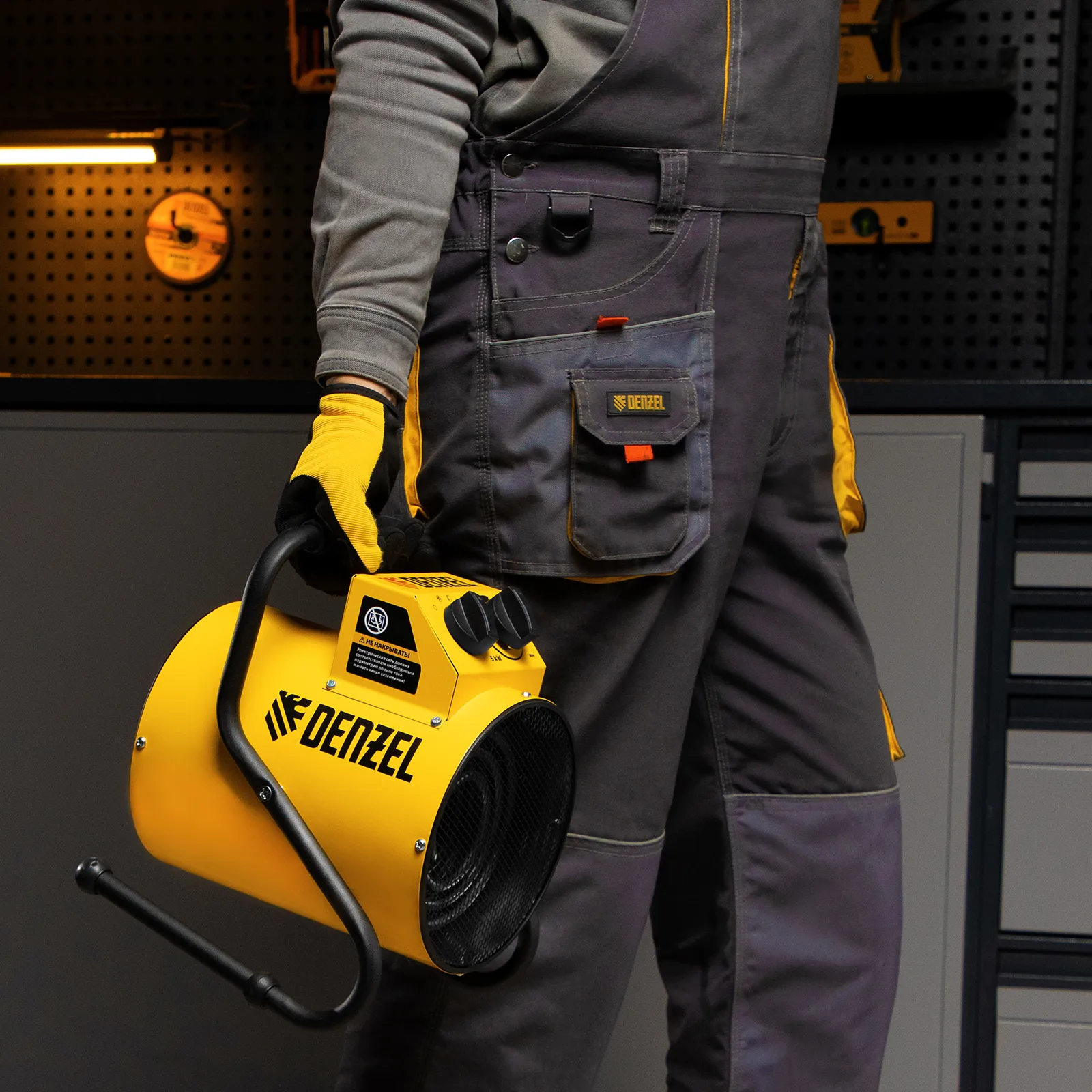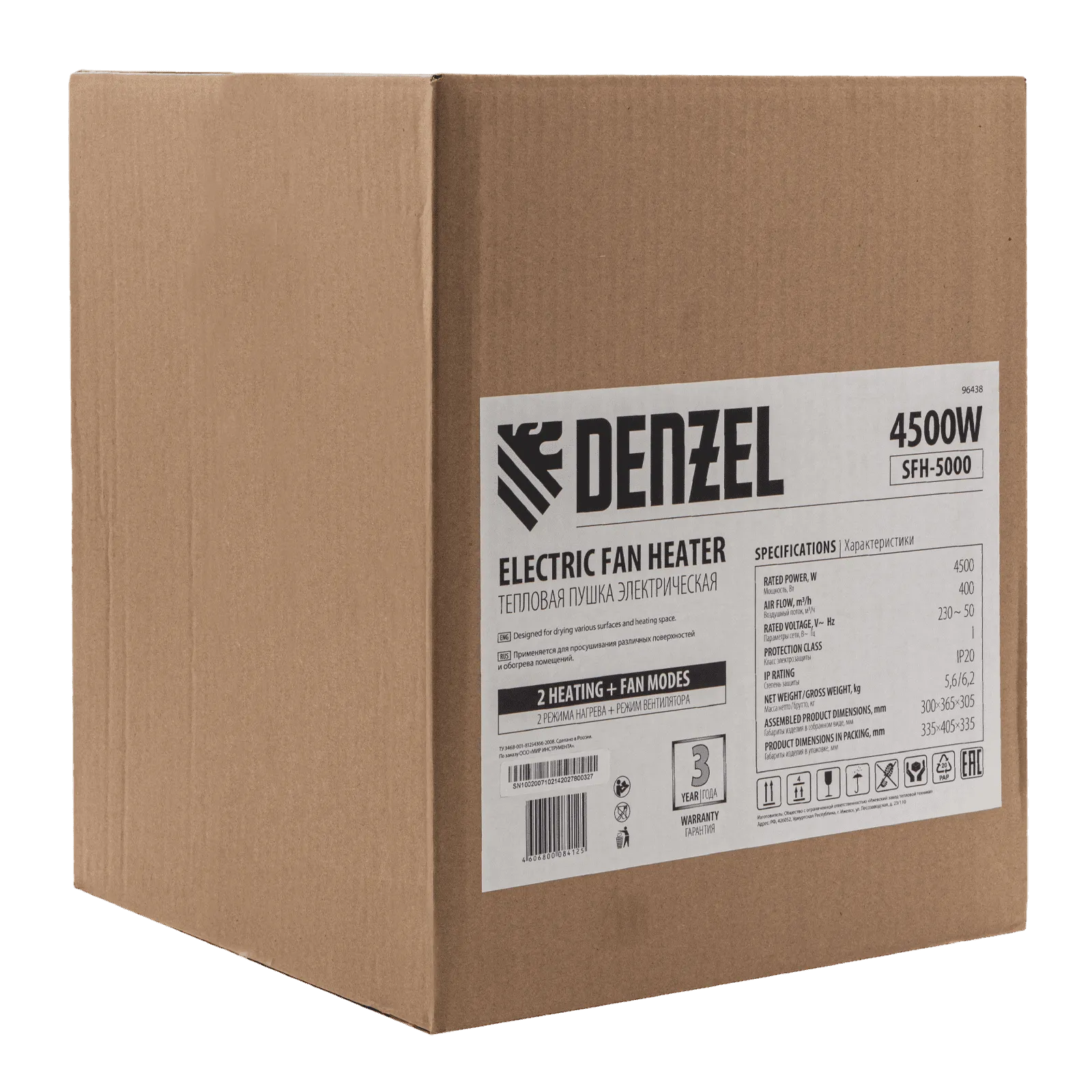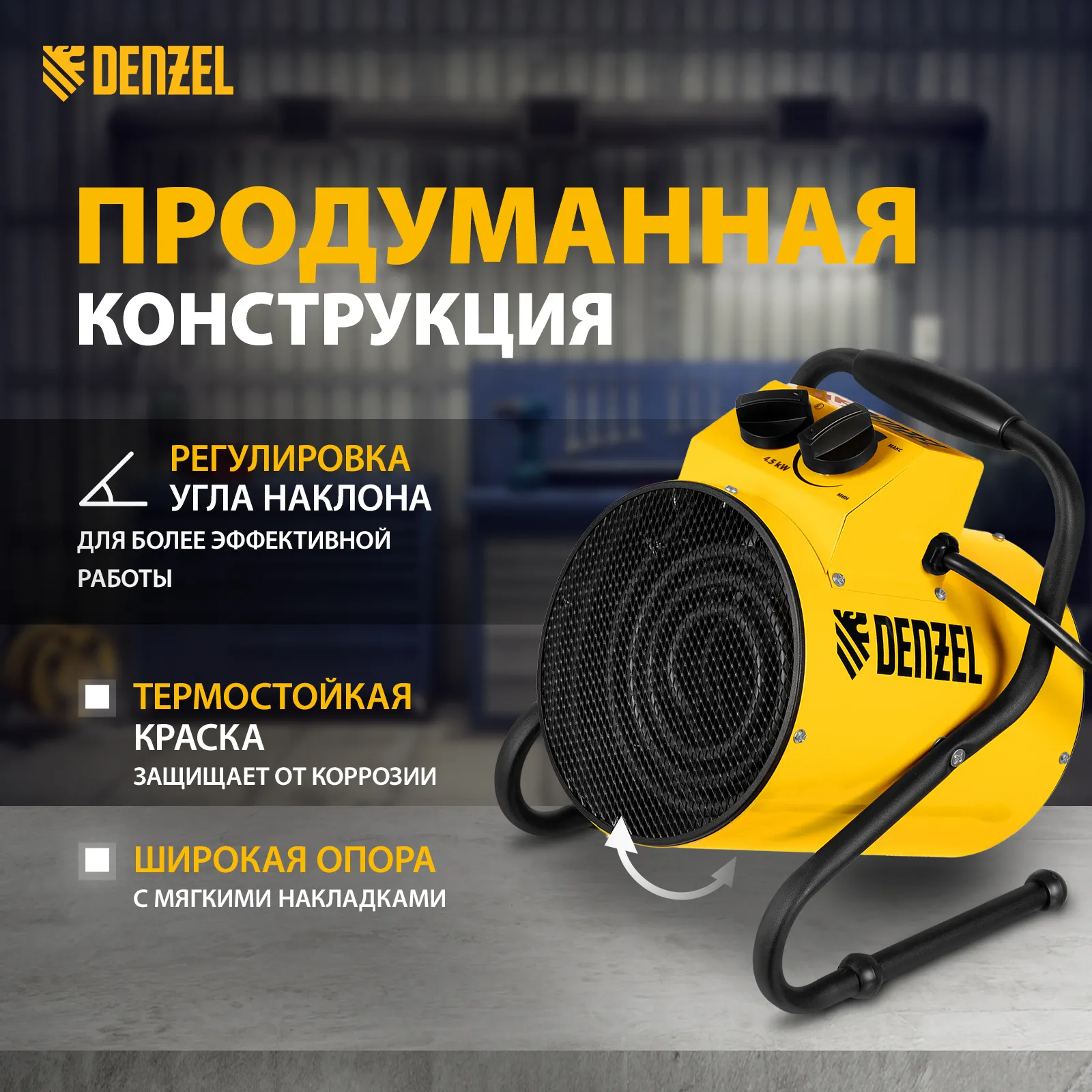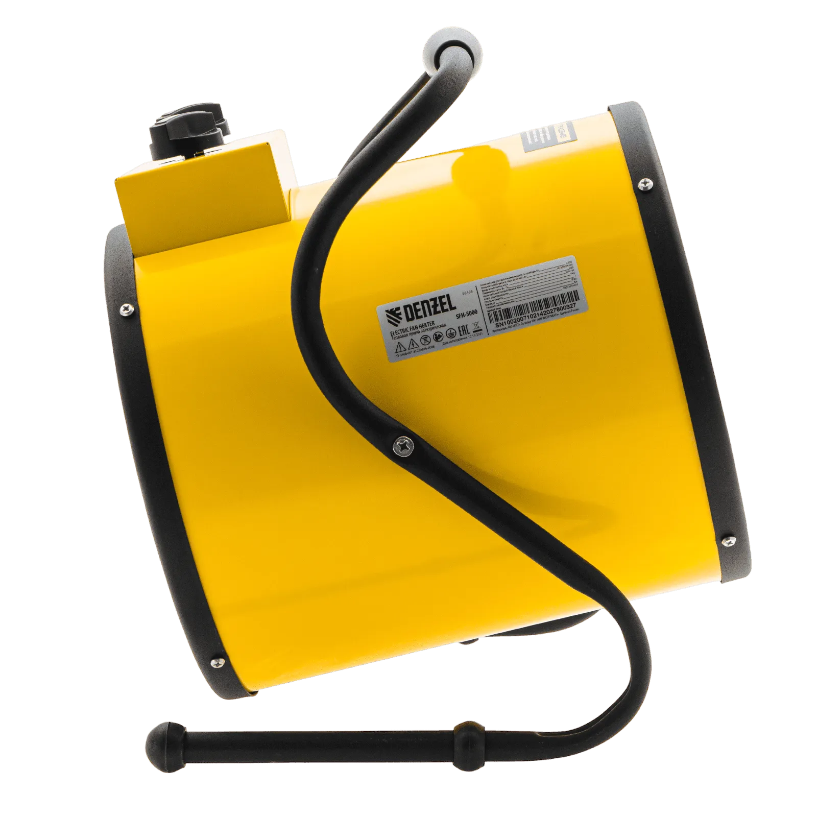 Тепловая пушка профессиональной серии Denzel SFH-5000 96438 питается от сети 230 В и генерирует воздушный поток мощностью 260 м³/ч. Работает в одном из 3 режимов: вентилятор, обогрев на мощности 2250 и обогрев на мощности 4500 Вт. Используется в складских, производственных, общественных помещениях площадью до 45 м². Подходит для дистанционной просушки поверхностей, например, окрашенных или оштукатуренных стен во время отделочных работ.