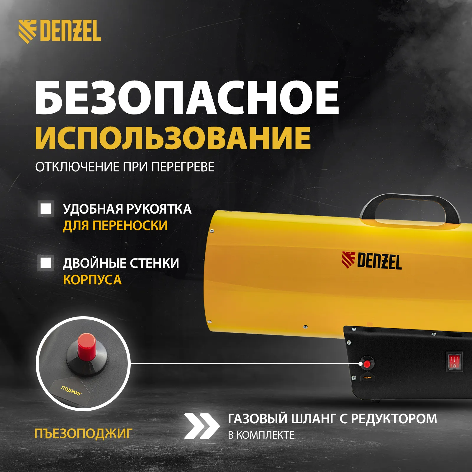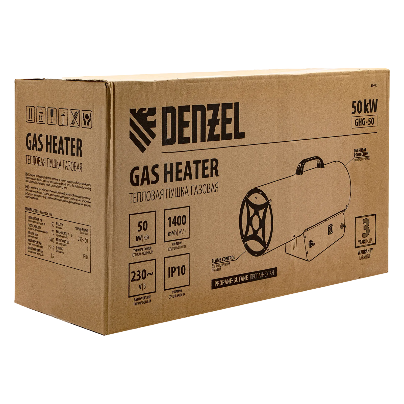Газовая тепловая пушка Denzel GHG-50 96480 мощностью 50 кВт работает на смеси пропан-бутан и выдает тепловой поток со скоростью 1400 м³/ч. Используется для обогрева складов, цехов, гаражей, теплиц и других нежилых помещений площадью до 500 м². Будет полезна на строительных площадках и в производственных помещениях.