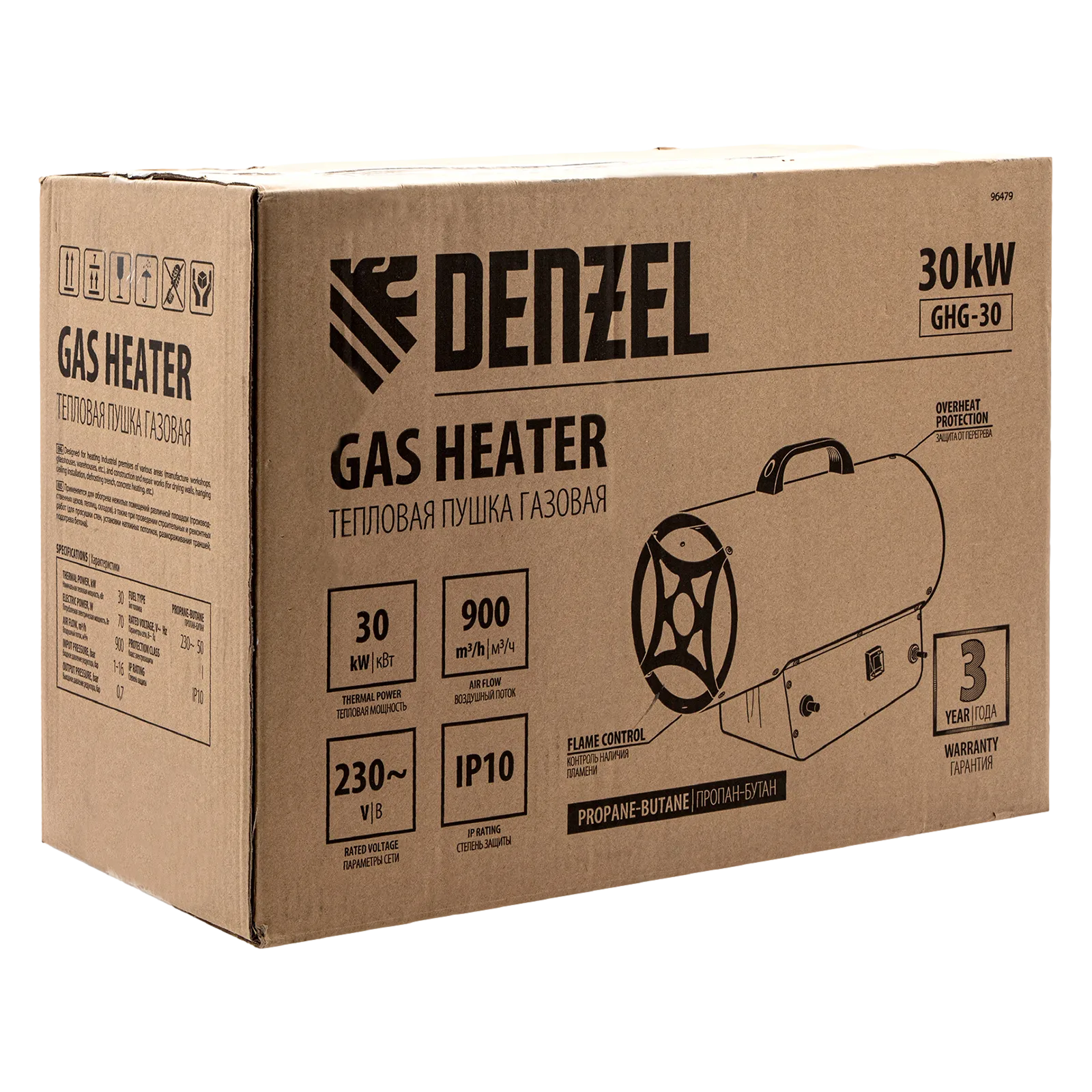 Газовая тепловая пушка Denzel GHG-30 96479 мощностью 30 кВт работает на смеси пропан-бутан и выдает тепловой поток со скоростью 900 м³/ч. Используется для обогрева складов, цехов, гаражей, теплиц и других нежилых помещений площадью до 300 м². Будет полезна на строительных площадках и в производственных помещениях.