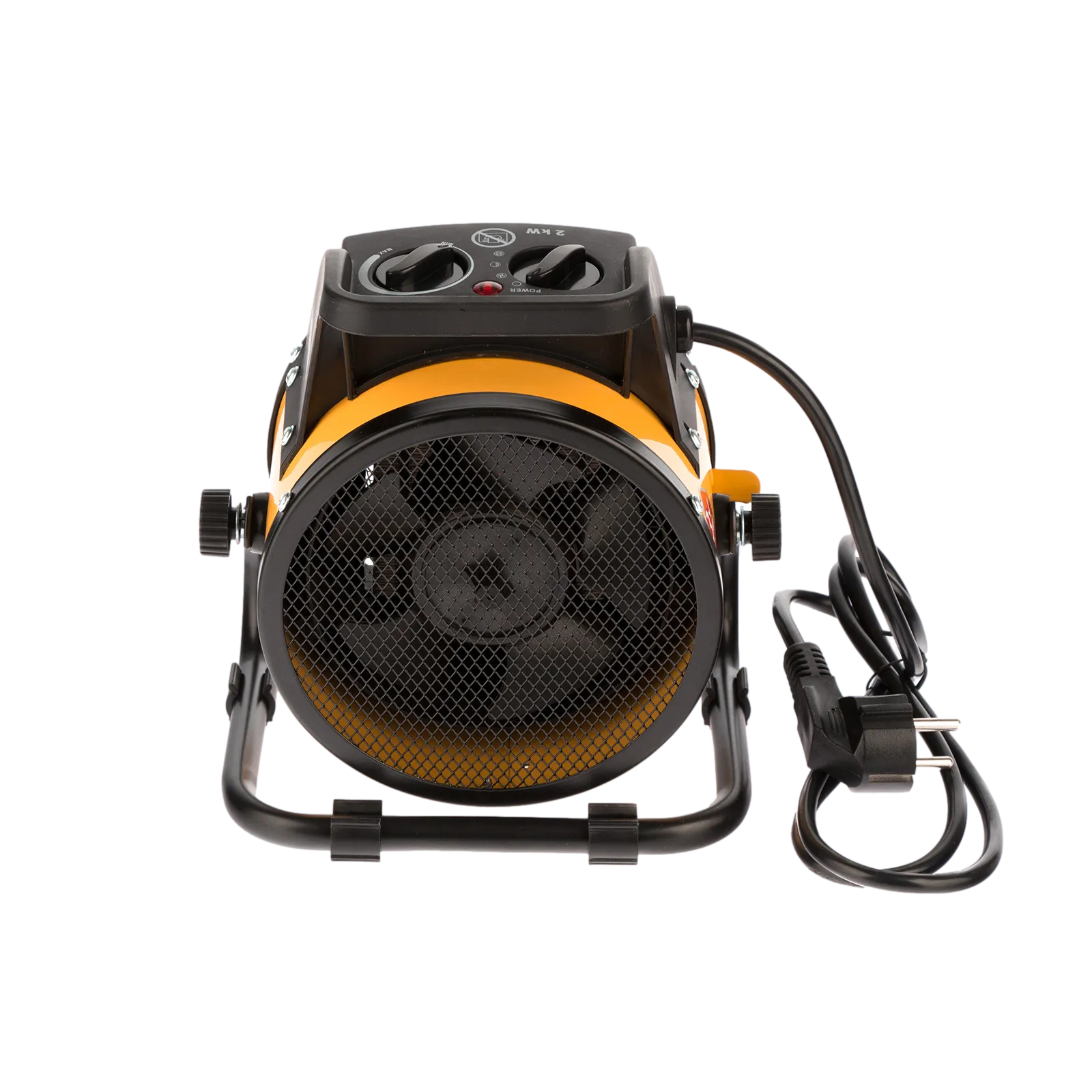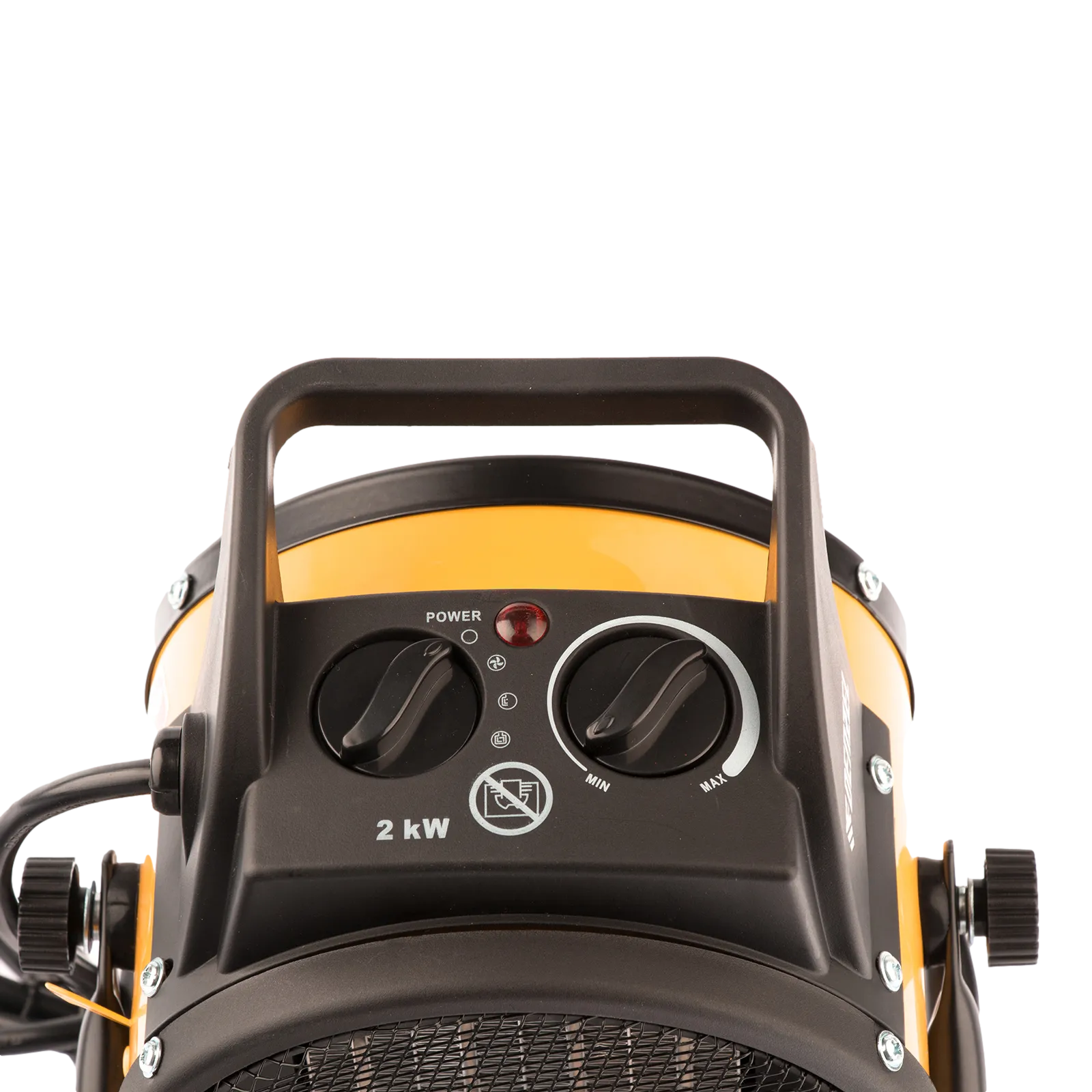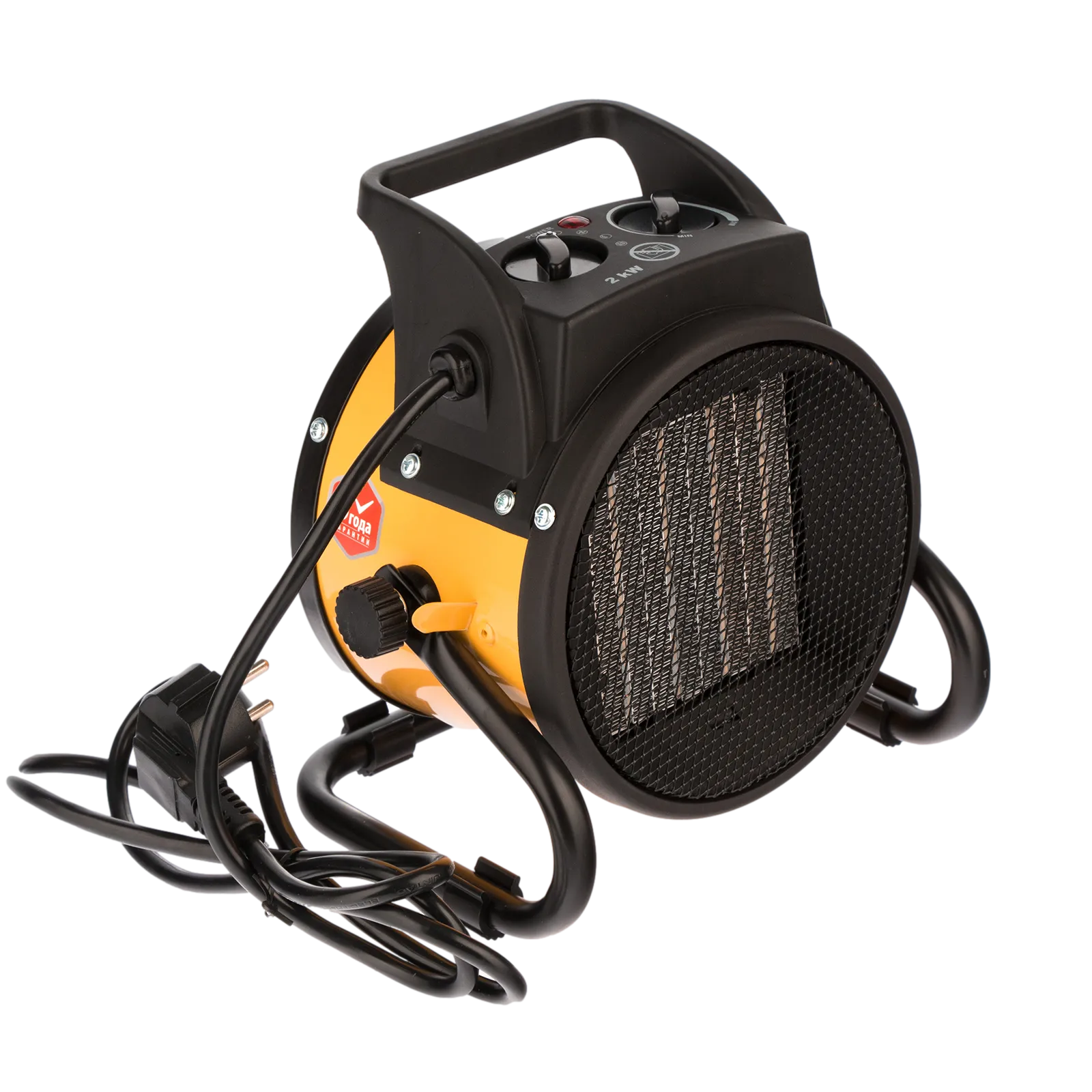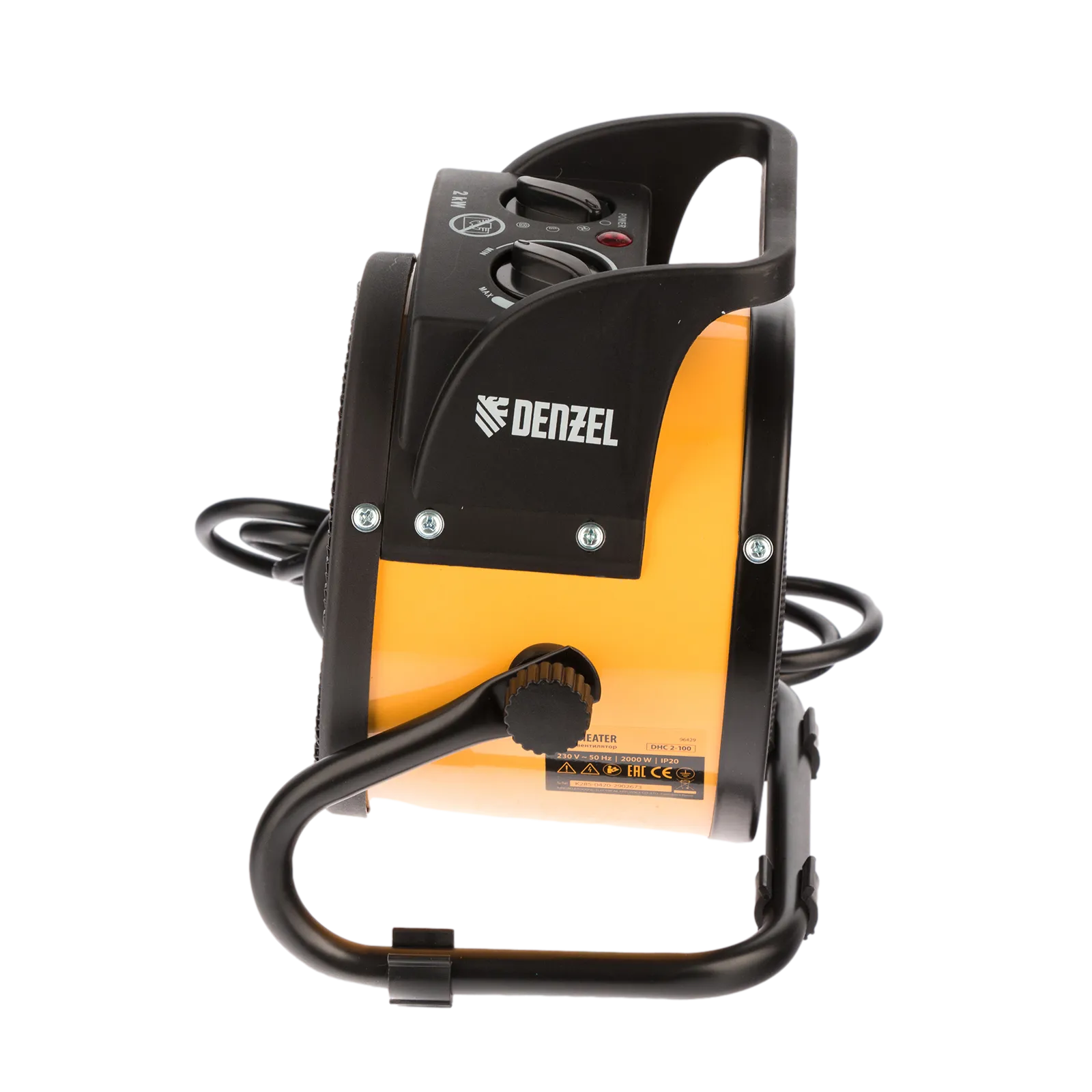 Тепловая пушка Denzel DHC 2-100 96429 работает на мощности 0,025, 1 или 2 кВт. Пригодится в любую погоду: в холод обогреет помещение, а в жару может использоваться в качестве вентилятора. Также тепловентилятор применяется для просушки поверхностей — окрашенных и оштукатуренных стен, стяжек. Максимальной мощности 2 кВт хватит для обогрева помещения площадью до 20 м². Работа пушки не доставляет дискомфорт, безопасна для здоровья людей и животных, поскольку керамический нагревательный элемент не сушит воздух и не выделяет вредных веществ.