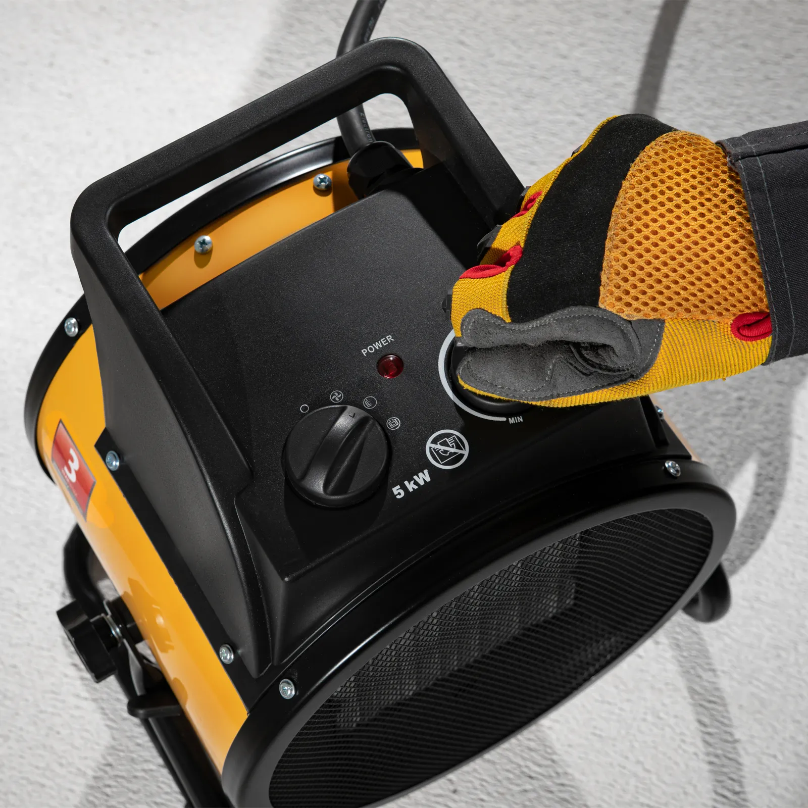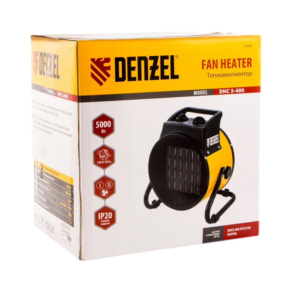 Тепловая пушка (тепловентилятор) Denzel DHC 5-400 96428 с керамическим нагревательным элементом работает на мощности 0,04/3/5 кВт. Пригодится в любую погоду: в холод обогреет помещение, в теплое время года может использоваться как вентилятор. Также пушка применяется во время отделочных работ для просушки поверхностей — окрашенных и оштукатуренных стен, стяжек и т.д. Максимальной мощности 5 кВт хватит для обогрева помещения площадью до 50 кв.м. Работа тепловентилятора не доставляет дискомфорт, безопасна для здоровья людей и животных, поскольку керамический нагревательный элемент не сушит воздух и не выделяет вредных веществ.;Внимание! Тепловая пушка поставляется с установленным кабелем питания и силовой вилкой 230 В / 32 А, для подключения используется силовая розетка 230 В / 32 А (обычные бытовые розетки не рассчитаны на мощность 5 кВт).