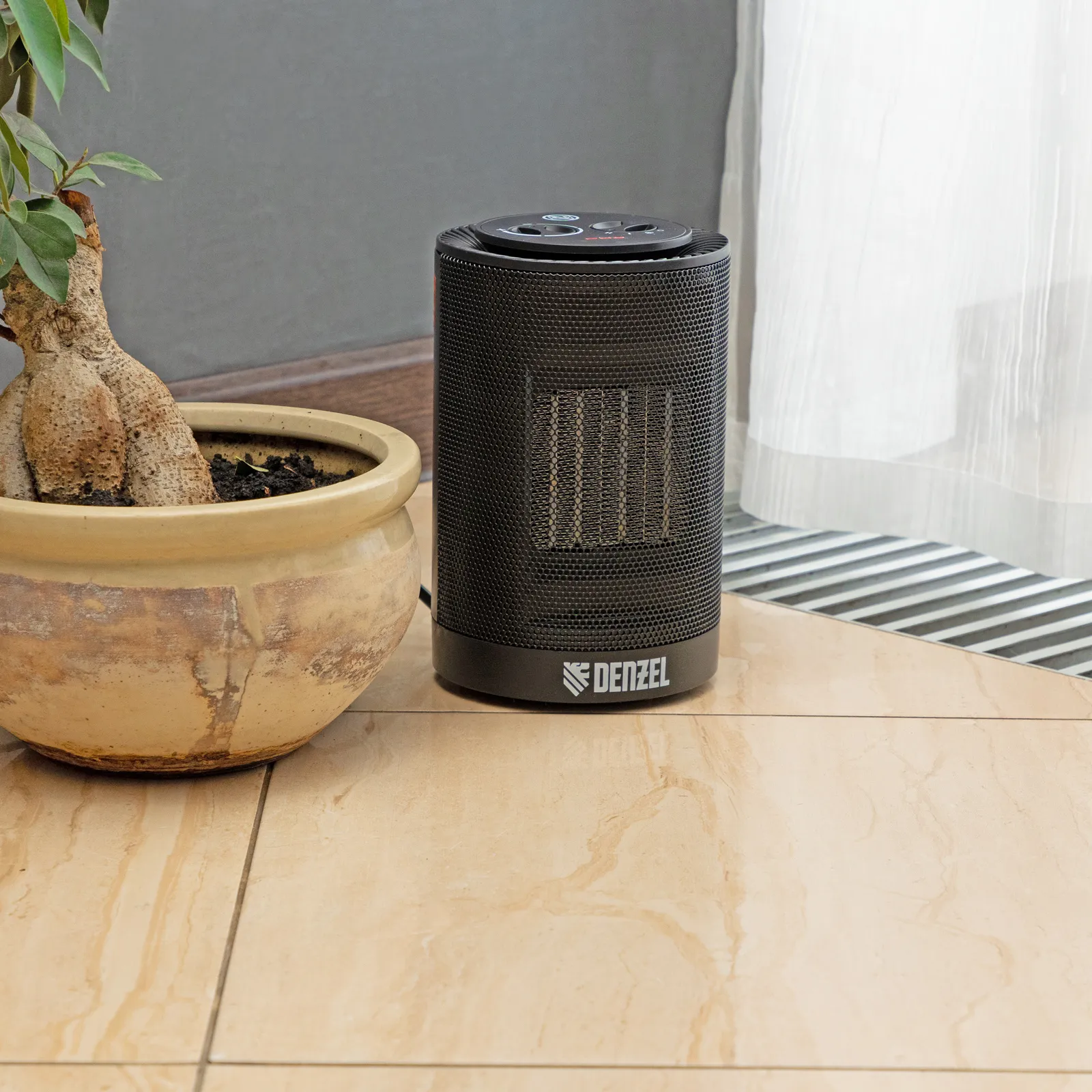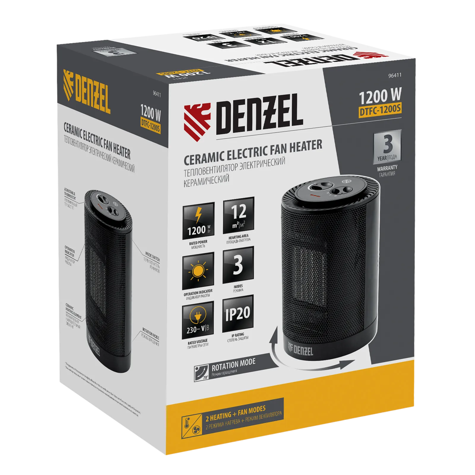 Тепловентилятор Denzel DTFC-1200S с керамическим нагревательным элементом и функцией вращения работает в 1 из 3 режимов: вентиляция, нагрев на мощности 600 Вт и нагрев на мощности 1200 Вт. Равномерно прогревает окружающее пространство благодаря функции осцилляции (вращения). Создает комфортный микроклимат, поскольку не сжигает пыль и не пересушивает воздух. Предназначен для обогрева помещений площадью до 12 м2, используется в бытовых целях.
