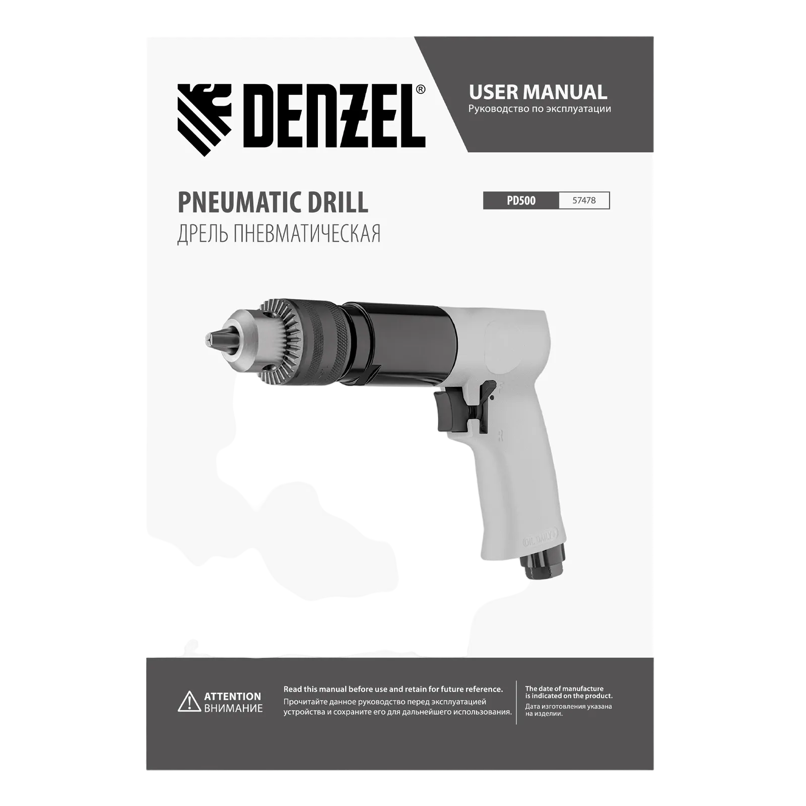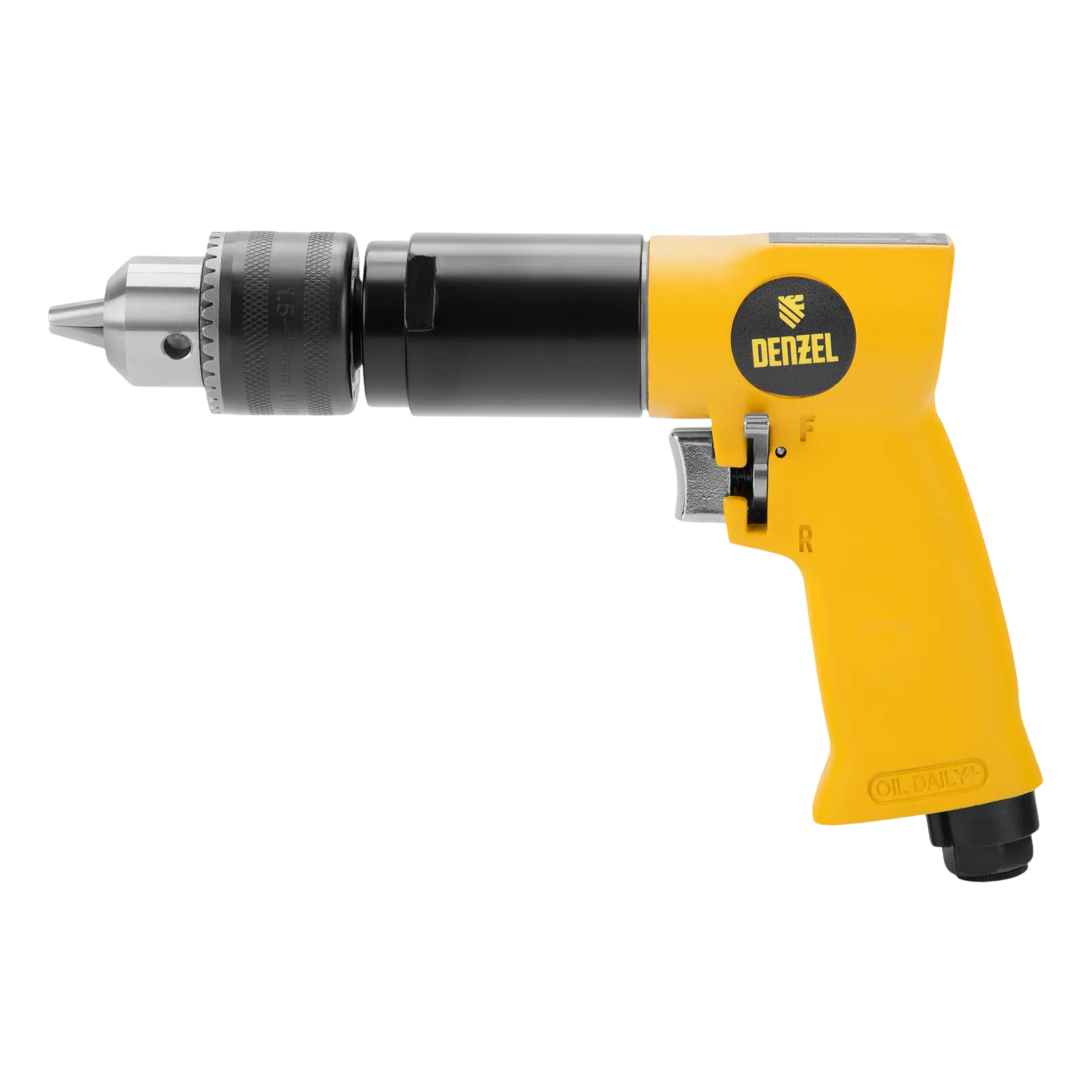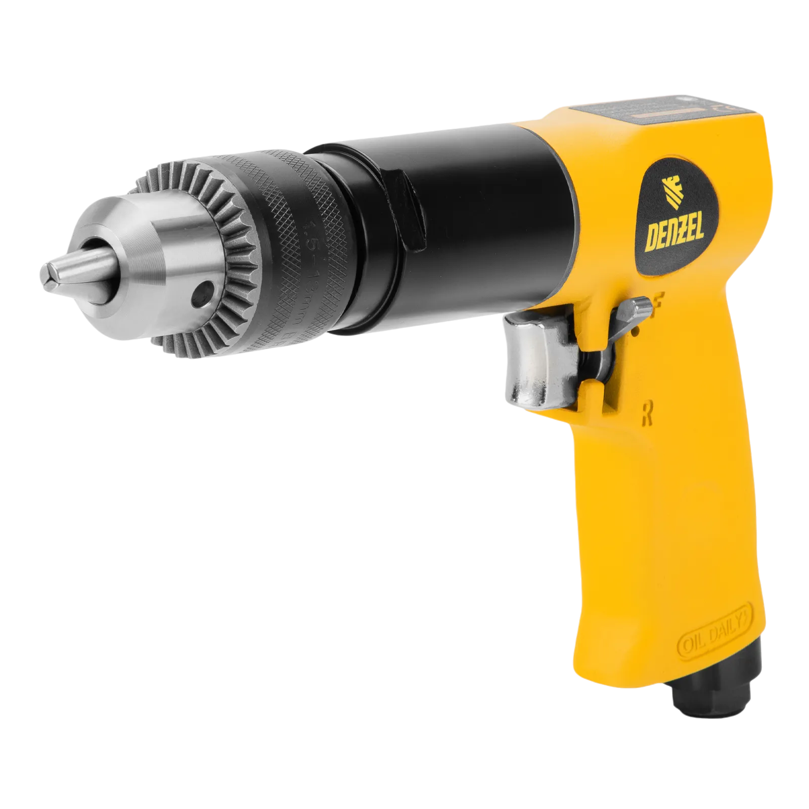 Пневматическая дрель Denzel PD500 57478 с ключевым патроном 1,5-13 мм работает со скоростью 500 об/мин при среднем расходе сжатого воздуха 114 л/мин. Используется для сверления отверстий в древесине, металле и пластике, закручивания и откручивания резьбовых крепёжных элементов. Дрель может применяться в строительстве, монтажных работах, ремонте и обслуживании автомобилей, на малых производствах и в домашних мастерских.;Инструмент предназначен для работы под давлением 6,3 бар, расход воздуха не превышает 200 л/мин, поэтому в качестве источника сжатого воздуха подойдет компрессор средней мощности. Во время работы не забывайте использовать специальное масло ISO 46, которое можно добавлять как напрямую в инструмент, так и с помощью блока подготовки воздуха Denzel 57469, включающего в себя лубрикатор для автоматической подачи масла.