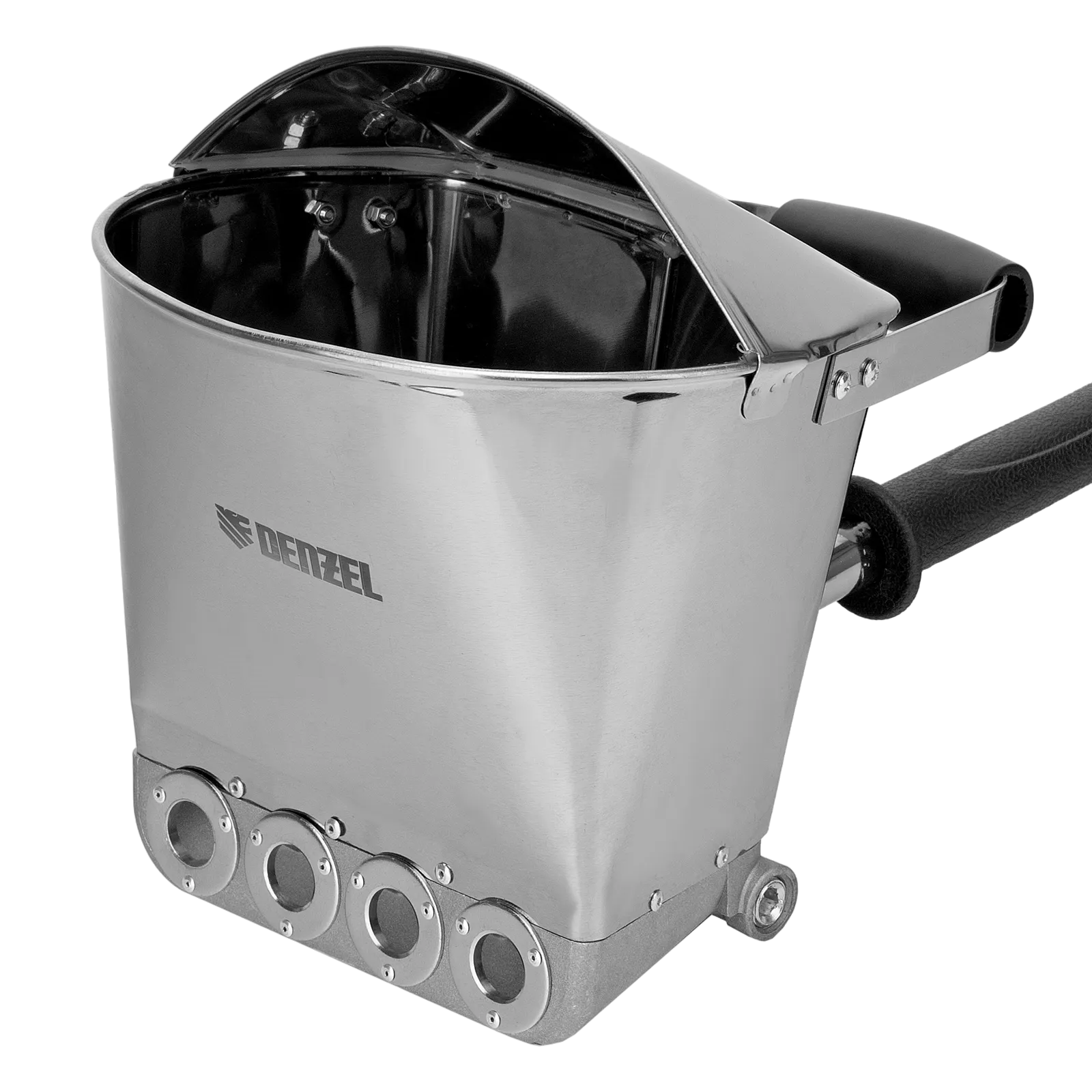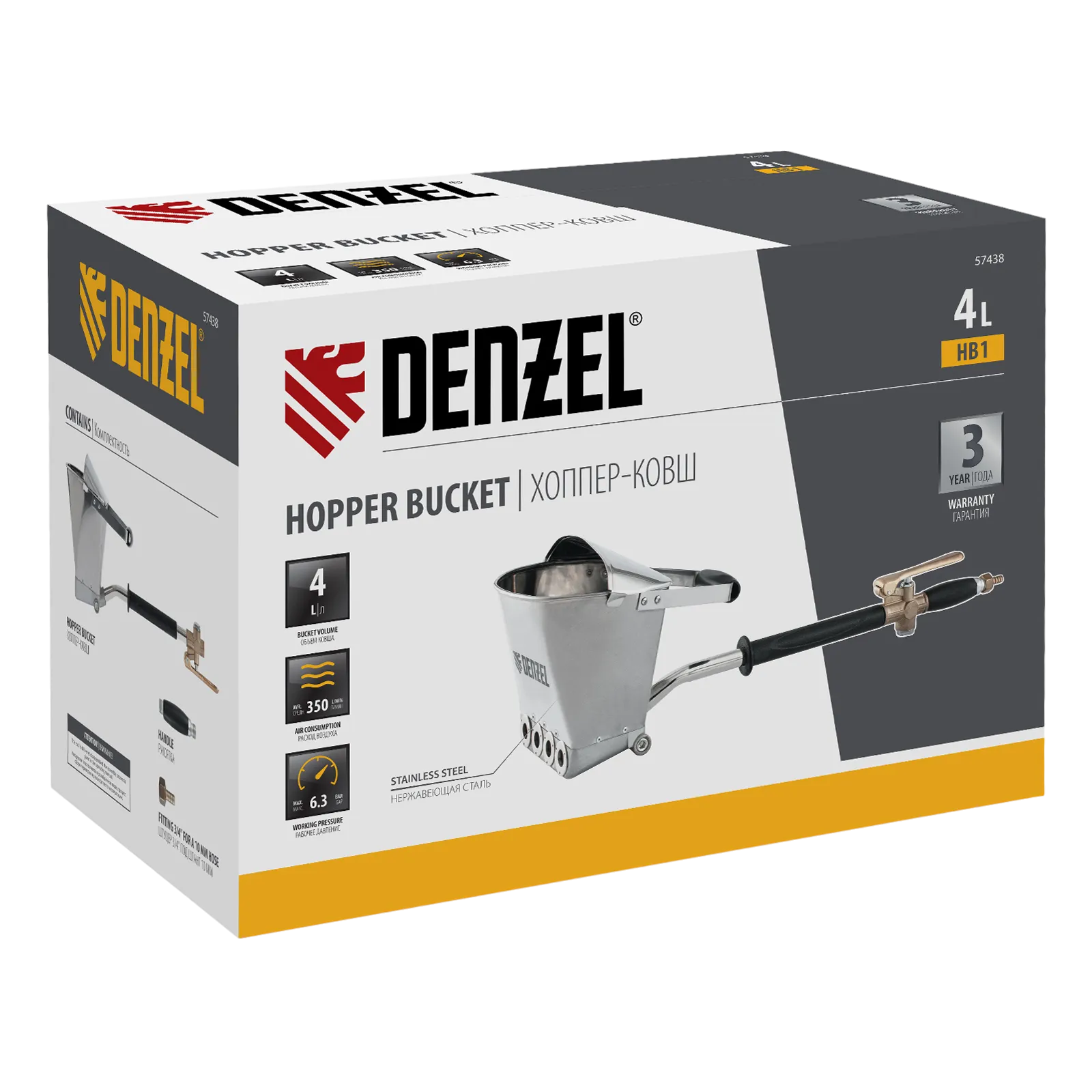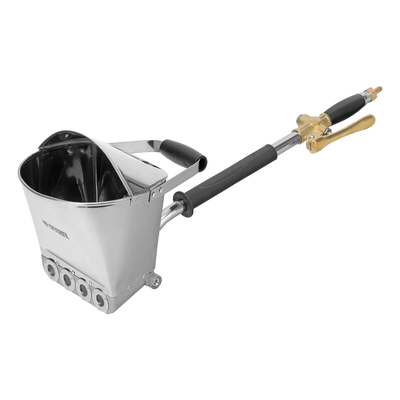 Хоппер-ковш Denzel HB1 57438 емкостью 4 л подключается к компрессору при помощи шланга с внутренним диаметром 10 мм и расходует 350 л сжатого воздуха в минуту. Используется для нанесения штукатурных растворов, позволяя ускорить выполнение отделочных работ и повысить их качество. 4 больших выходных сопла обеспечивают эффективное решение поставленных задач. Инструмент пригодится на строительной площадке.