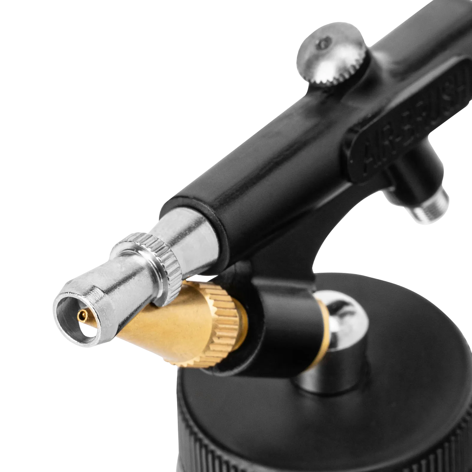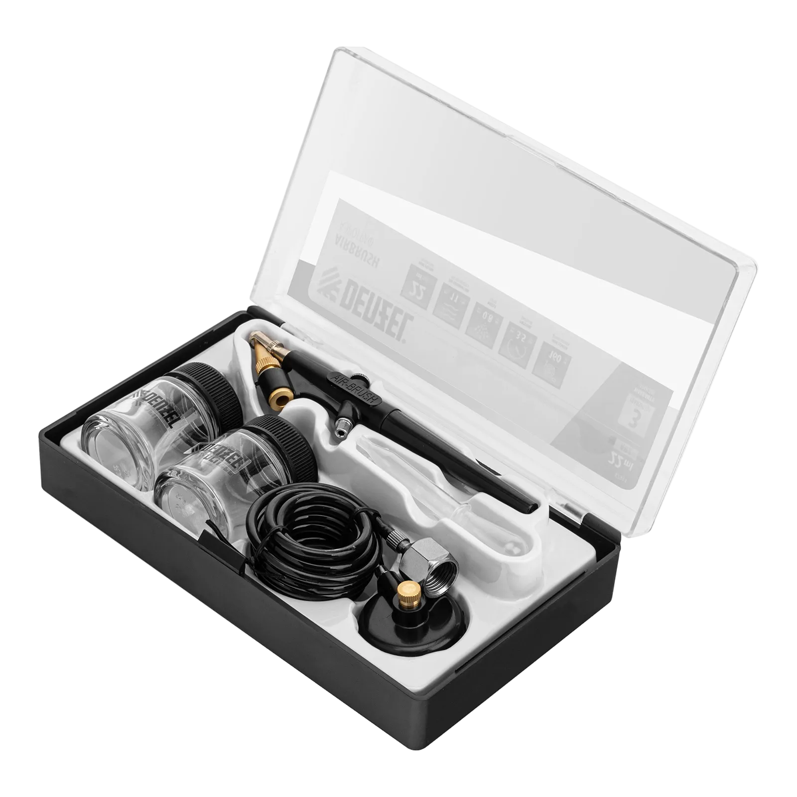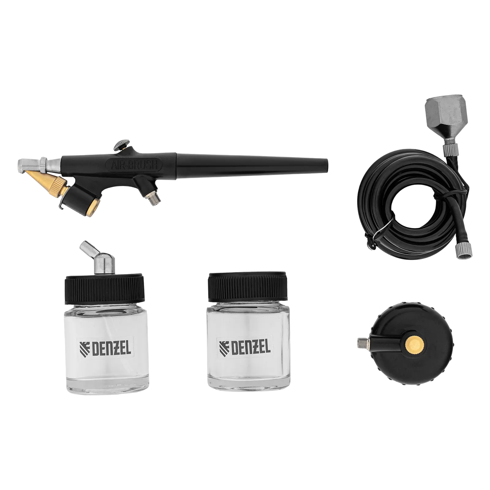 - Продуманная комплектация — аэрограф поставляется с дополнительным бачком, крышкой-переходником и дозатором для краски.