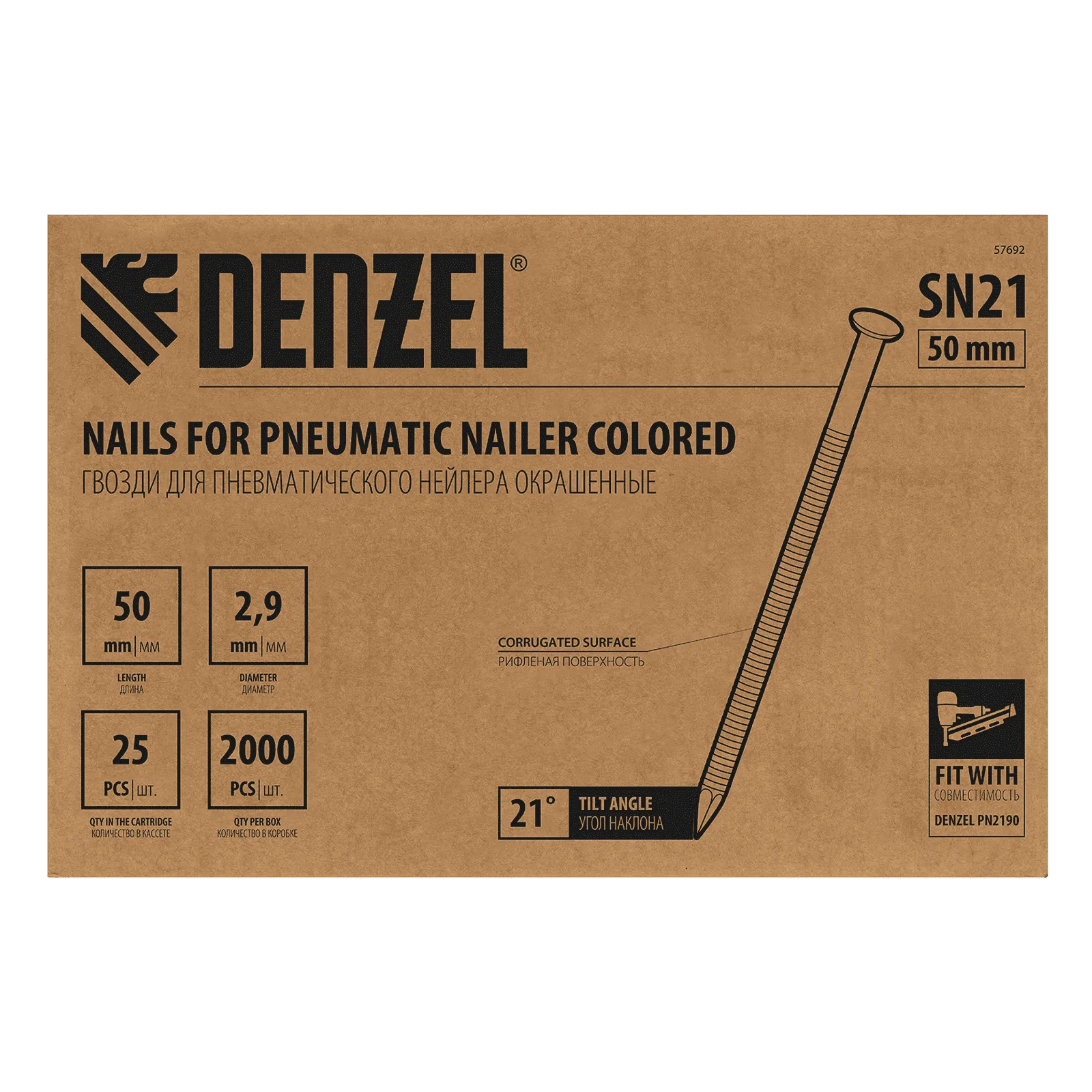 Гвозди Denzel 57692 типа SN21, длиной 50 мм и диаметром 2,9 мм, с крашеной поверхностью, 2000 шт. в упаковке, — расходники для пневматического нейлера. Используются для скрепления различных материалов, будут полезны во время сборочных и отделочных работ.