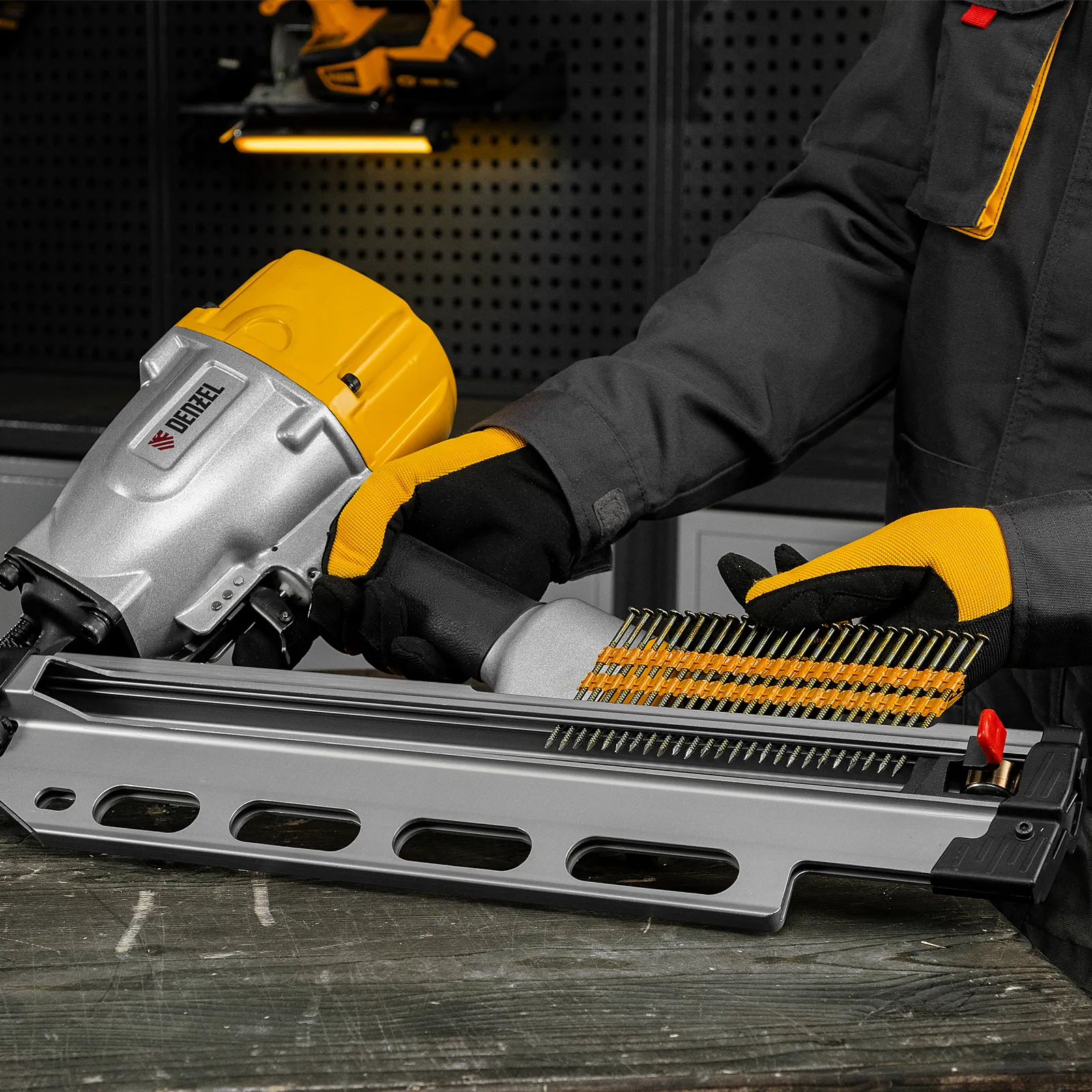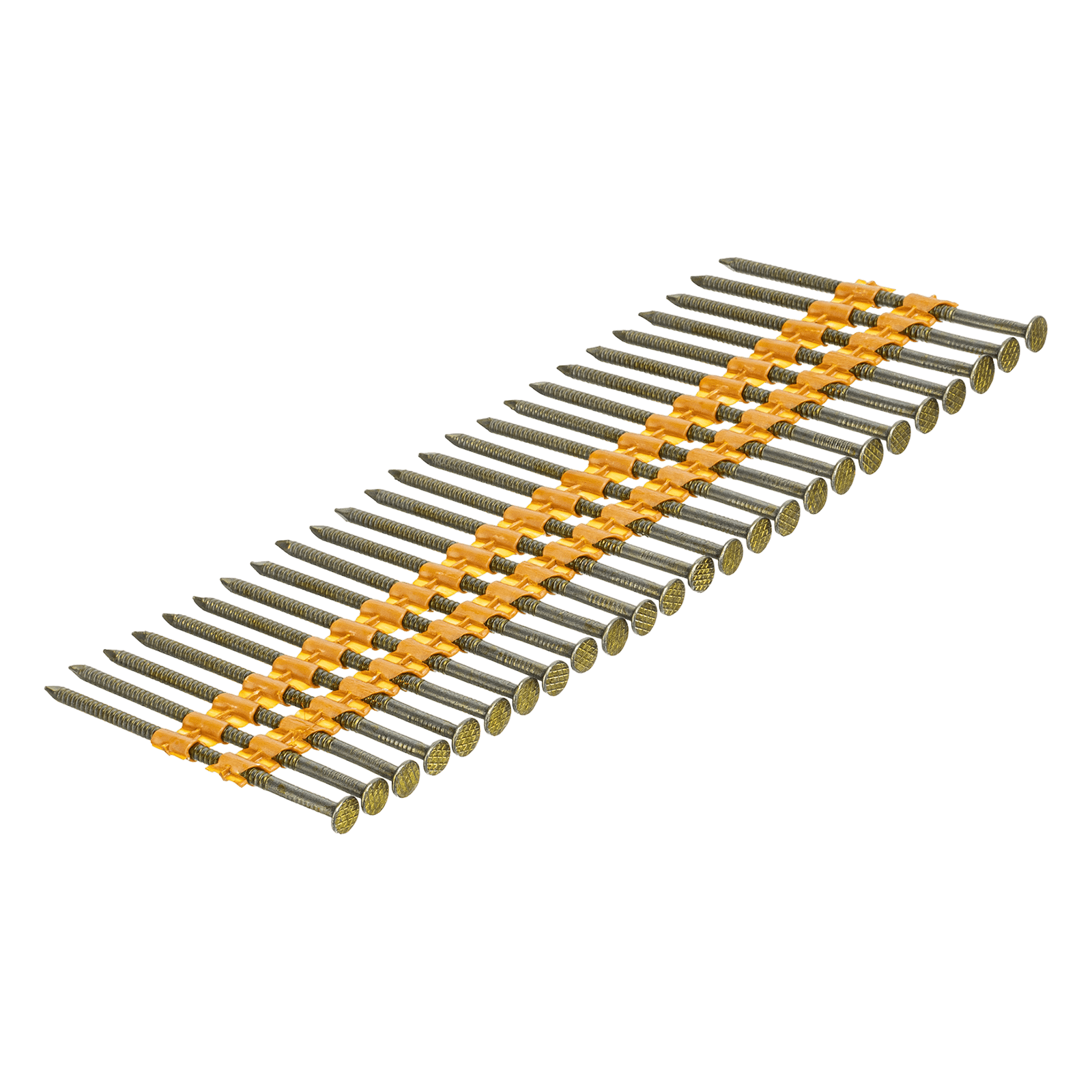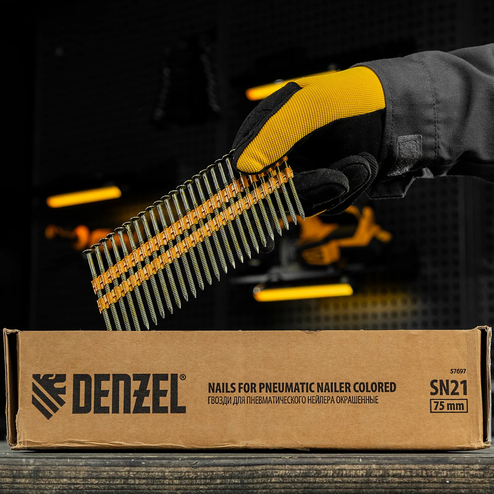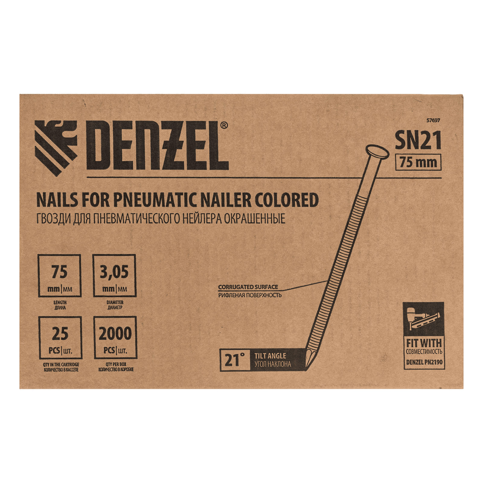 Гвозди Denzel 57697 типа SN21, длиной 75 мм и диаметром 3,05 мм, с крашеной поверхностью, 2000 шт. в упаковке, — расходники для пневматического нейлера. Используются для скрепления различных материалов, будут полезны во время сборочных и отделочных работ.