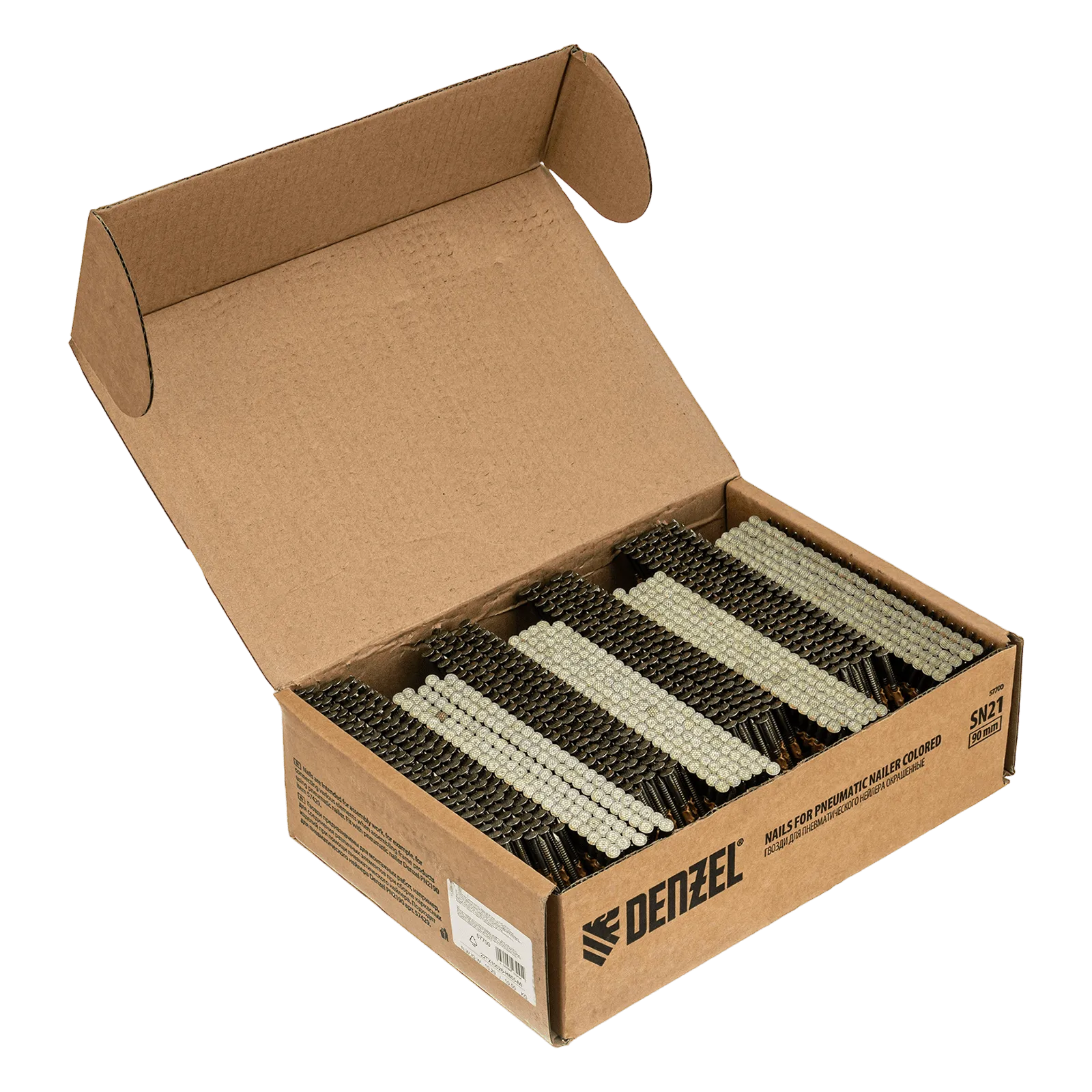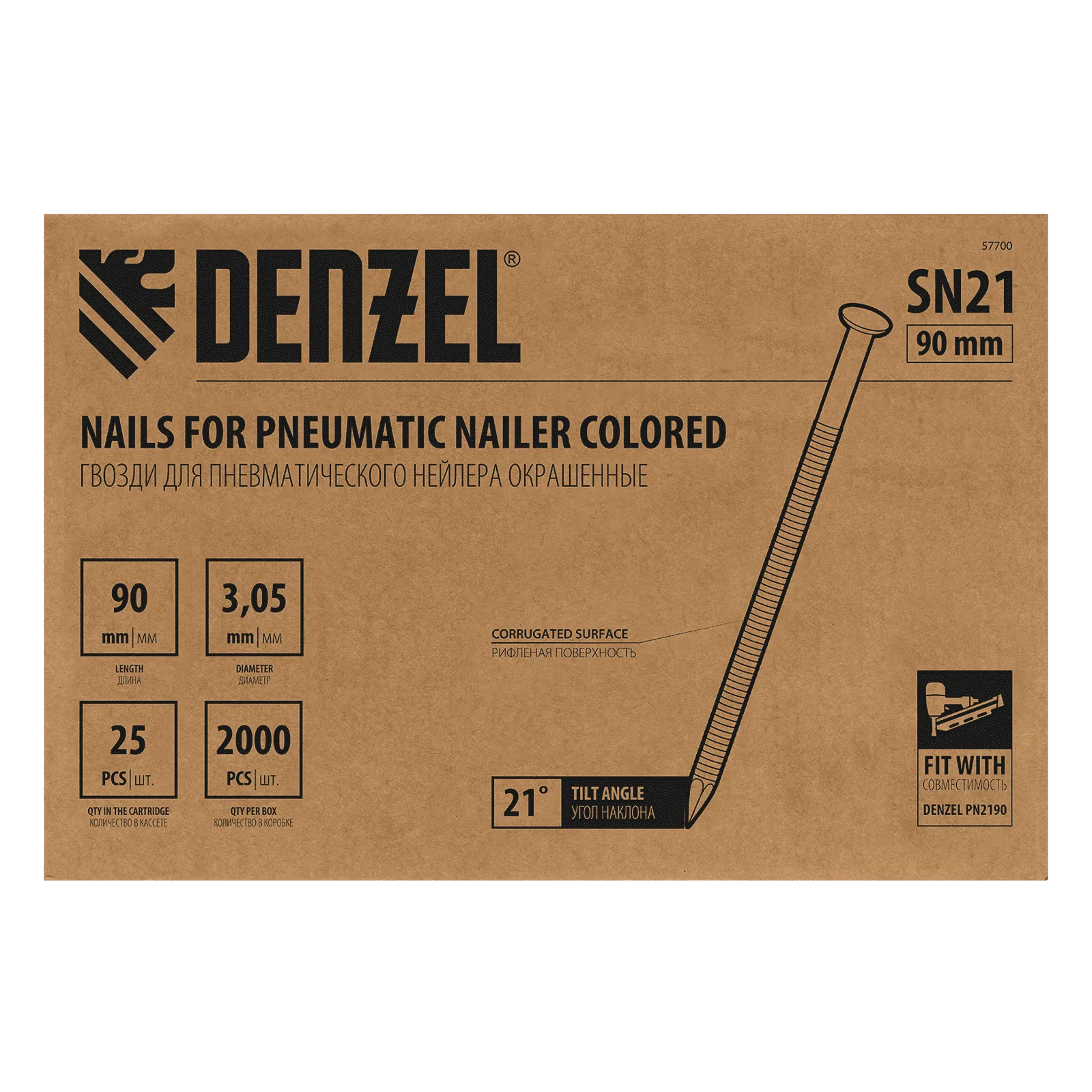 Гвозди Denzel 57700 типа SN21, длиной 90 мм и диаметром 3,05 мм, с крашеной поверхностью, 2000 шт. в упаковке, — расходники для пневматического нейлера. Используются для скрепления различных материалов, будут полезны во время сборочных и отделочных работ.